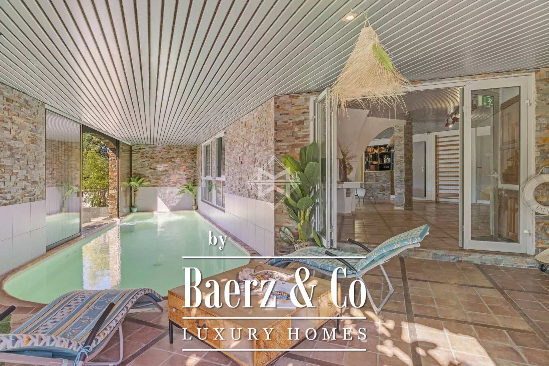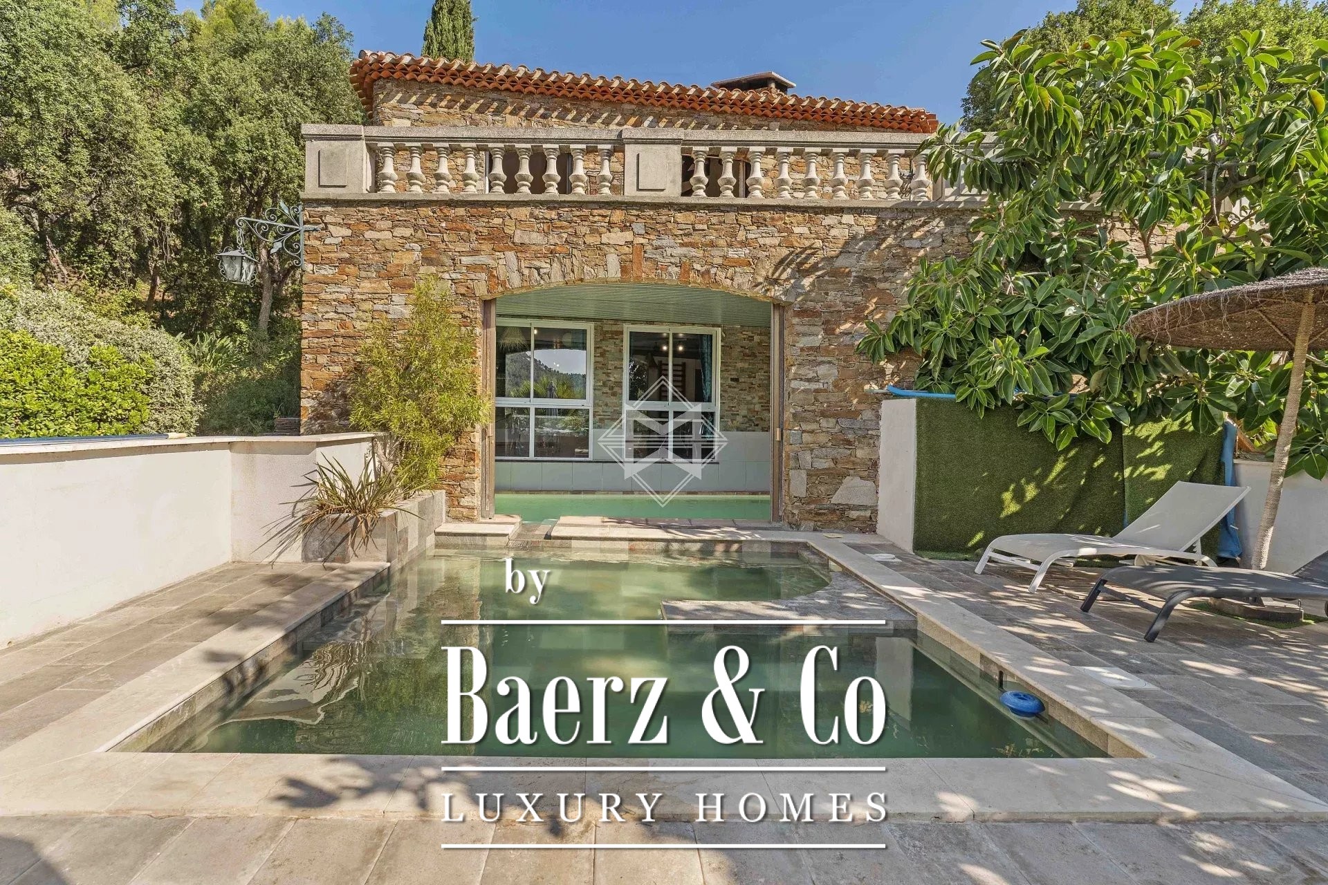 On the lower floor, a reception hall of nearly 100 m² transitions seamlessly to both indoor and outdoor pools, facilitating effortless gatherings and moments of calm. The separate 85 m² guest house extends privacy with three bedrooms, private garden, and its own terrace. The one-hectare plot is both wooded and landscaped, affording unobstructed hills views and enveloping the villa in tranquility. Modern amenities include sliding windows, flyscreens, crawl space, optical fiber, and a condominium garden. This luxury villa for sale in Hyères offers a singular opportunity to inhabit the Bayorre area, where the timeless allure of stone and the serenity of Mediterranean living quietly prevail.