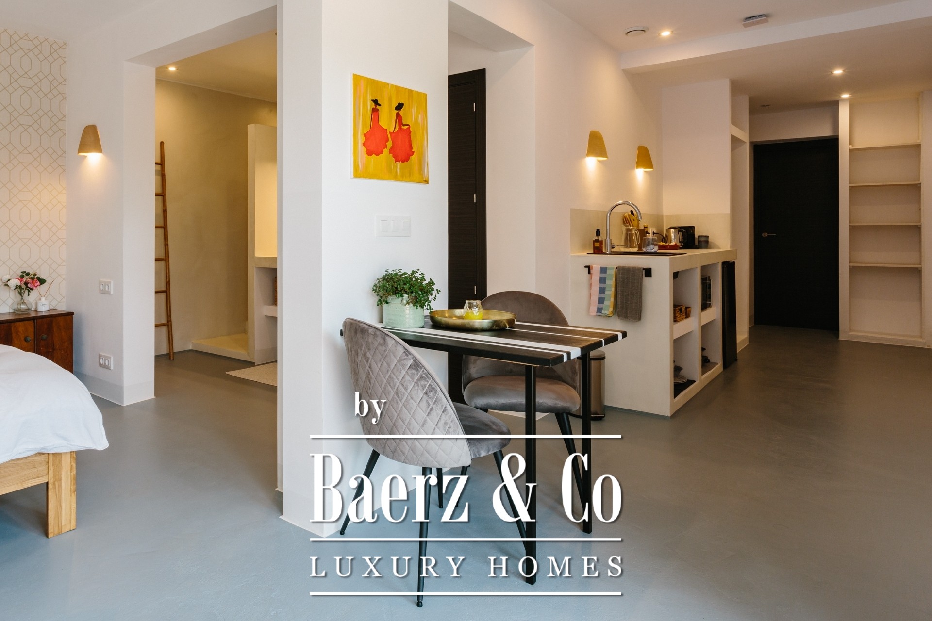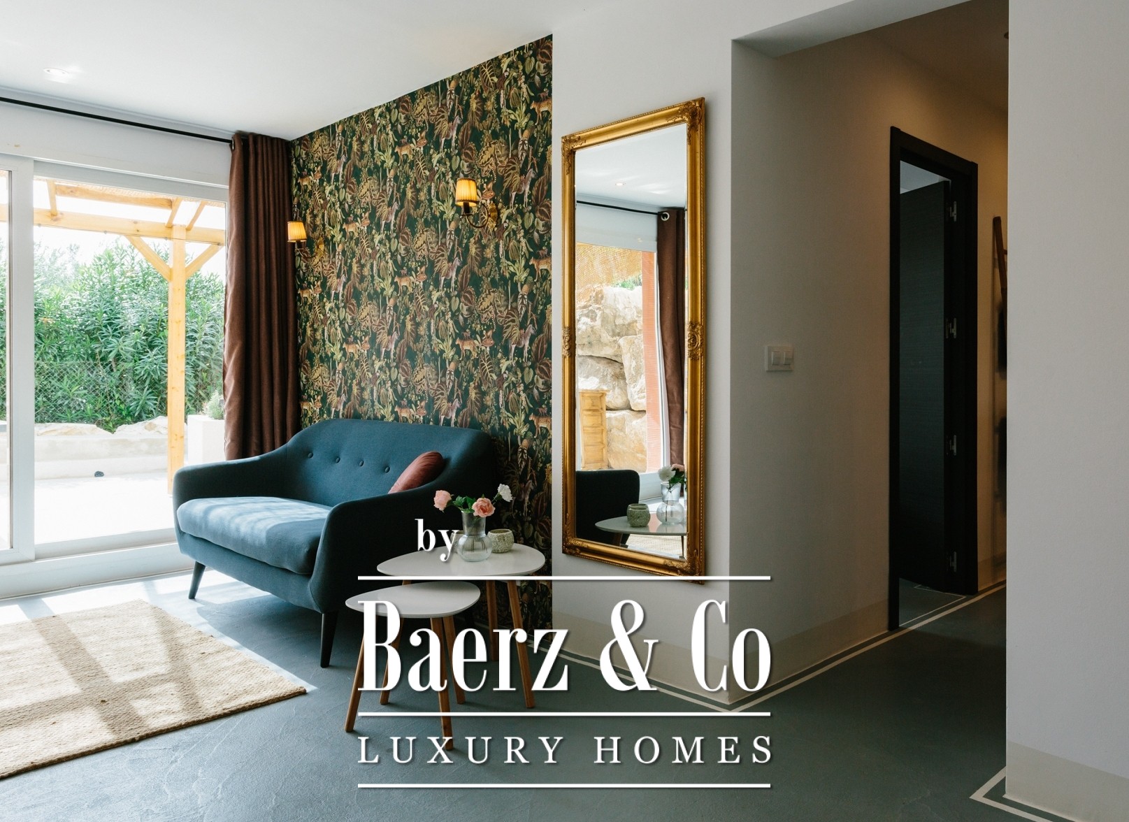 Four independent suite apartments on the ground floor each offer a private entrance, en-suite bathroom, kitchenette, and French doors leading to individual terraces and a landscaped southwest-facing garden, allowing for adaptable living and accommodation flexibility. The design ensures that no neighbouring property overlooks the villa, granting uninterrupted tranquillity.