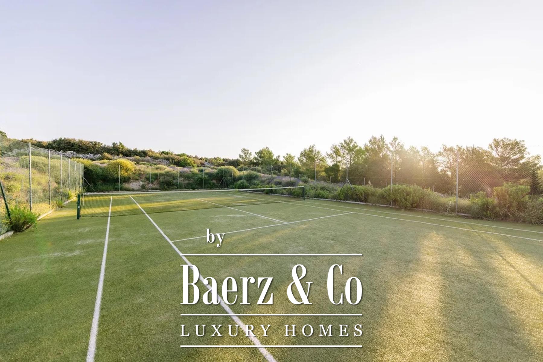 On the grounds, amenities invite an active lifestyle, with tennis and basketball courts, and a network of paths ideal for walking or cycling through vibrant Mediterranean landscapes. Pristine beaches are only fifteen minutes by car, the energetic markets and boutiques of Jelsa just twenty minutes away, and the storied town of Hvar within a thirty-minute drive.
