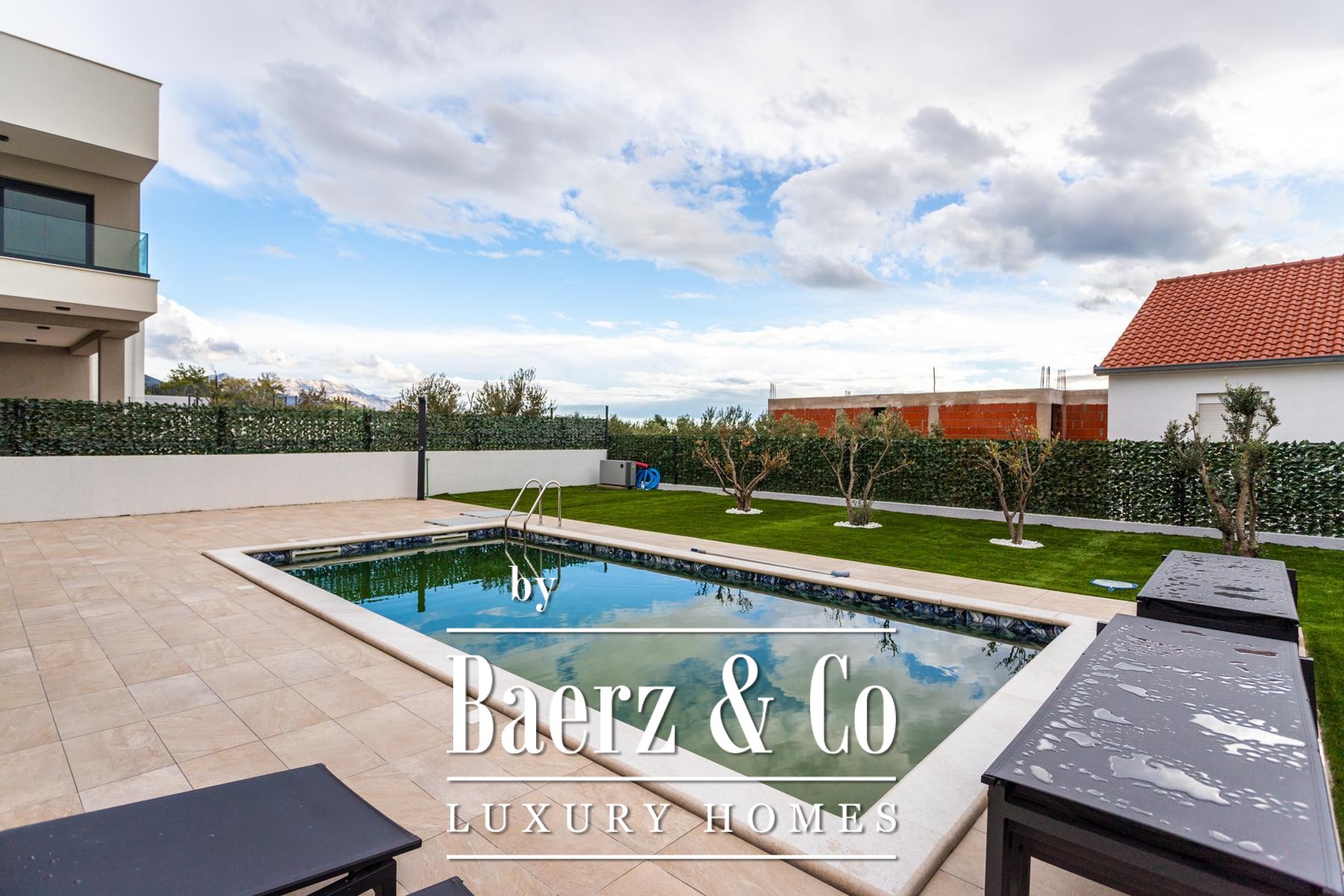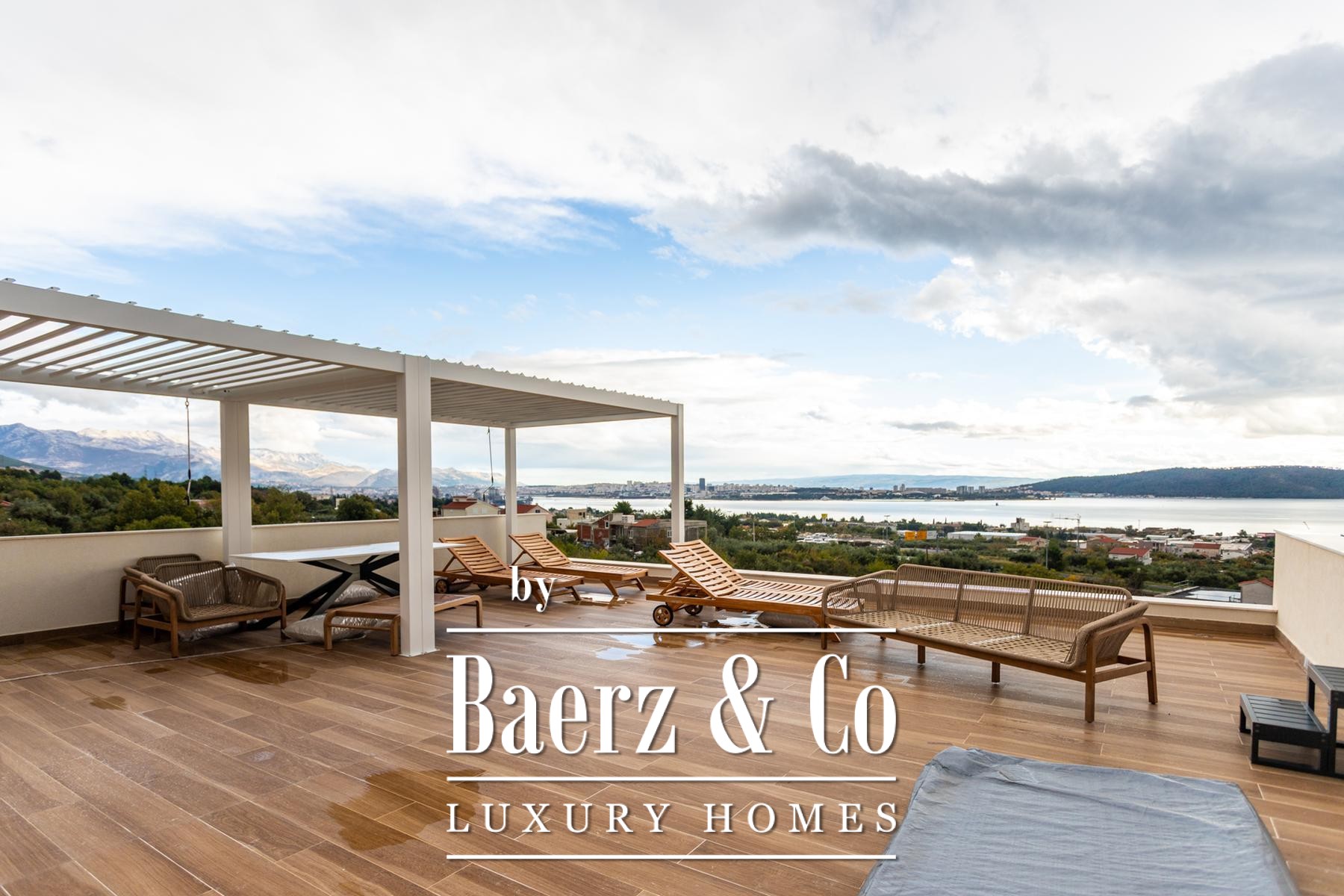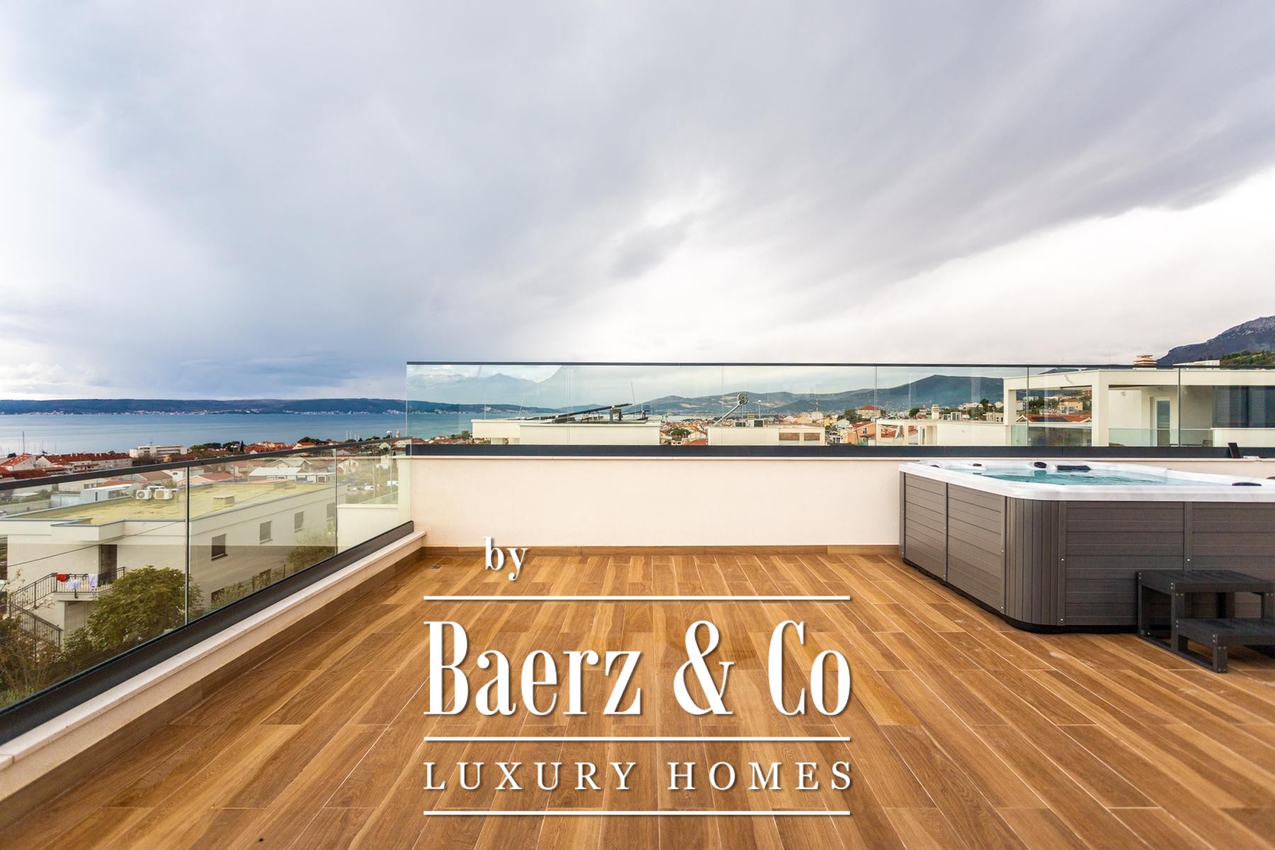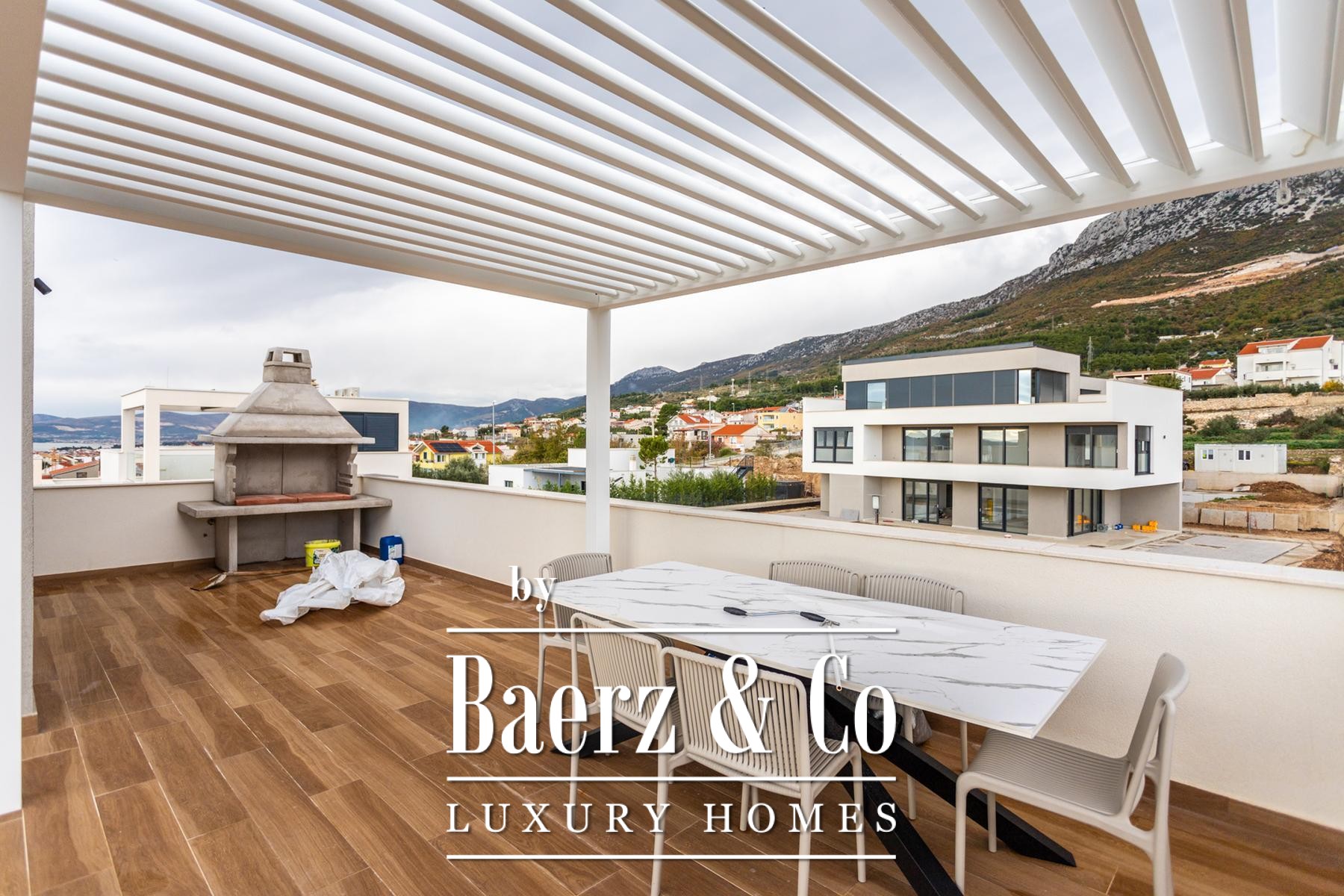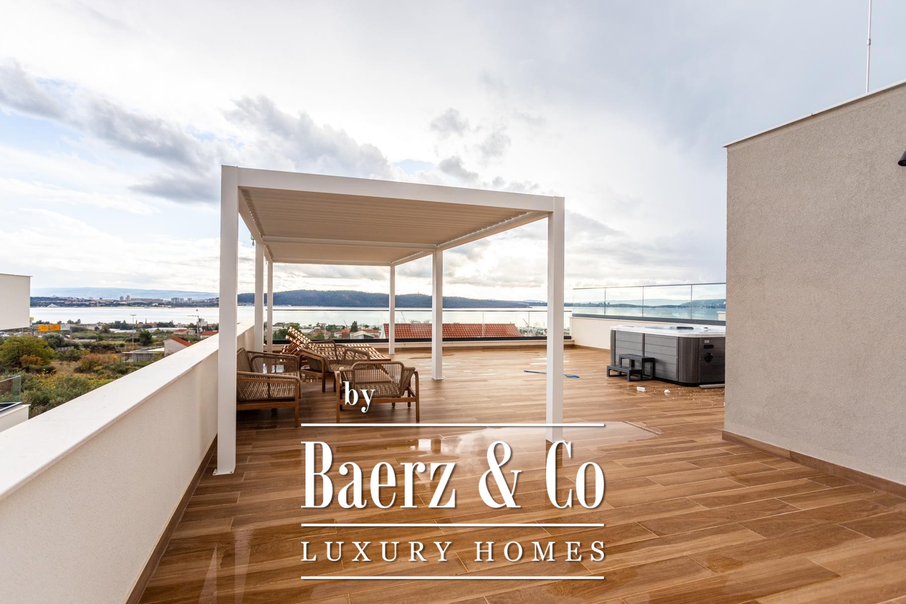 The journey concludes on a roof terrace that offers a jacuzzi, barbecue, and a sheltered relaxation corner for year-round enjoyment. Underfloor heating and individual air conditioning in all rooms ensure comfort in every season. The villa is available for purchase through a company structure, providing exemption from the local 3% property tax. This luxury villa for sale in Kaštela stands as a discreet retreat for those seeking light, calm, and panoramic perspectives above the Adriatic.