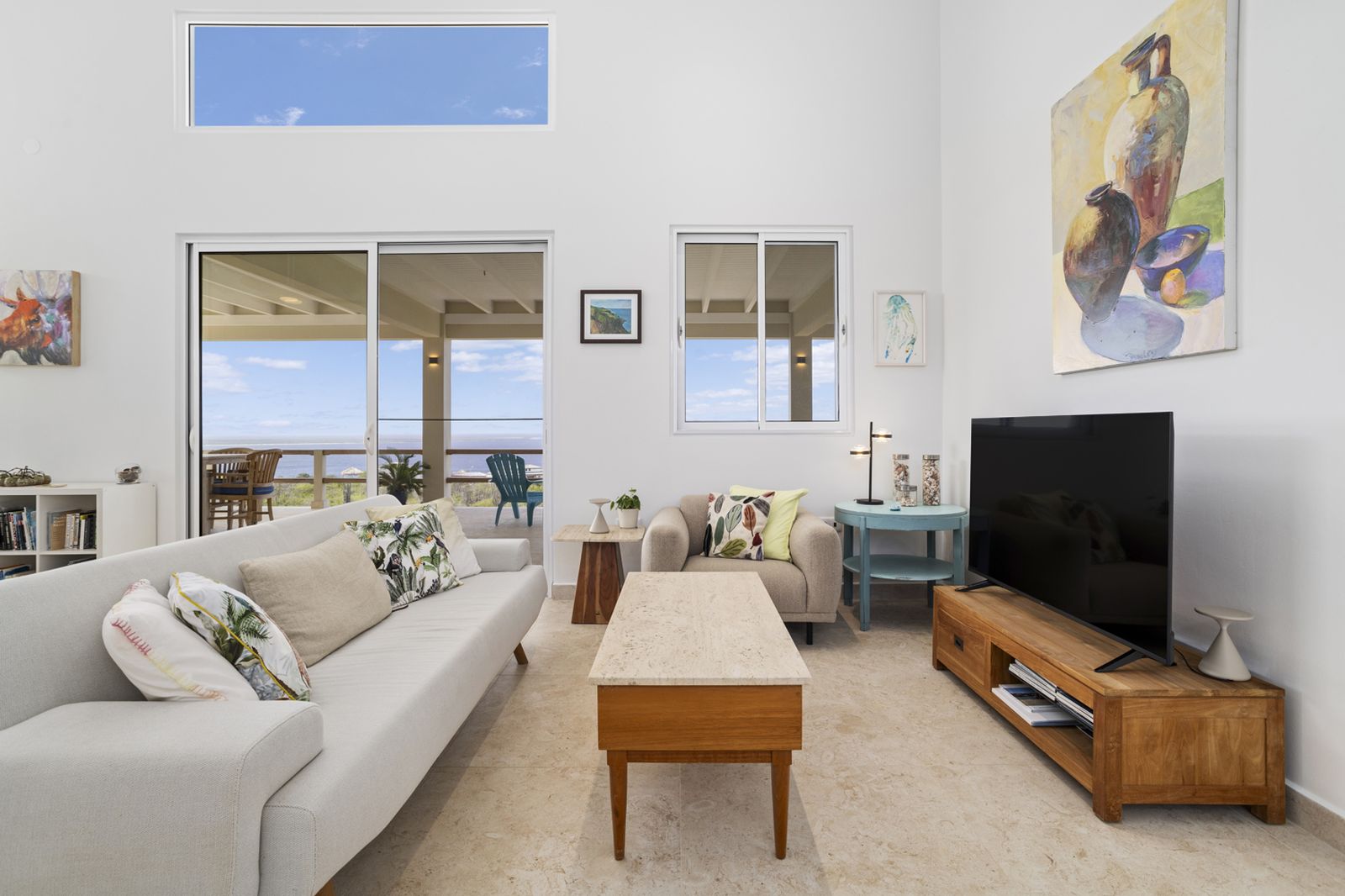 The villa’s clean architectural lines and expansive sliding glass doors create a seamless indoor-outdoor connection. The broad, sea-facing terrace becomes a natural extension of the living space, capturing cooling trade winds and uninterrupted views from sunrise to sunset.