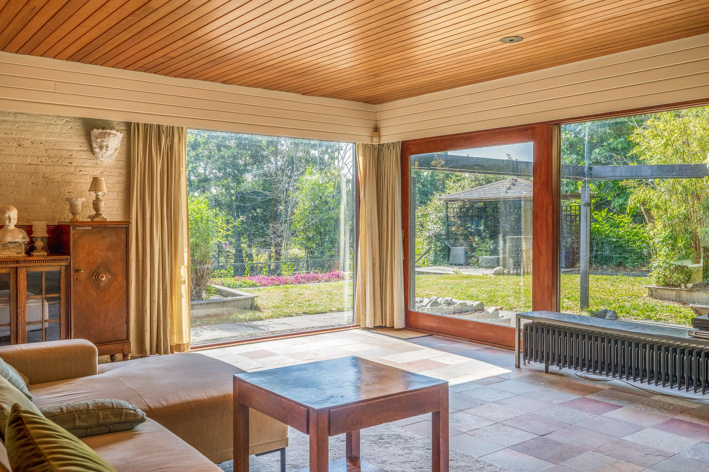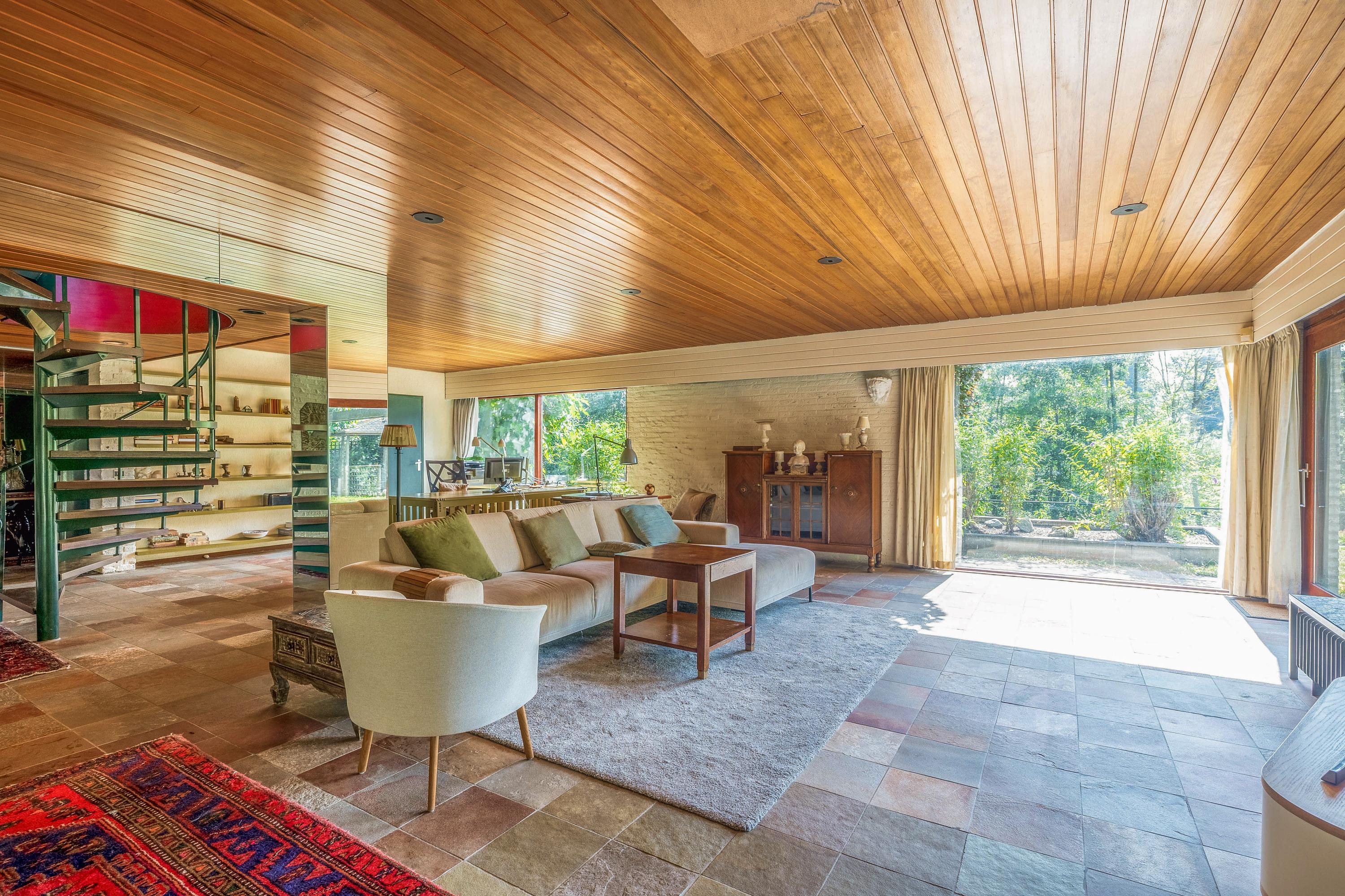 Inside, you’ll find a spacious, garden-oriented living room with large windows that bring in lots of light and offer views of the surrounding greenery. The warm atmosphere and generous layout provide plenty of options for different interior arrangements to suit your personal living style. The adjacent open-plan kitchen is roomy and forms the heart of the home.