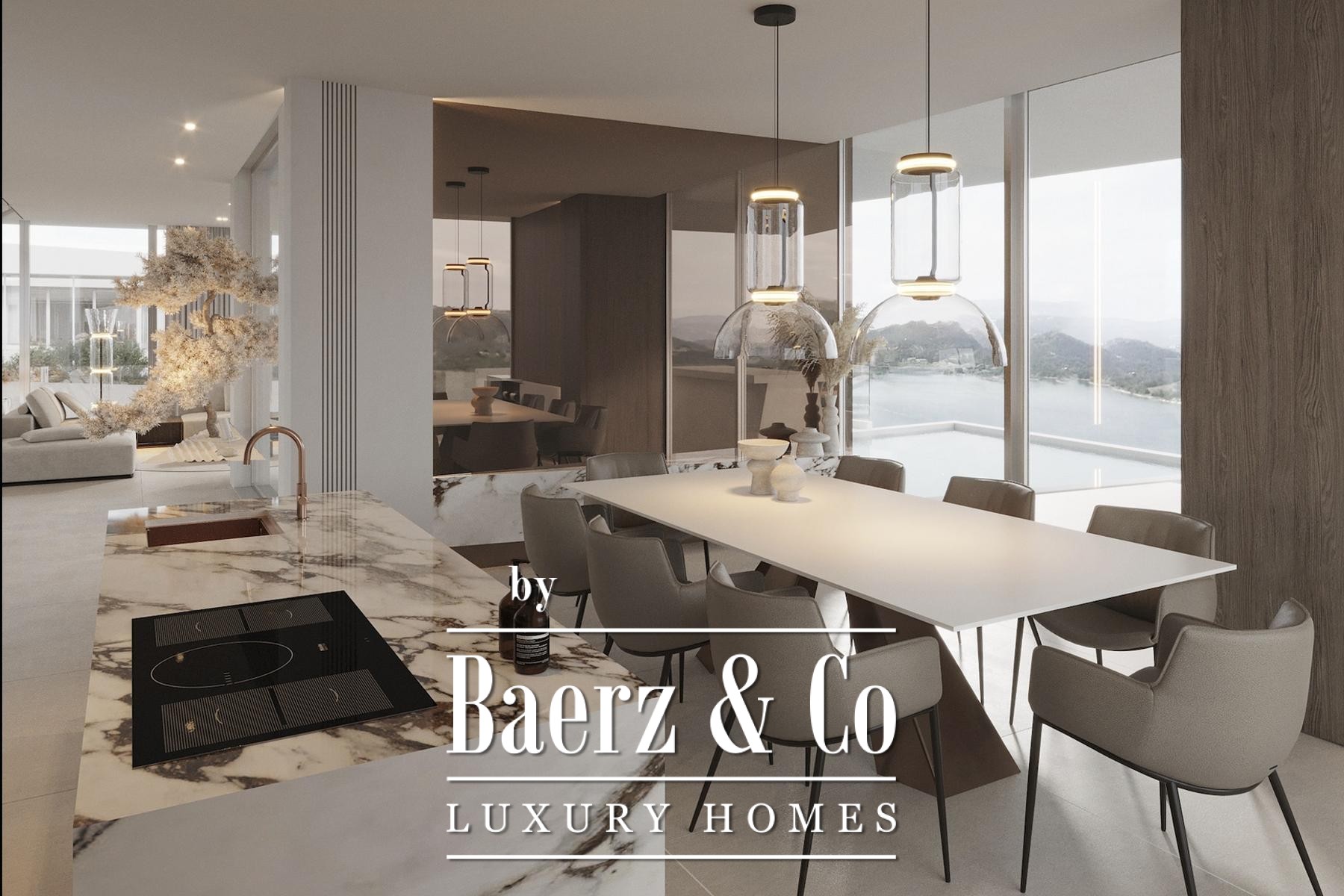 The home offers four bedrooms and four bathrooms, each finished with designer sanitary ware in brushed bronze and satin, ensuring a blend of comfort and composed elegance. The interior is designed for fluid living, while terraces of 197 m² and a 34 m² rooftop pool invite seamless connection between in and outdoor spaces. Features such as a sculptural Ergofocus fireplace, Schüco systems, and top-quality ceramics emphasize refined detail, with a 32 m² garage complementing the layout.