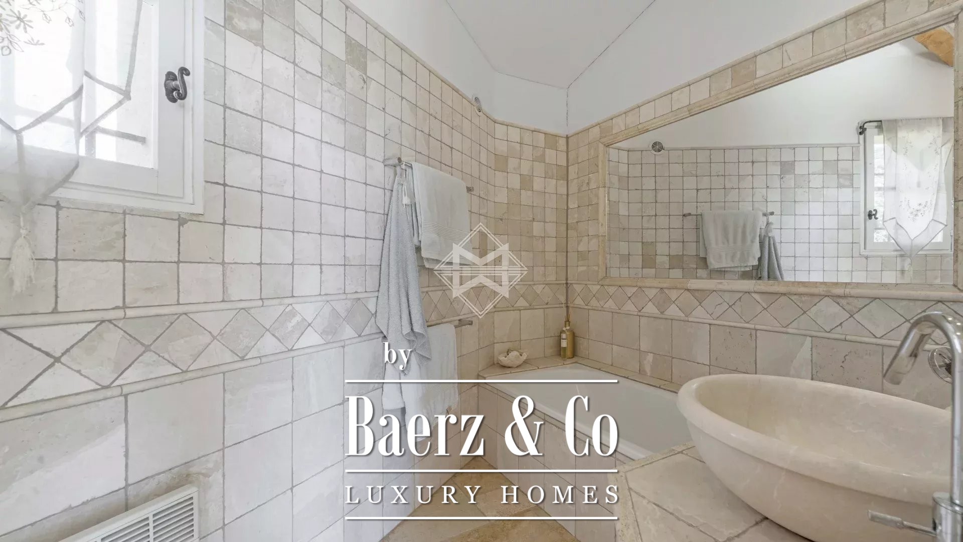 The 2300sqm plot ensures complete privacy and includes a pétanque court, meticulously maintained Mediterranean plants, an 8x4 m swimming pool, double garage and multiple parking spaces, electric gate with intercom, automatic irrigation system, outdoor lighting, and mains drainage.