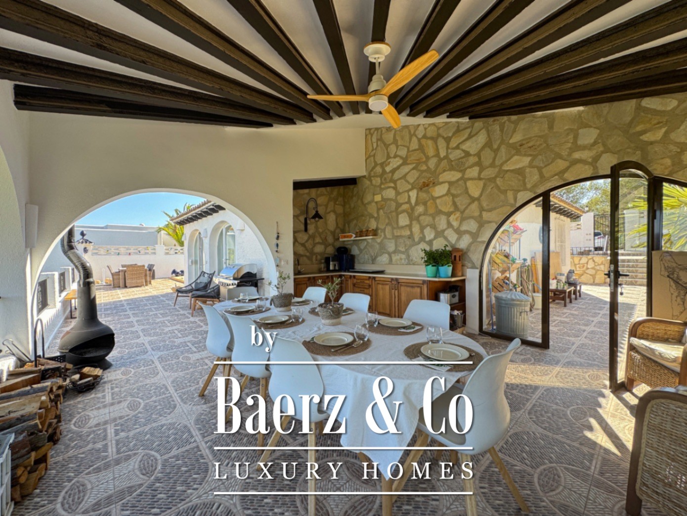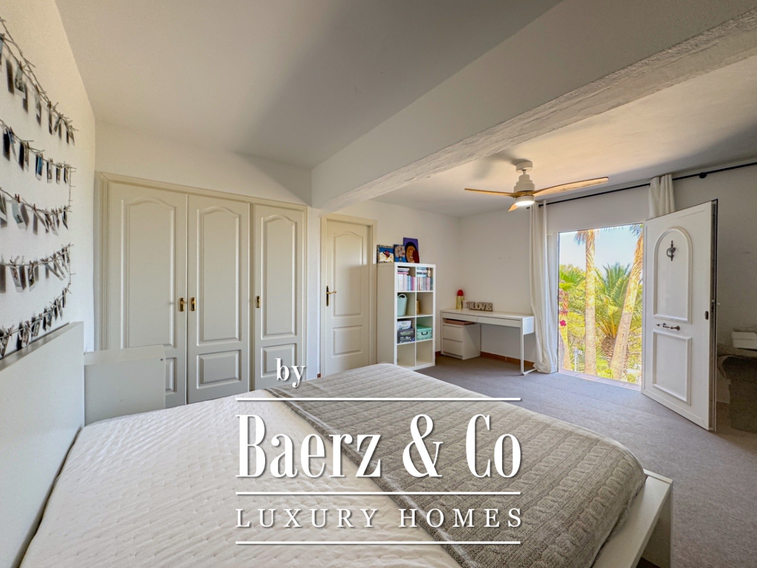Outside, an array of palm and fruit trees create a sense of quiet seclusion. The private pool, dedicated parking, and refined garden spaces complete the sense of retreat. The outdoor kitchen enhances the Mediterranean atmosphere, making alfresco living effortless.