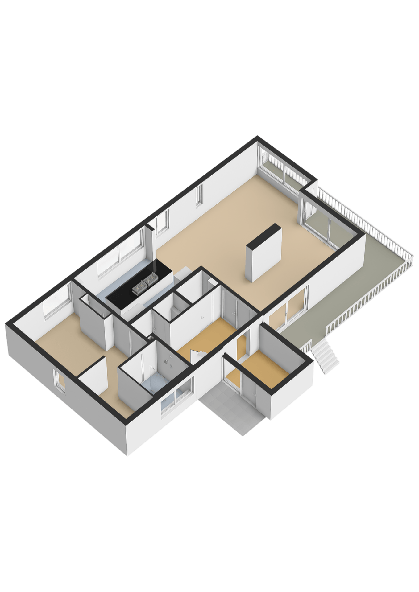 Adjacent to the kitchen and living area is the terrace, where indoor and outdoor spaces flow seamlessly into one another. On sunny days, you open the doors and the terrace becomes an extension of the living space.
