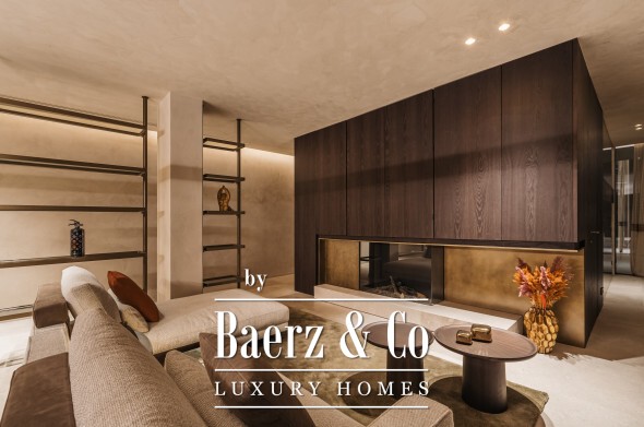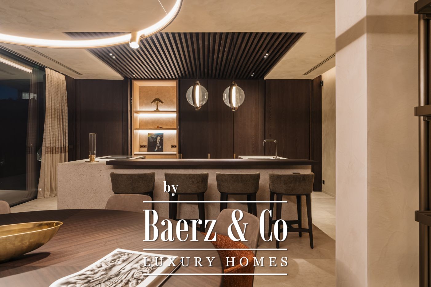 Inside, seven bedrooms and seven bathrooms are distributed between private and guest wings, each benefitting from generous proportions and sophisticated materials. Four kitchens equipped with Gaggenau appliances, a 6 m² walk-in refrigerator, and high-end Italian furnishings by Minotti, Molteni, Gessi and DeCastelli establish a standard of absolute quality. Full-height Schüco windows invite in panoramas, while multiple fireplaces and custom woodwork define living spaces.