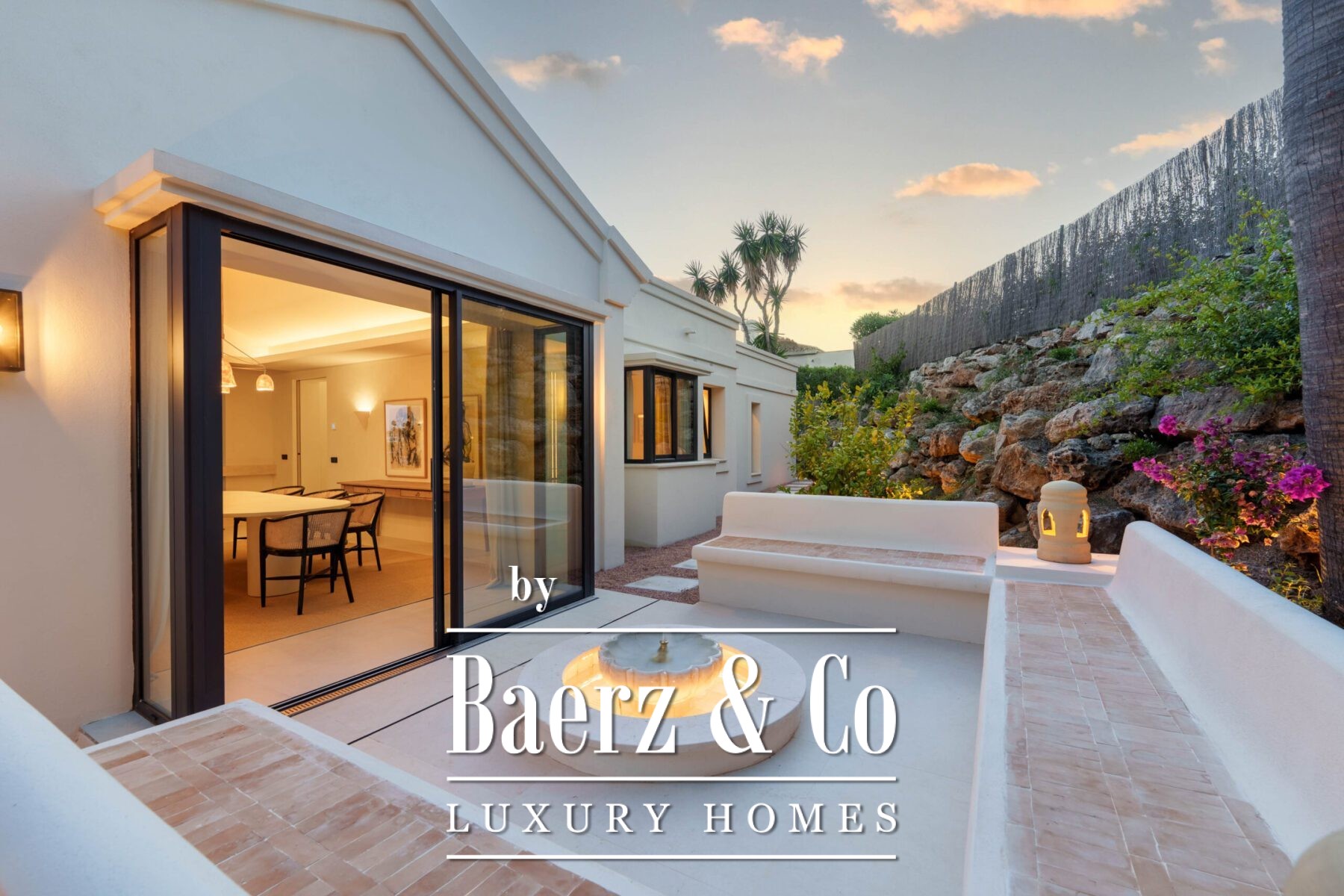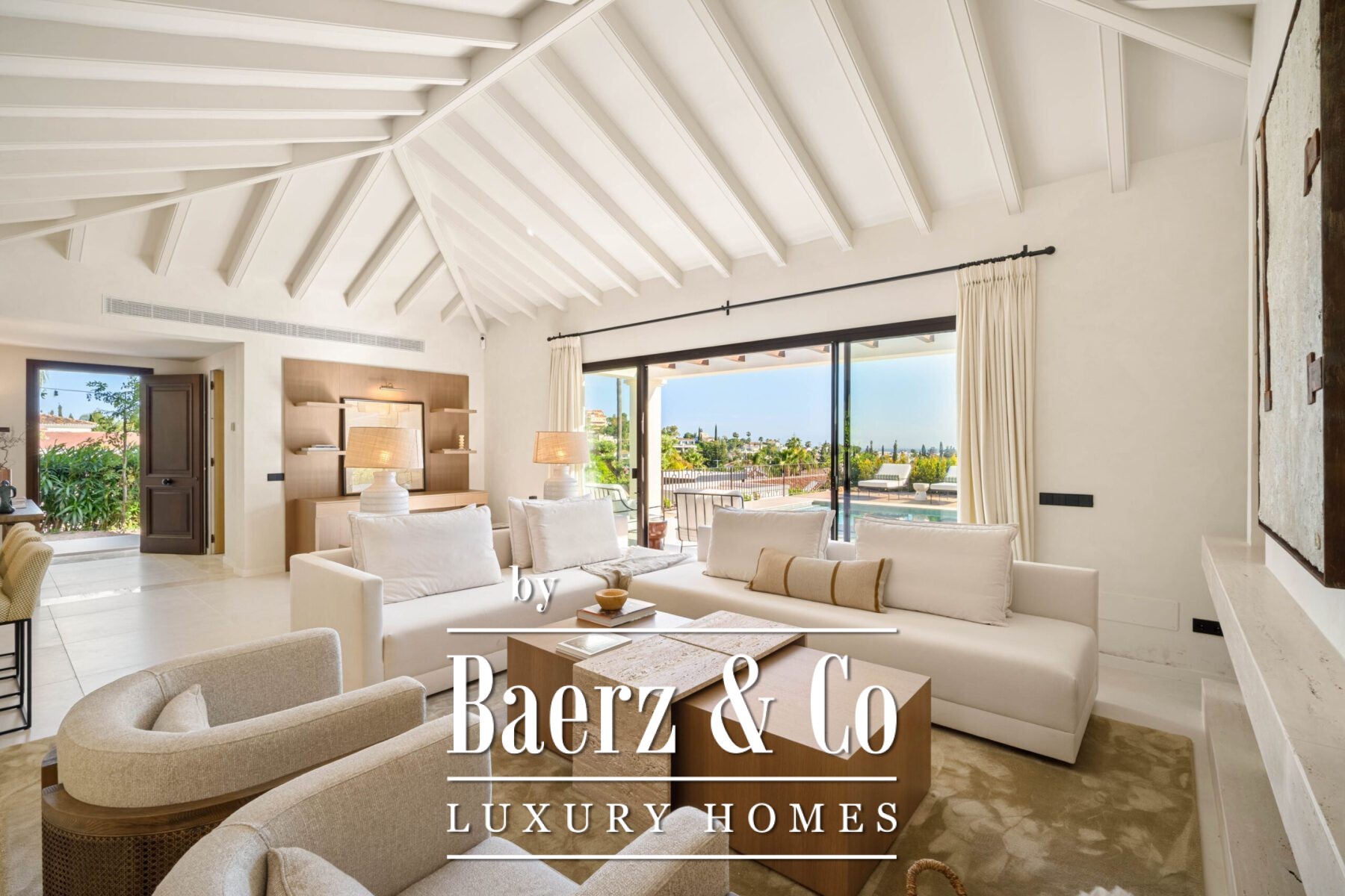 Villa Marbella with Sea and Mountain Views sits quietly in Nueva Andalucía, minutes from Los Naranjos Golf Course and close to Marbella’s celebrated beaches and dining. This fully renovated single-level villa, with 241 m² of living space and set on an 855 m² elevated plot, captures the essence of Mediterranean life. The main living area is defined by its open-plan design, vaulted ceilings, and a palette of soothing natural tones. Light moves freely throughout, courtesy of floor-to-ceiling glass doors that lead to a generous terrace, where an infinity-edge pool appears suspended above the valley. From both inside and the rooftop terrace, expansive views reach across the valley to meet the sea.