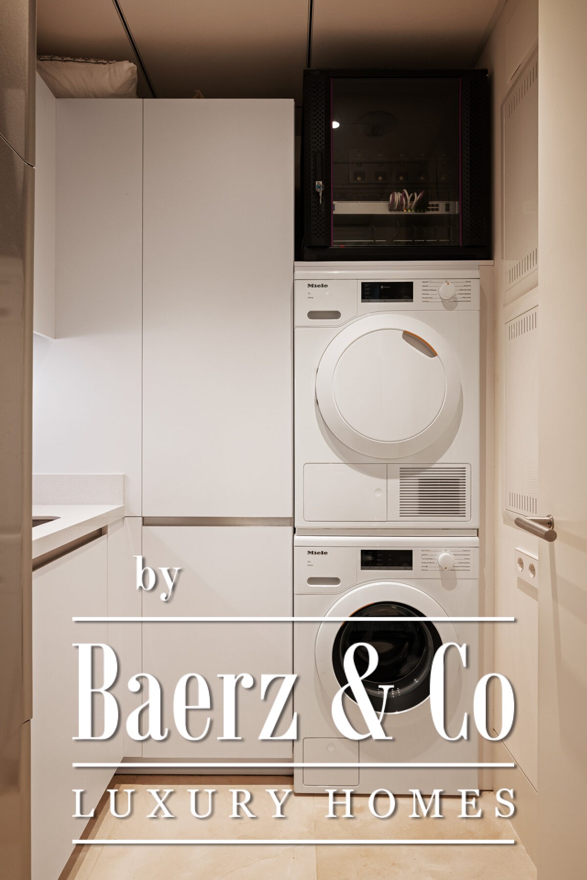 Arriving through a central hall, the apartment’s layout divides efficiently between social and private zones. The open-plan living area flows into a kitchen appointed with Gaggenau and Miele appliances, a striking floor-to-ceiling wine display, and fully automated glazing that merges indoor living with the terrace. In the private wing, the master suite features a walk-in wardrobe and full bathroom, accompanied by two further en-suite bedrooms facing the tranquil gardens. Additional amenities include a laundry room, smart home systems, premium materials throughout, and two garage spaces with a registered electric buggy and storage room.