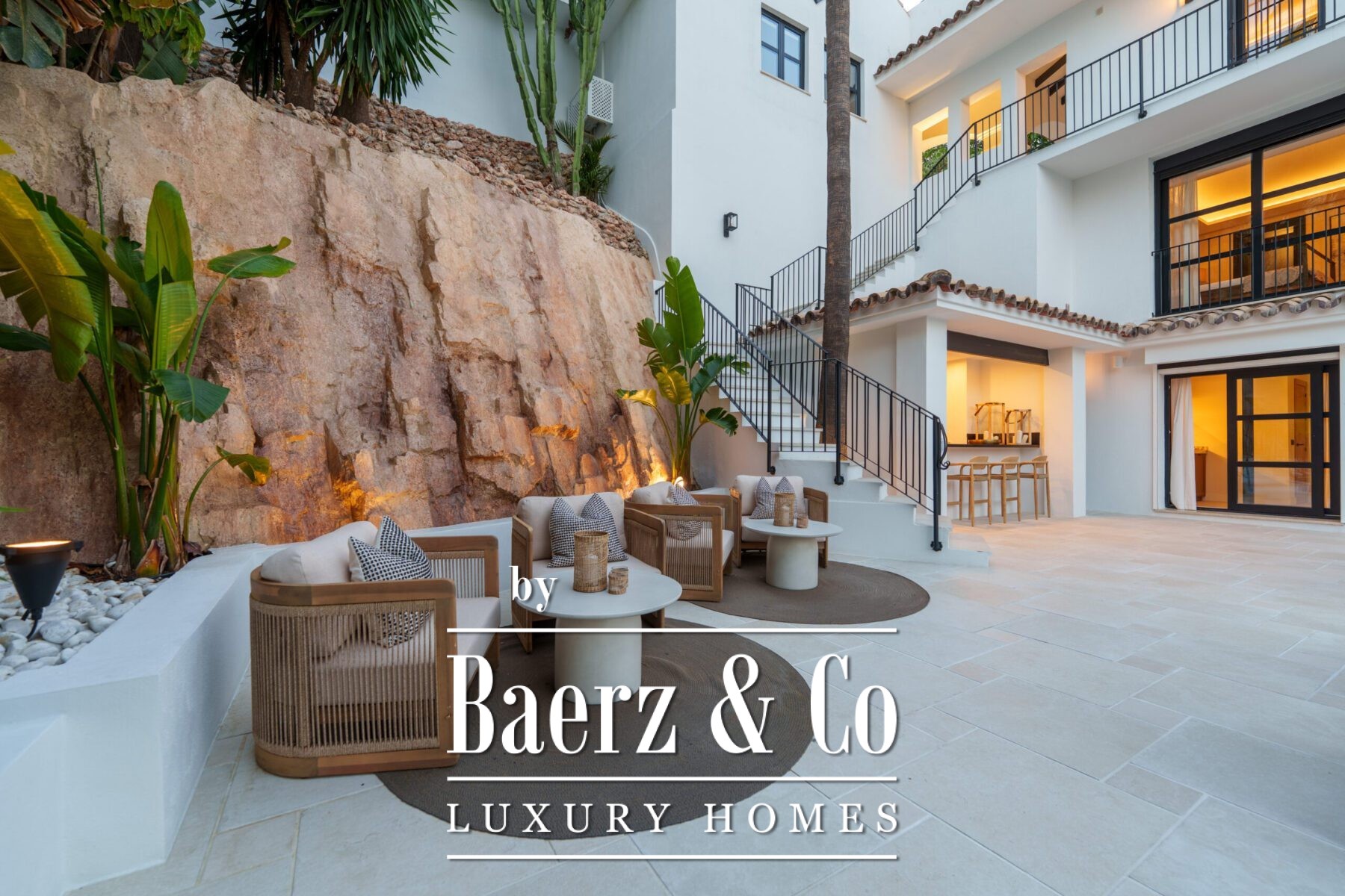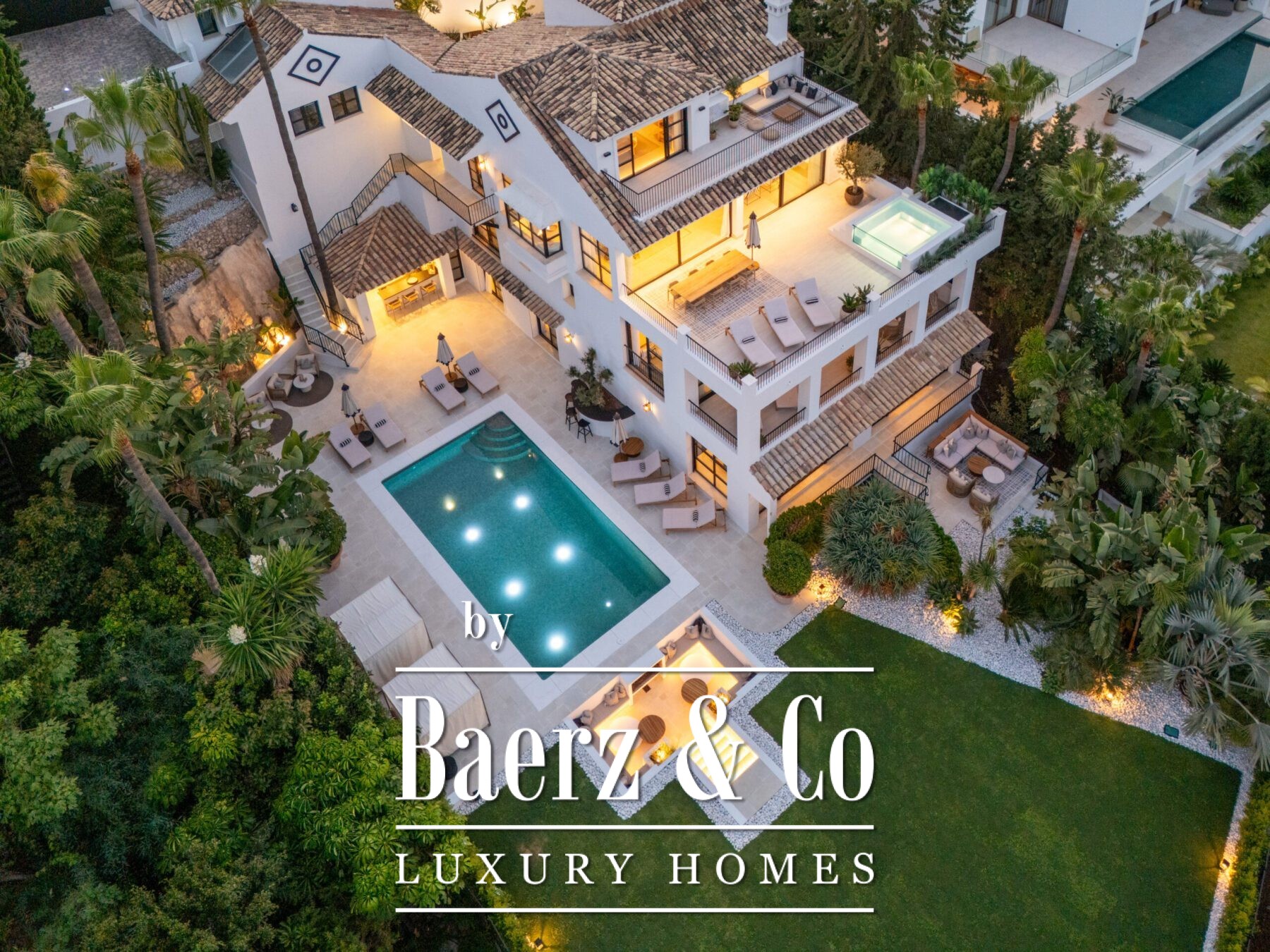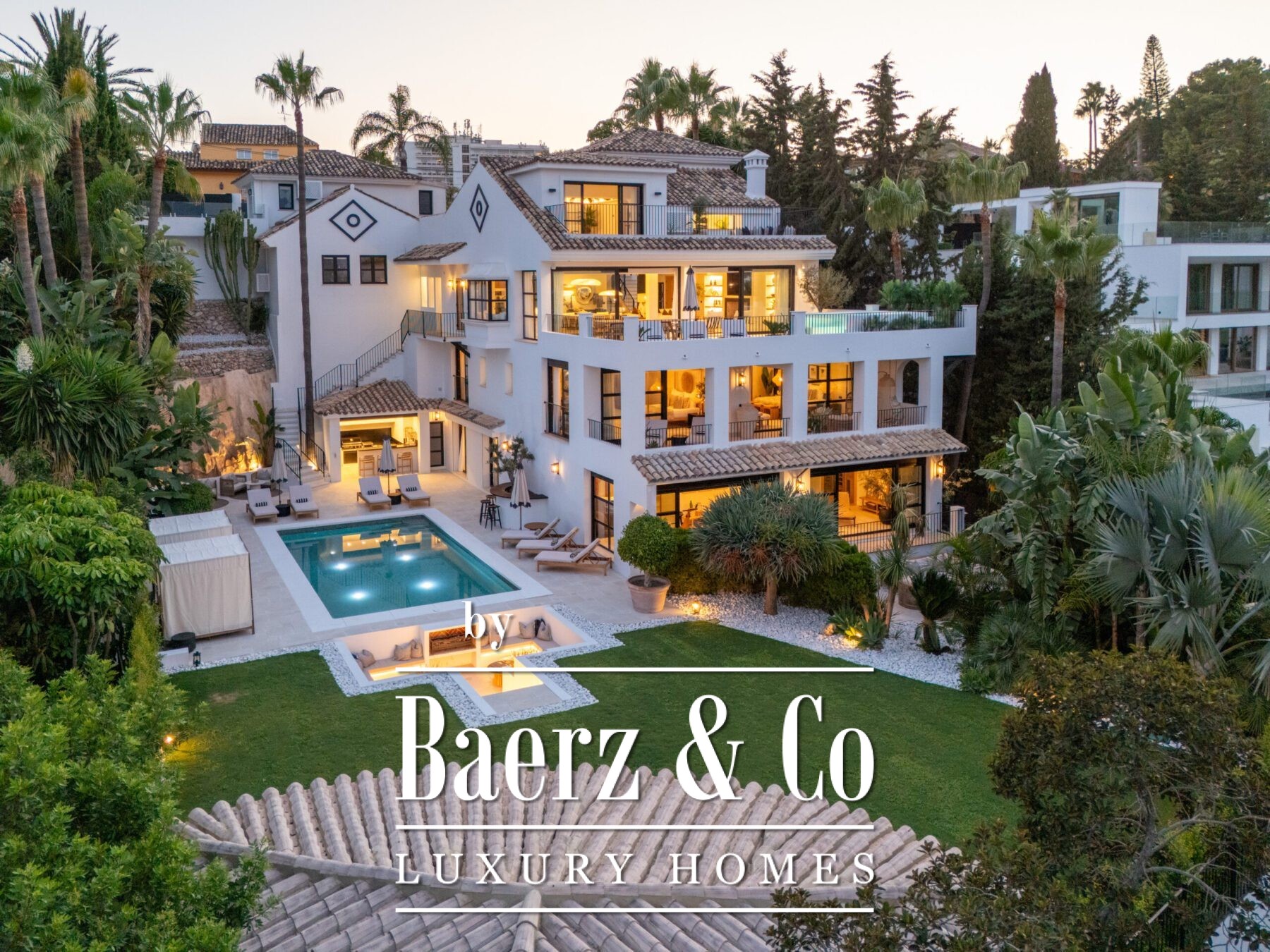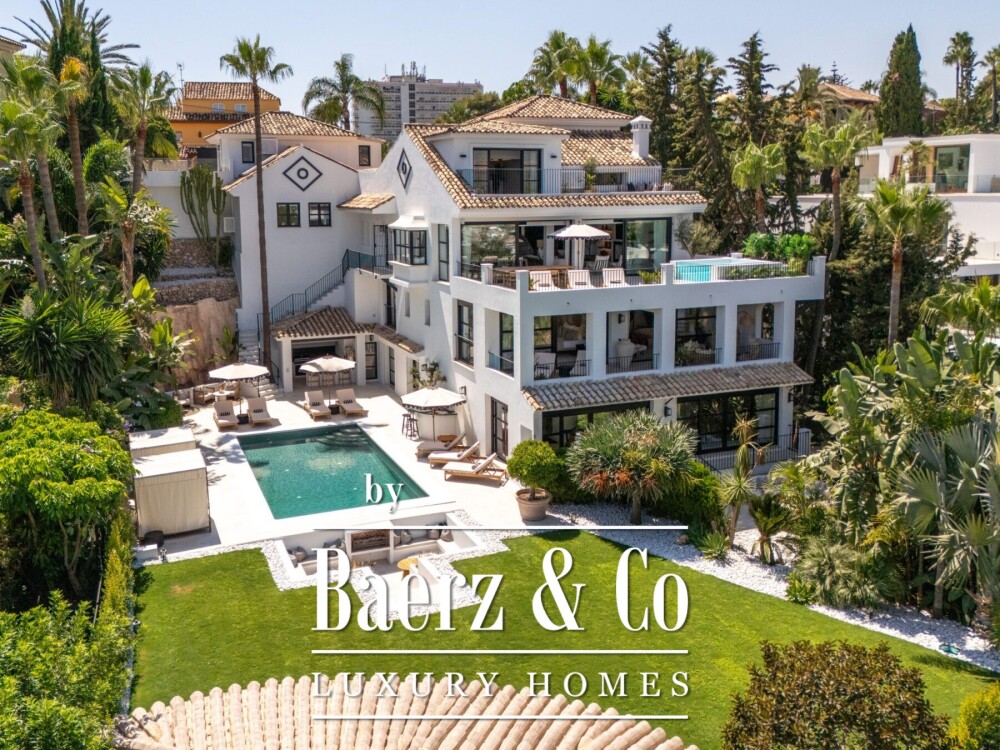 Outside, landscaped gardens embrace a private swimming pool and sunken lounge, adorned with ambient lighting and shaded spaces for tranquil reflection or social occasions. A multi-car garage, security features, and proximity to golf courses, the beach, Puerto Banús, and Marbella’s amenities complete the offering.
