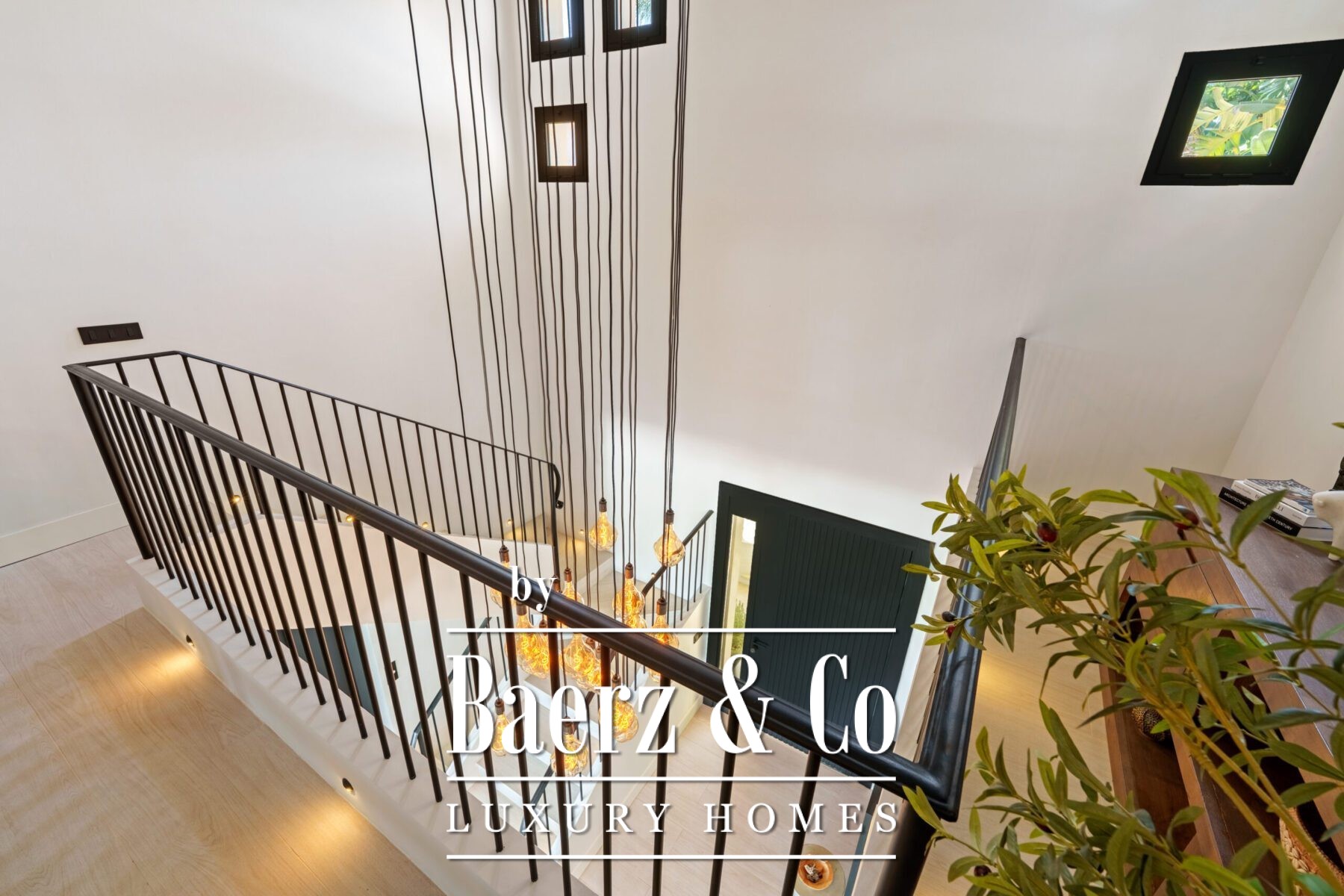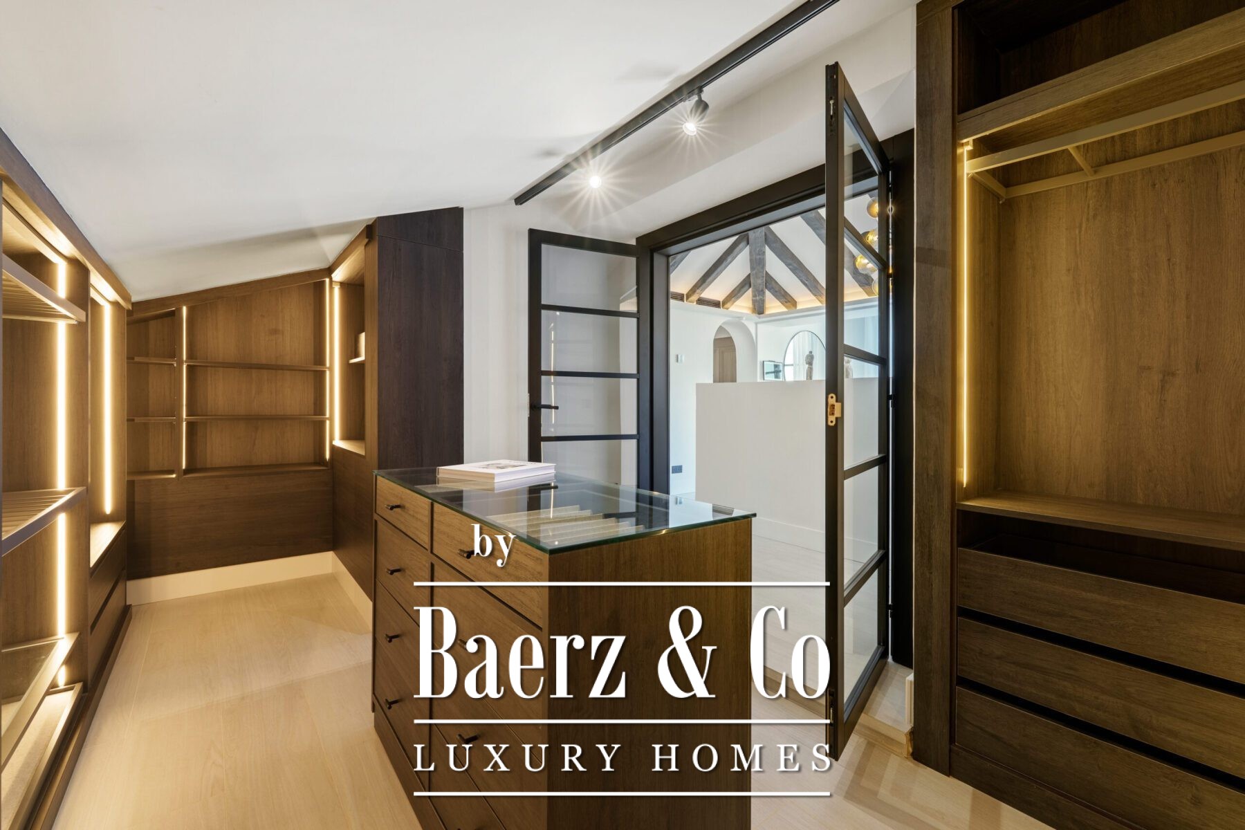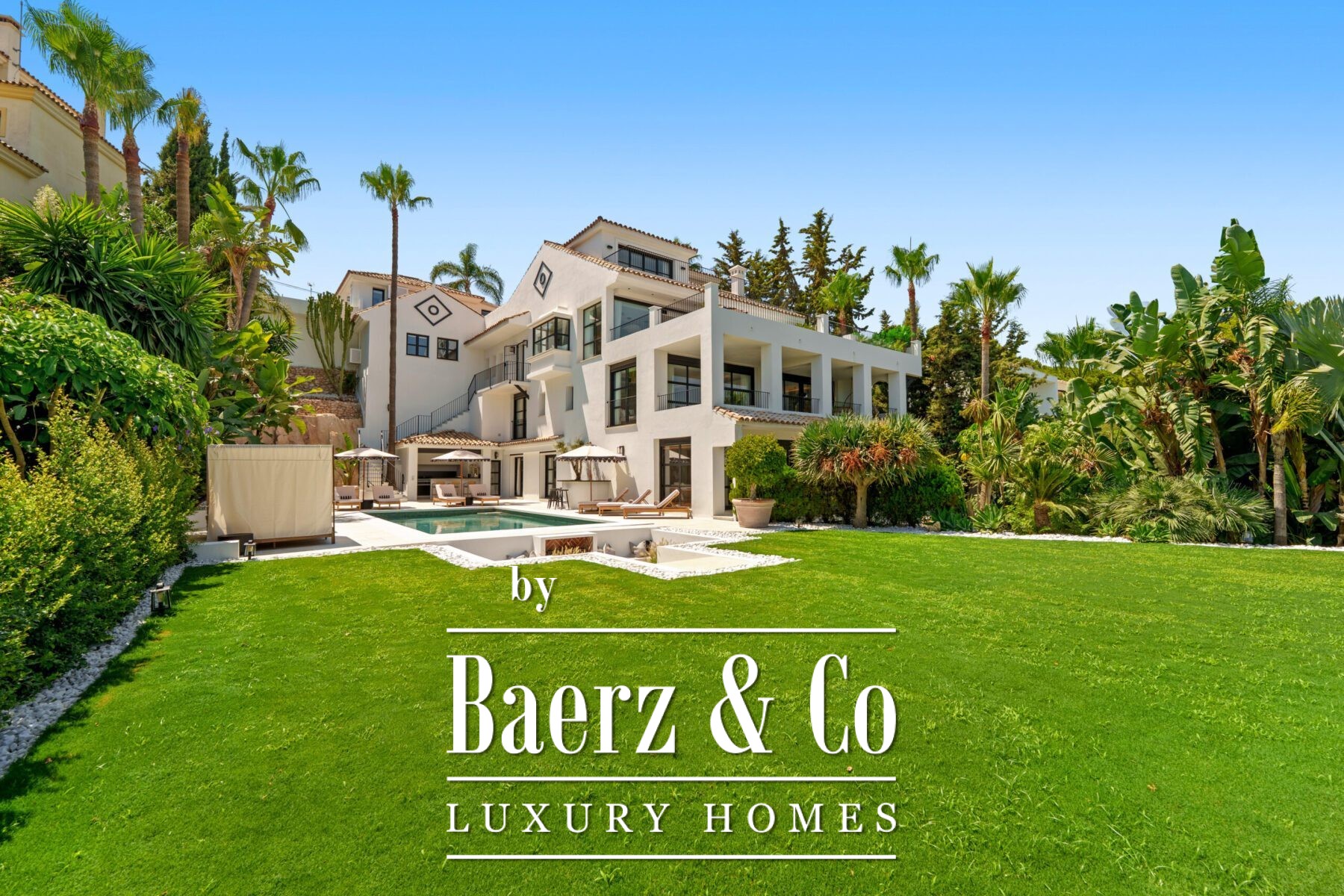 Outside, landscaped gardens embrace a private swimming pool and sunken lounge, adorned with ambient lighting and shaded spaces for tranquil reflection or social occasions. A multi-car garage, security features, and proximity to golf courses, the beach, Puerto Banús, and Marbella’s amenities complete the offering.
