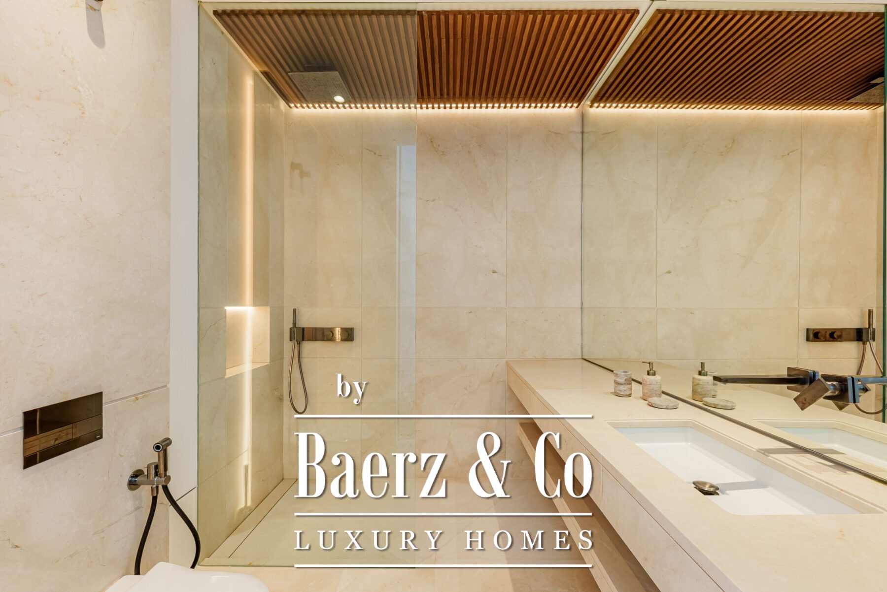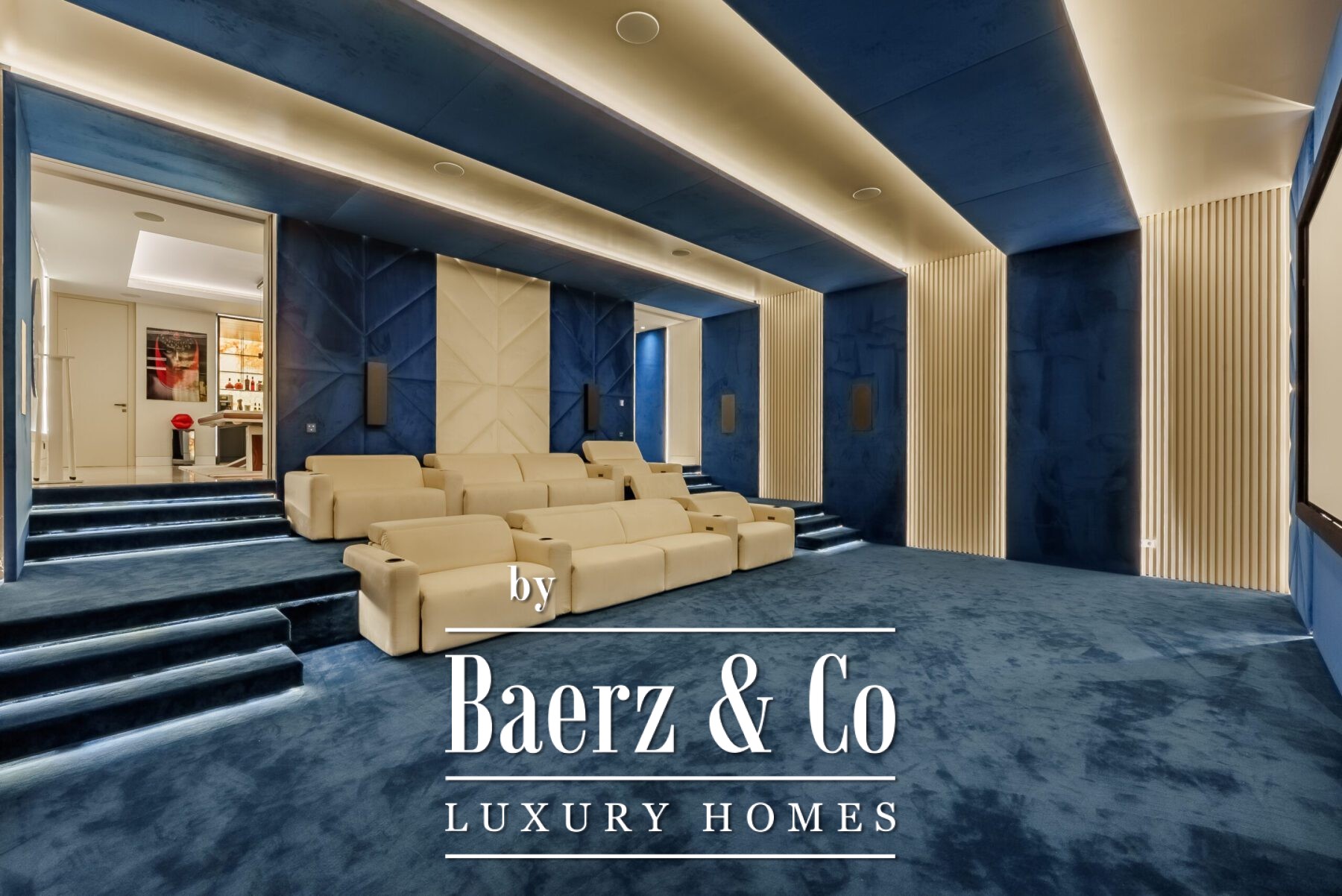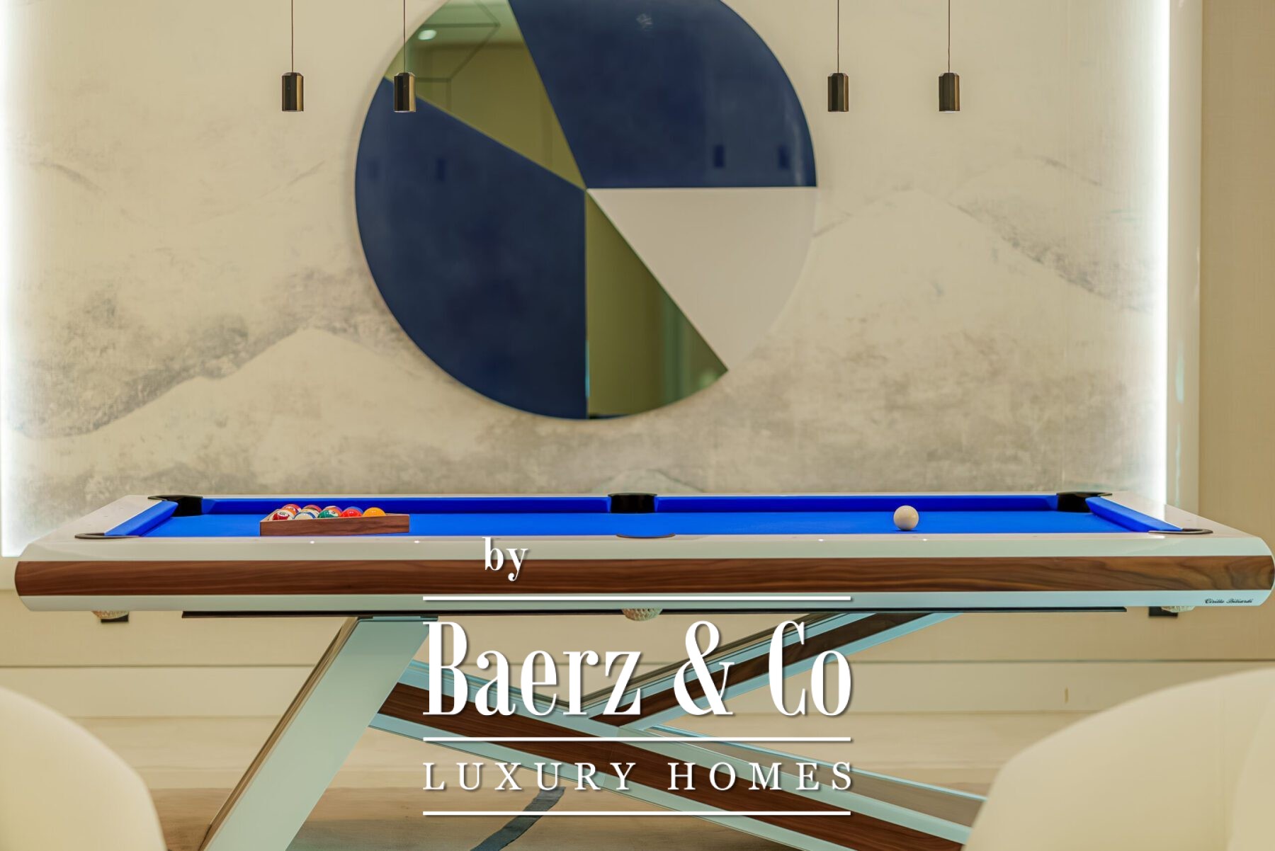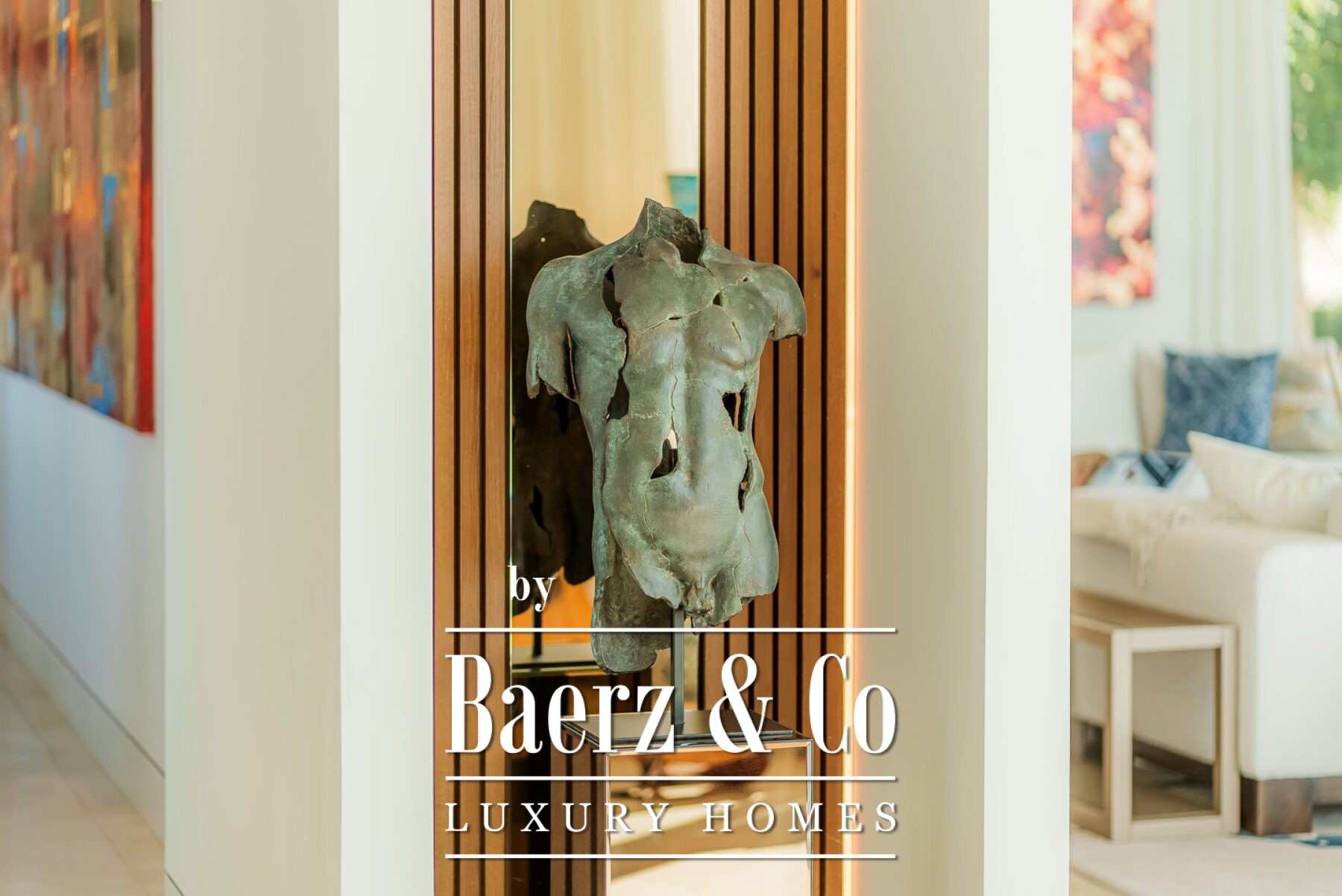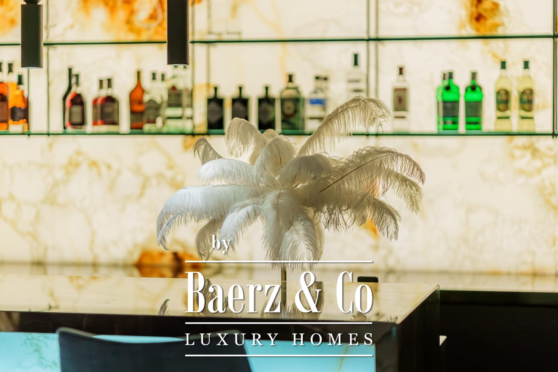 The principal living area is defined by soaring ceilings and full-height glass doors that dissolve into the walls, inviting in natural light and linking the interior with expansive terraces, a landscaped garden, and infinity pool. The open layout invites both intimate moments and vibrant gatherings, reflecting a sophisticated rhythm of daily life.