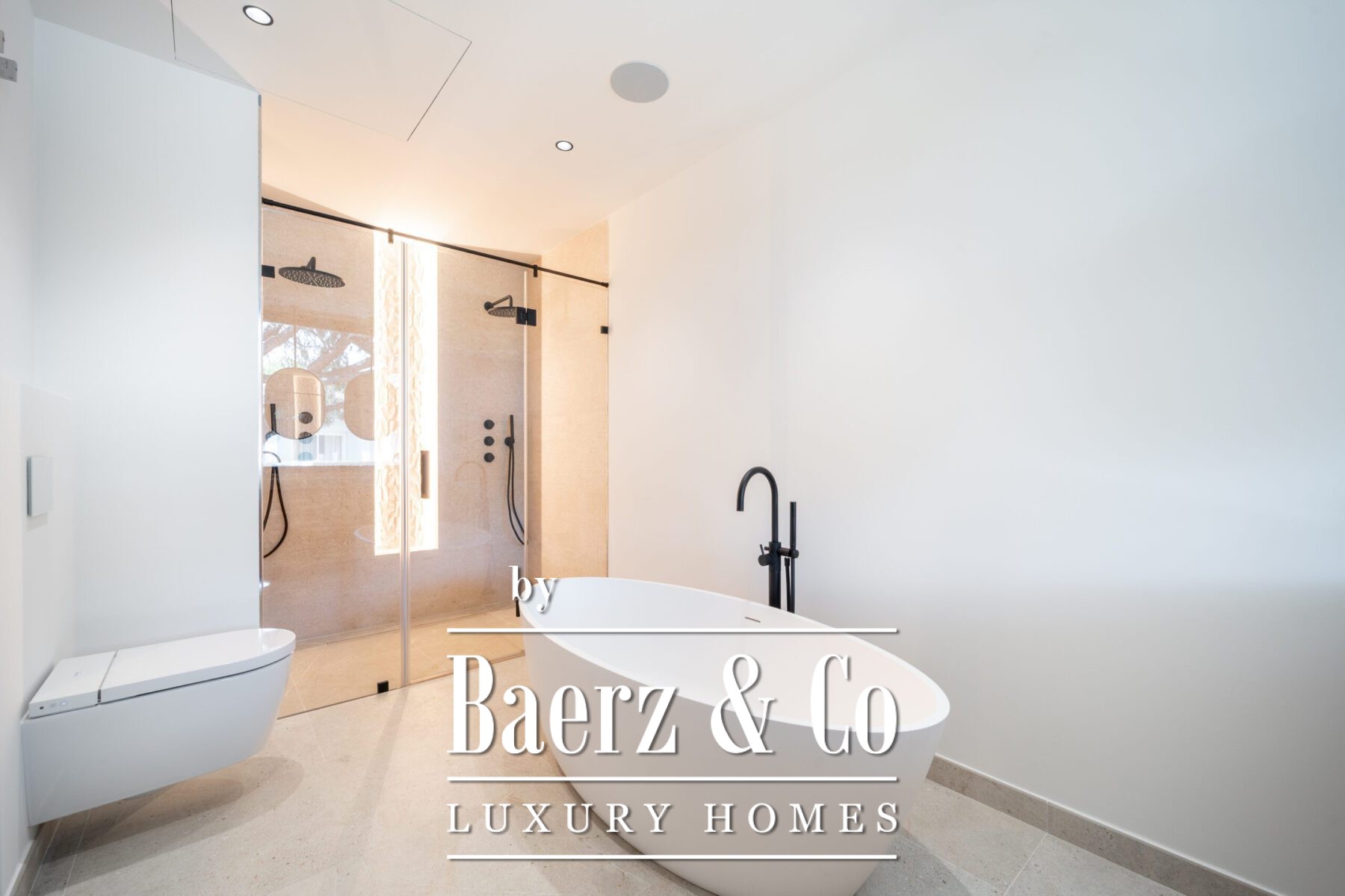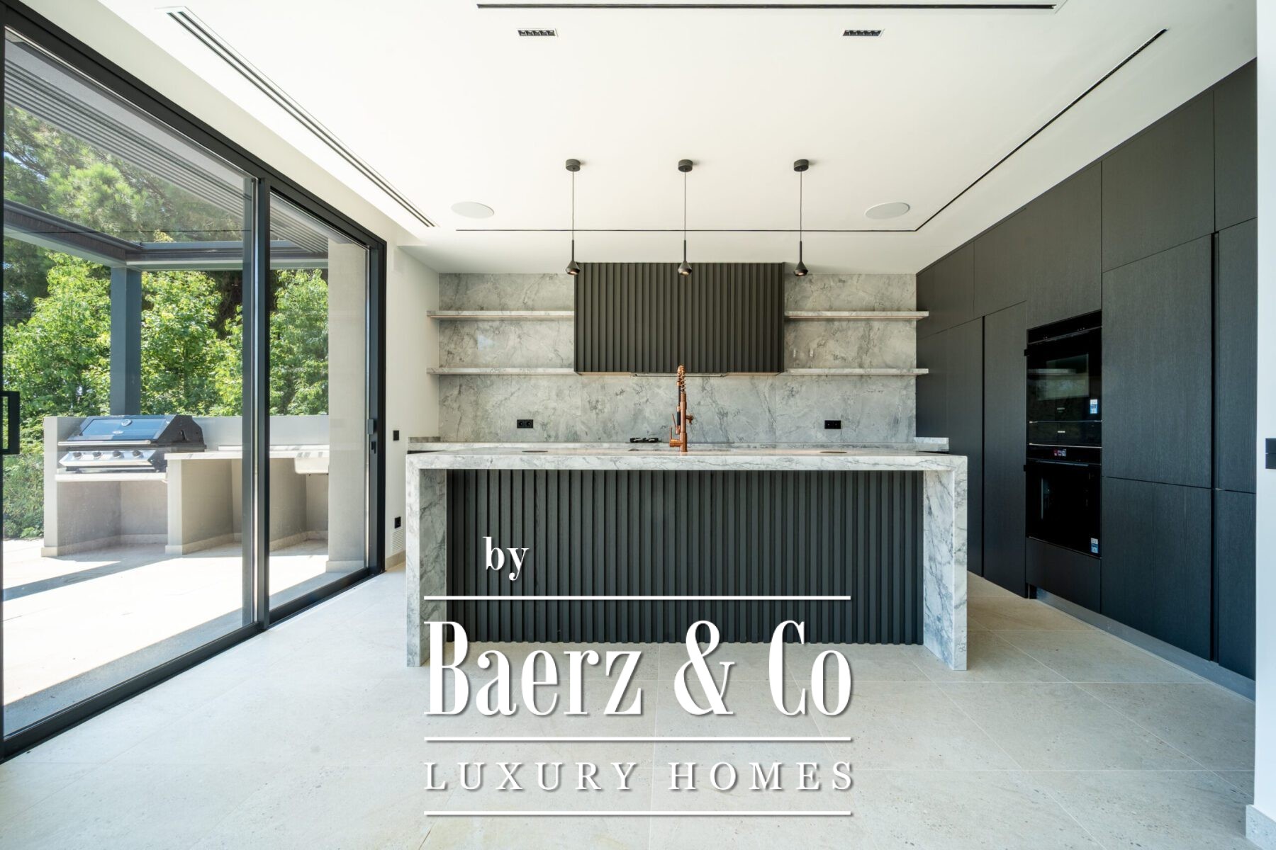 The ground floor’s open-plan living and dining area, centered around a fireplace, flows seamlessly into an American-style kitchen with the latest appliances. A ground floor suite offers privacy for guests or a main floor master, complemented by a guest toilet. Outside, the heated infinity pool and a fire-lit chill-out lounge, complete with a fully equipped summer kitchen, create an intimate backdrop for relaxed evenings among lush Mediterranean plantings.