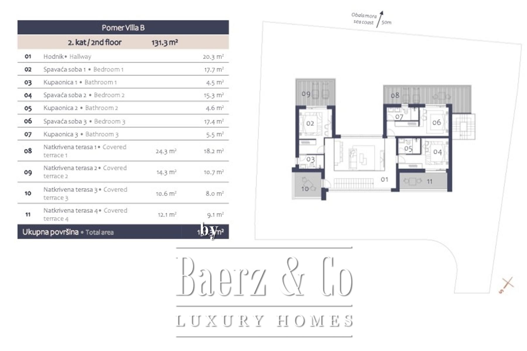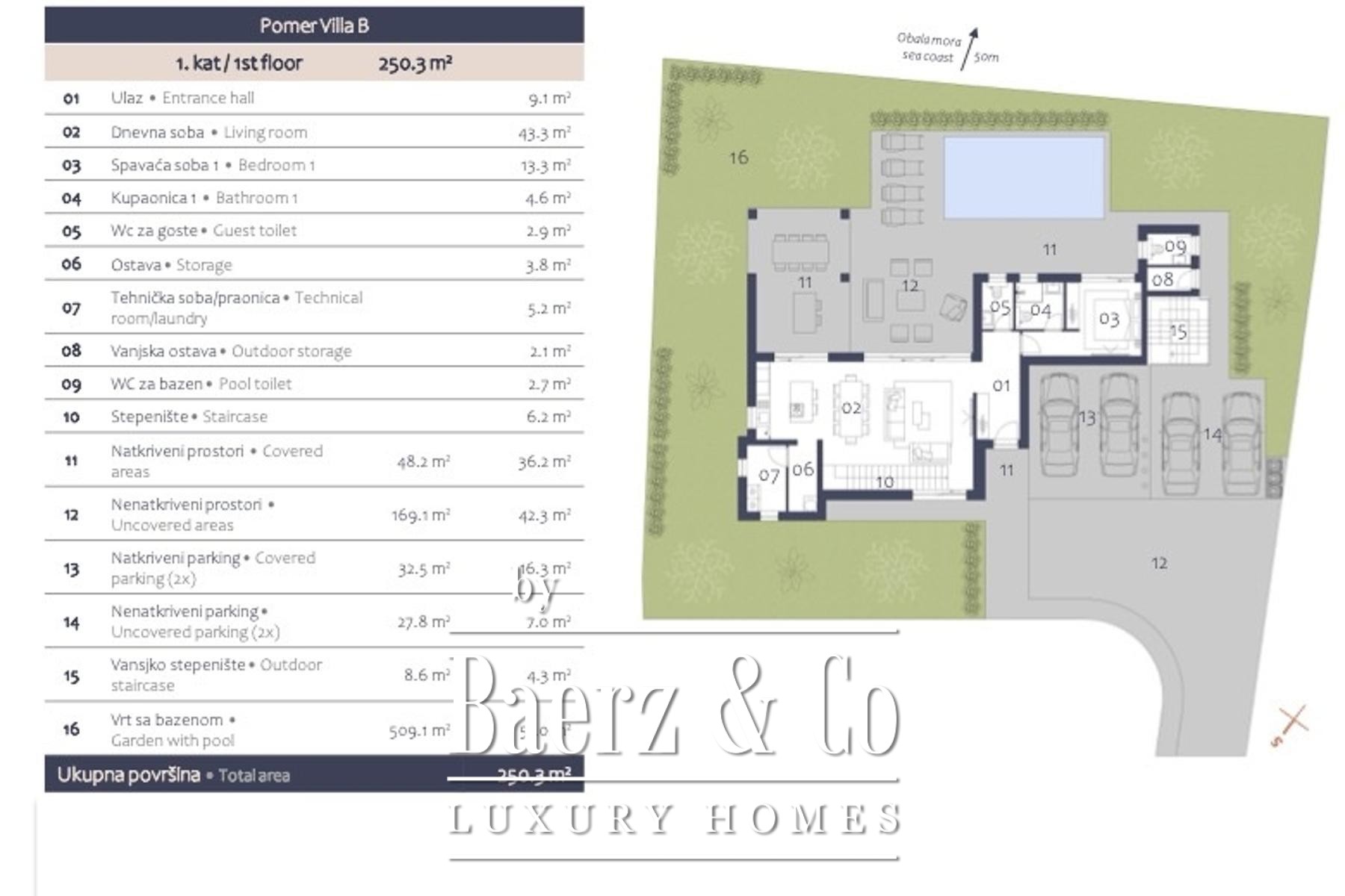 In Pomer, in the south of the Istrian peninsula, only 20 meters from the sea, there is this modernly designed villa with its sumptuous 417 m2 spread over two floors + a roof terrace.On the ground floor of the villa, on the garden of 720 m2, there is a bright open space living room with access to a covered terrace and a swimming pool, which is oriented to the southern sunny side. On the ground floor there is also a modern kitchen and one bedroom with a bathroom, a guest toilet, a technical room, a storage room, another toilet and a larger storage room in the outer part.The internal staircase leads to the second floor, where there are three more bedrooms, each