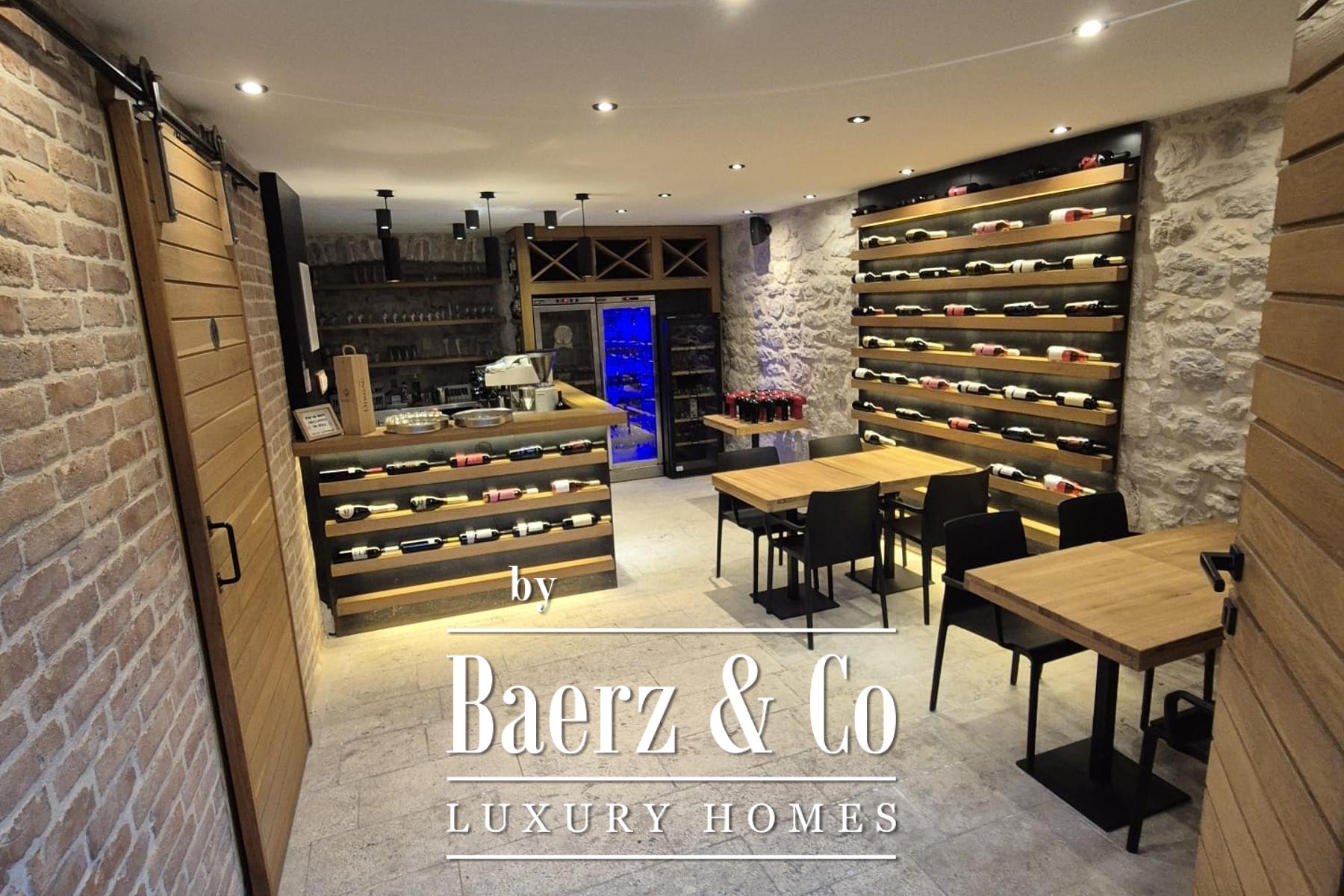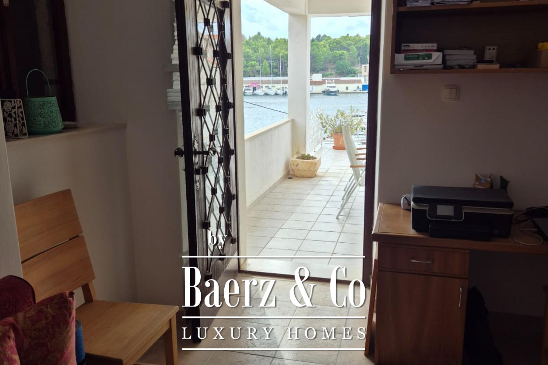 The ground level houses a fully equipped restaurant whose doors open directly to the promenade, its setting welcoming both local guests and visitors under soft maritime light. The first floor offers a spacious dining hall, a large kitchen, and a bathroom, allowing for flexible daily use or expanded hospitality. Upstairs, four bedrooms, a bathroom, and a living room lead to a terrace where views of the harbour, town, and sea impart a sense of timeless Dalmatian life.