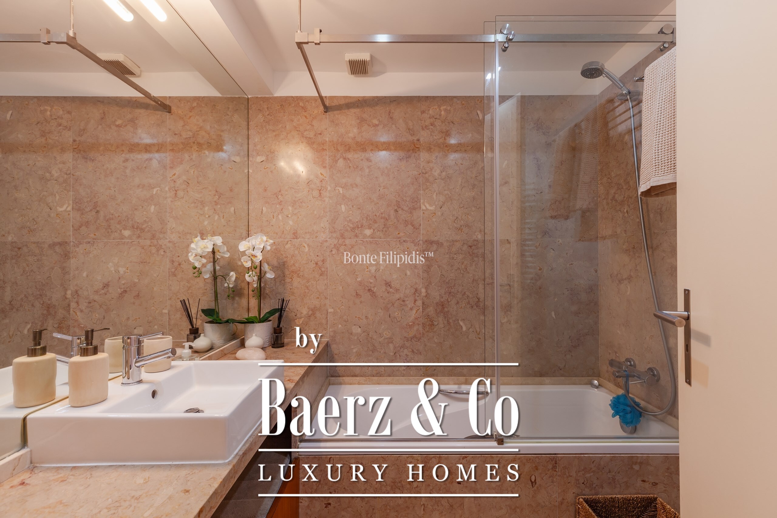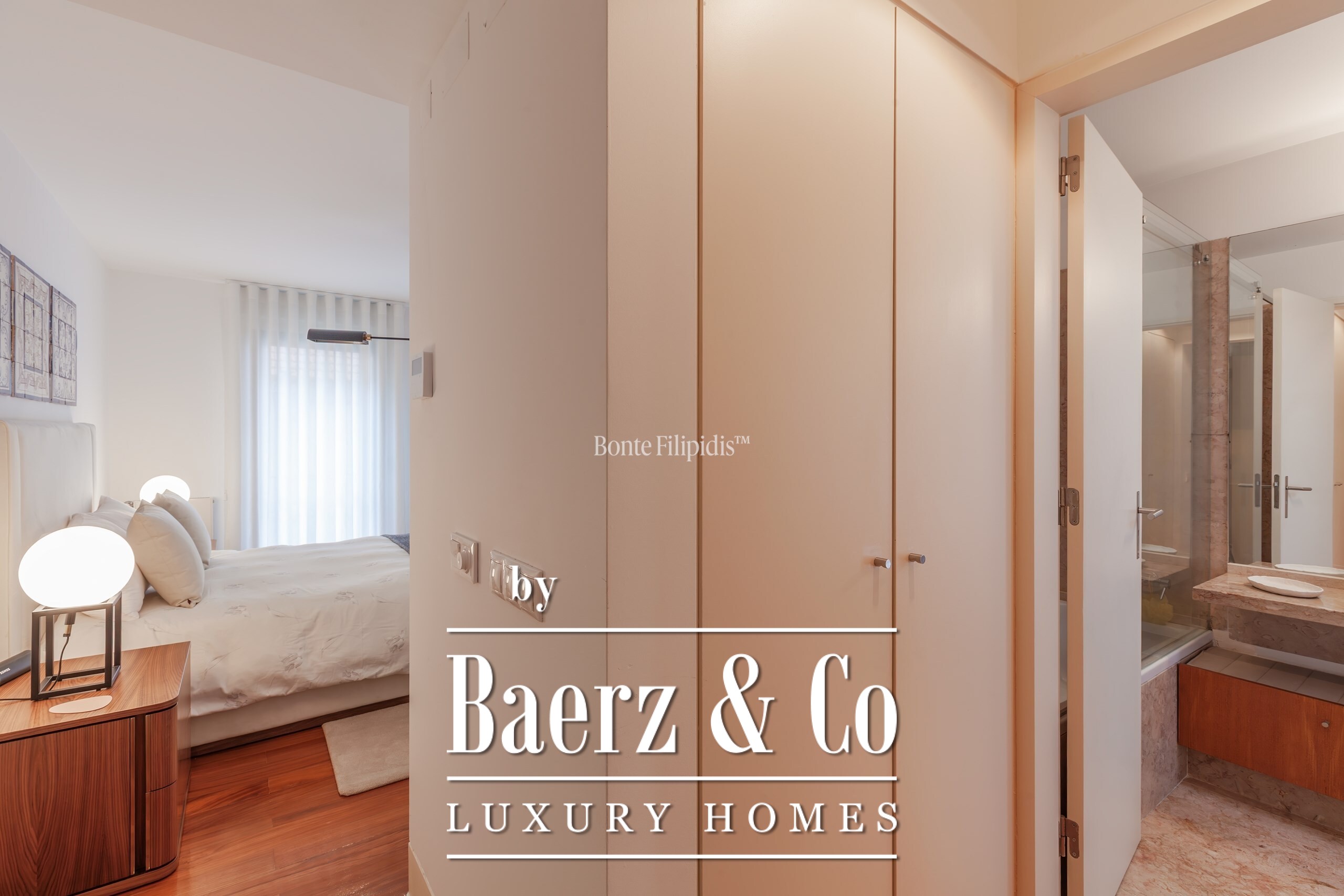 The kitchen, bathed in southwest light, is fitted with SMEG and Siemens appliances, Lioz limestone, and ample storage, serving both daily ease and extended hospitality. Afzelia hardwood flooring, contemporary bathrooms, and central heating further speak to the quiet excellence of this home. The apartment is offered mostly furnished, supporting seamless relocation.