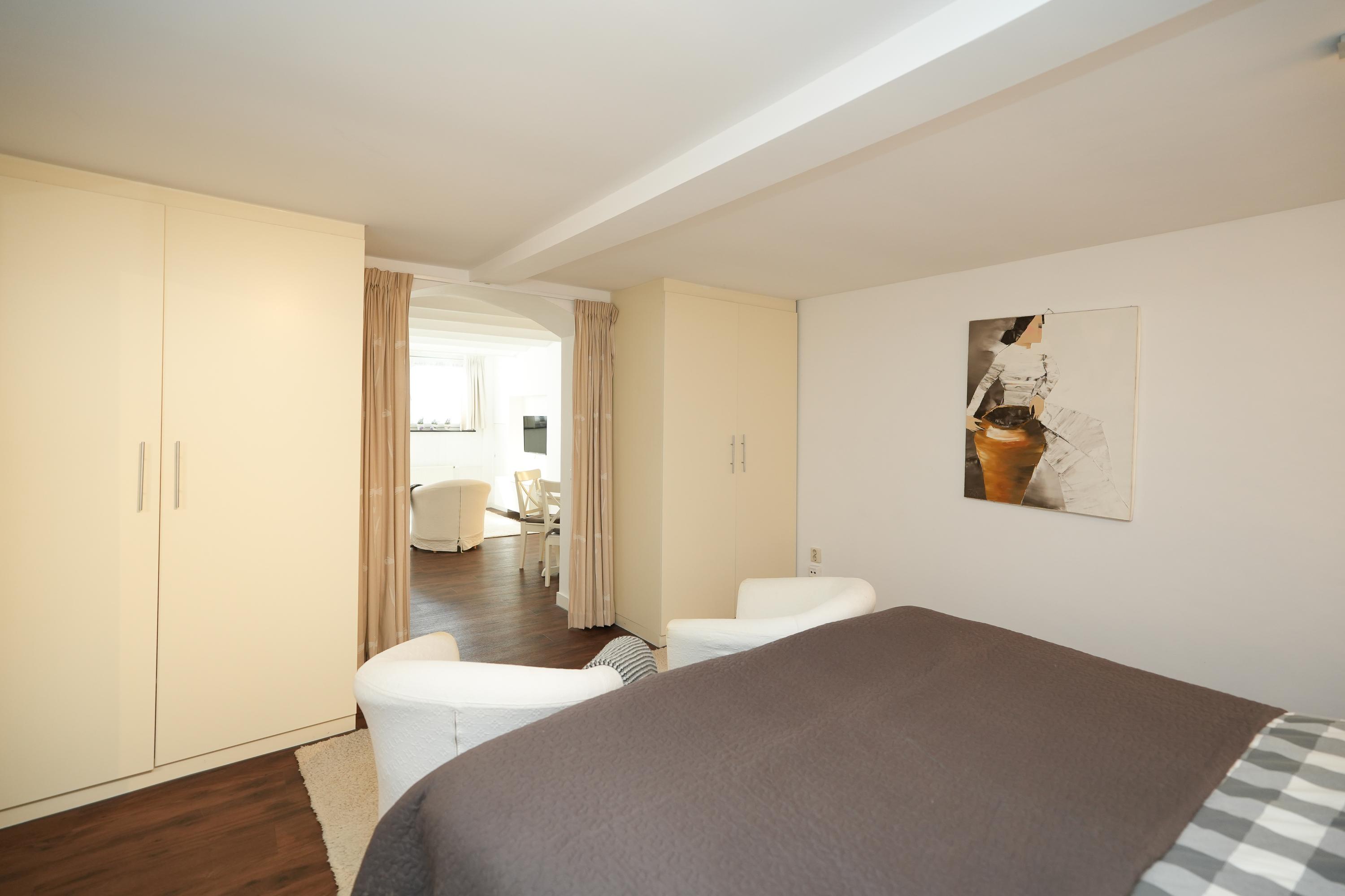 Middels een vaste trap is de bovenste verdieping bereikbaar, hier bevindt zich een ruime woonkamer met een bedstee. Tevens is er een moderne dichte keuken met witgoedaansluiting en er is een functionele badkamer met toilet en douche. Deze verdieping is sfeervol doordat de originele constructiebalken zichtbaar zijn gebleven en de ruimte is lekker licht door de dakramen. Bovendien is er veel bergruimte in vaste kasten.