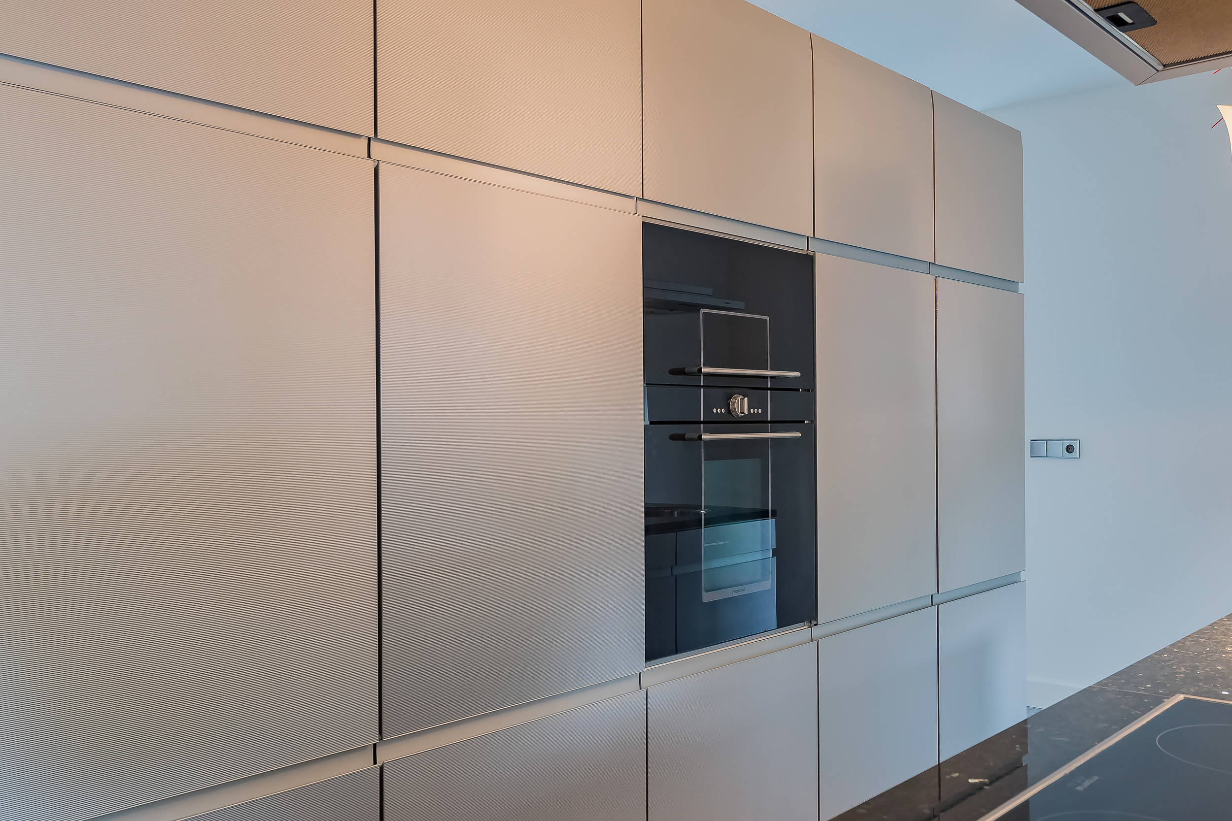 The kitchen, where the symmetry is also reflected, is equipped with luxury appliances and separated from the dining room as a room divider.