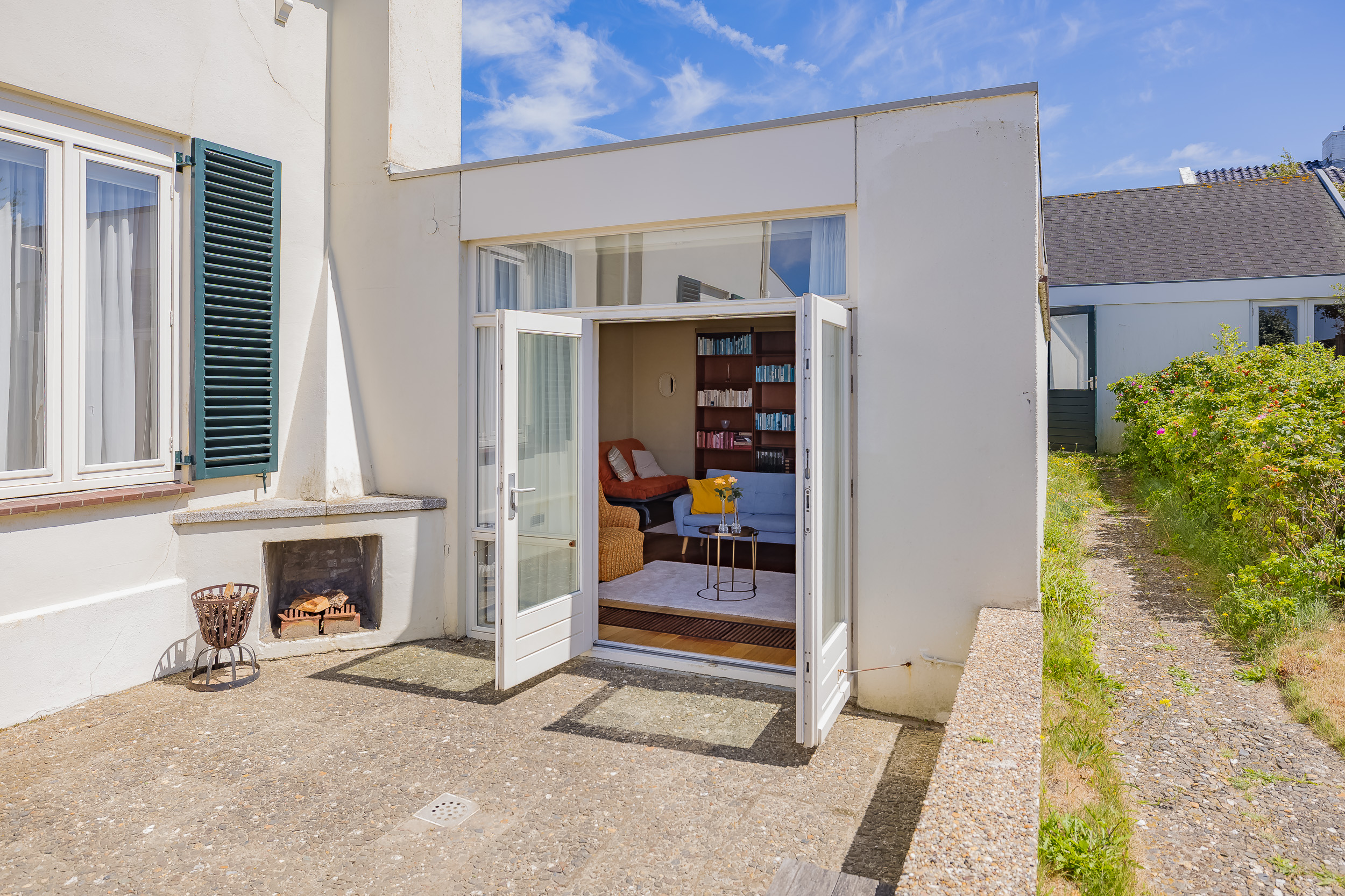 The kitchen, equipped with built-in appliances, is practically furnished with plenty of cupboard space. Furthermore, on the ground floor, you will find a bright second living room with a gas fireplace, ideal for relaxation or as a spacious study. In addition, the ground floor has a comfortable bedroom with a built-in wardrobe. The spacious, sunny south-facing terrace is accessible from both living rooms. The bathroom in the hall is ideal for rinsing off the sand after a day at the beach.