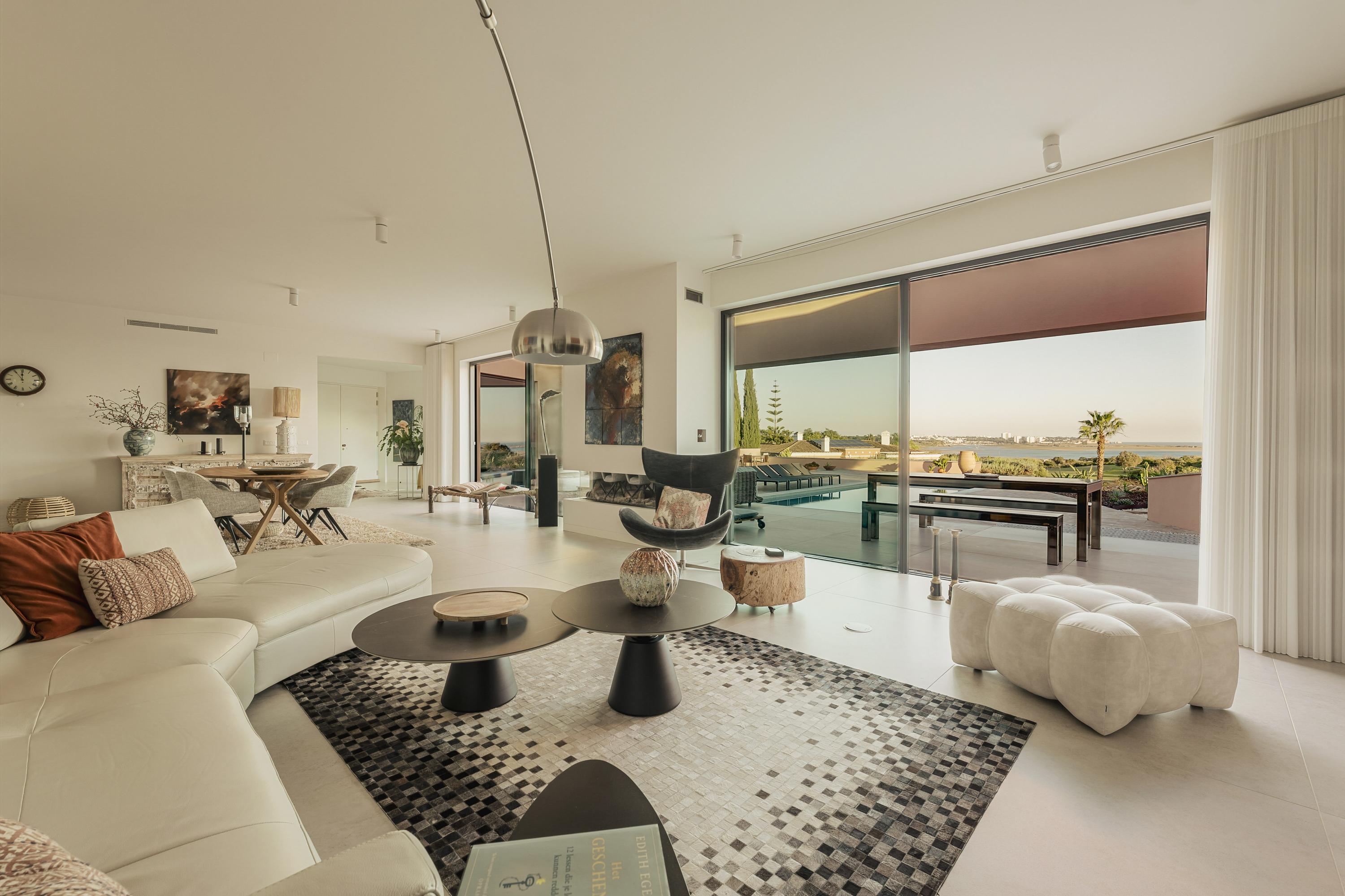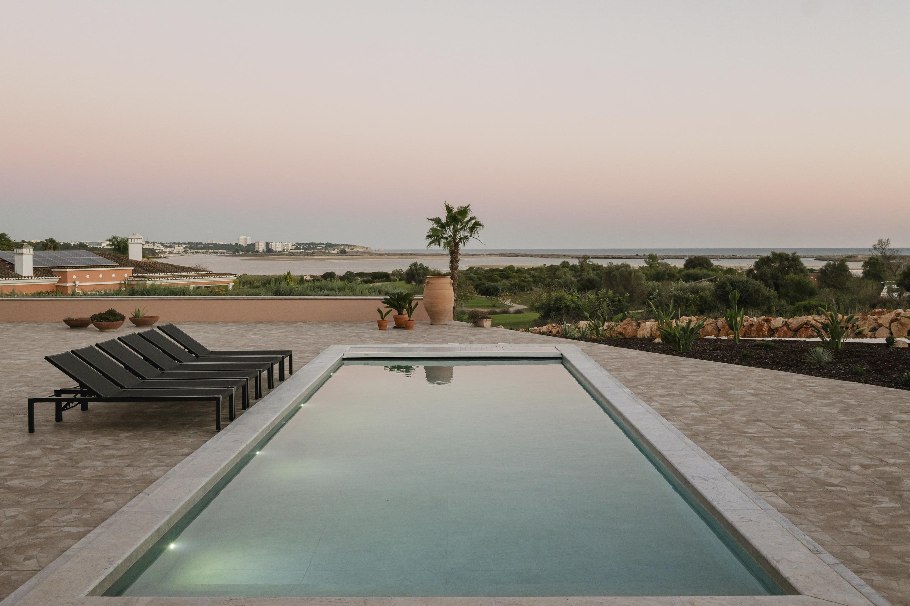 Set directly beside Palmares Golf Course (27 holes), Lagos Portugal, this newly finished contemporary villa pairs architectural purity with natural textures and cinematic views of the Atlantic Ocean and the softly rolling landscape of Palmares Golf. Light, openness and tranquility shape the interior atmosphere, creating a home for those who value elegance, comfort and timeless design.Positioned on a generous ±3,000 m² landscaped plot, the villa embraces its surroundings through expansive terraces, Mediterranean gardens and 170 m2 elevated rooftop areas that capture the shifting light throughout the day. A bright 384 m2 ground floor and a versatile 120 m2 lower level ensure effortless flow for both refined hosting and everyday living. With four refined suites, each with its own ensuite bathroom of which two independent guest residences, four Italian-designed kitchens, a heated saltwater pool, an outdoor shower, newly landscaped Mediterranean gardens and two rooftop terraces, this property stands as one of the Algarve’s most compelling contemporary homes — a rare blend of design, setting and lifestyle.