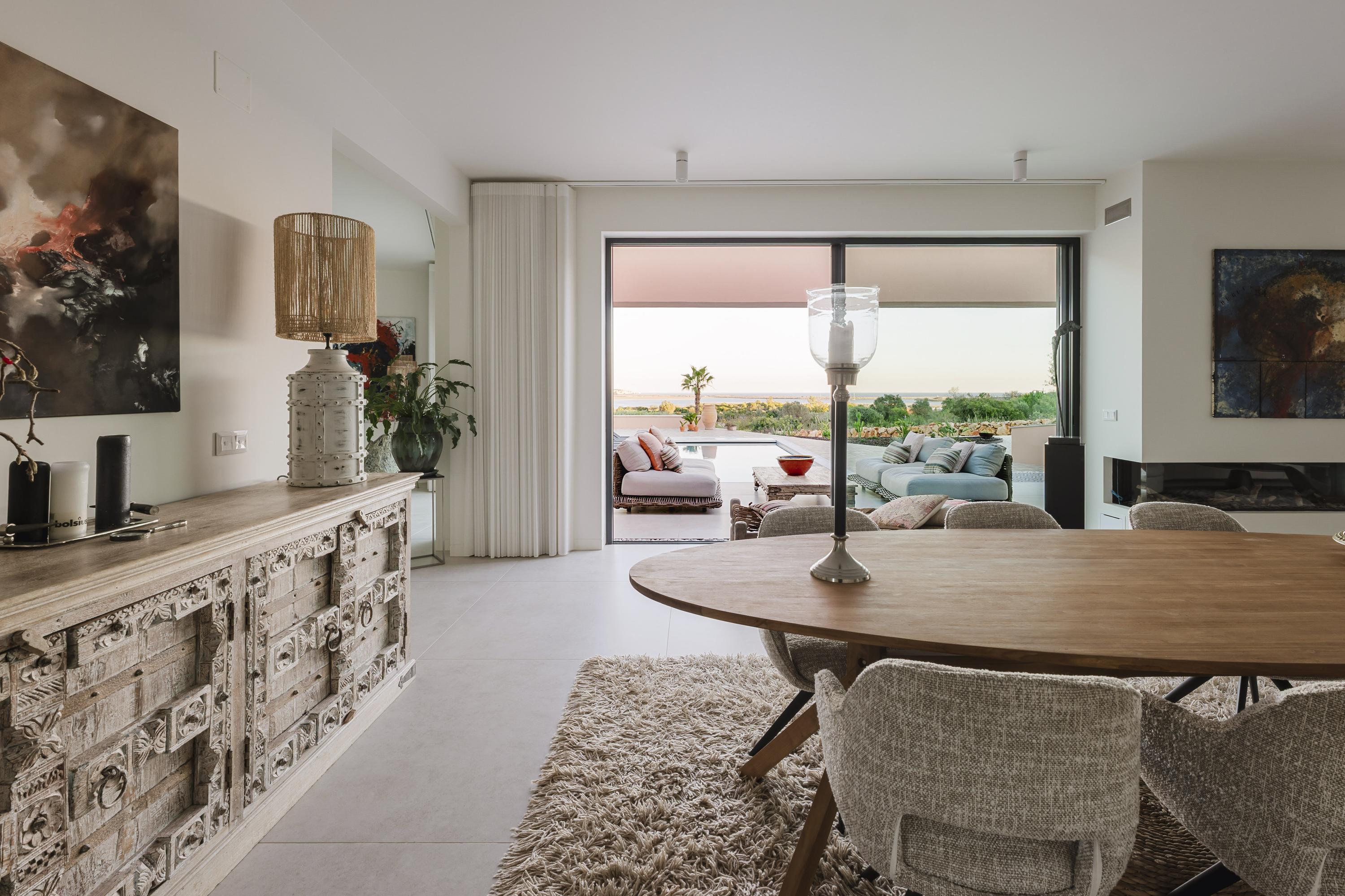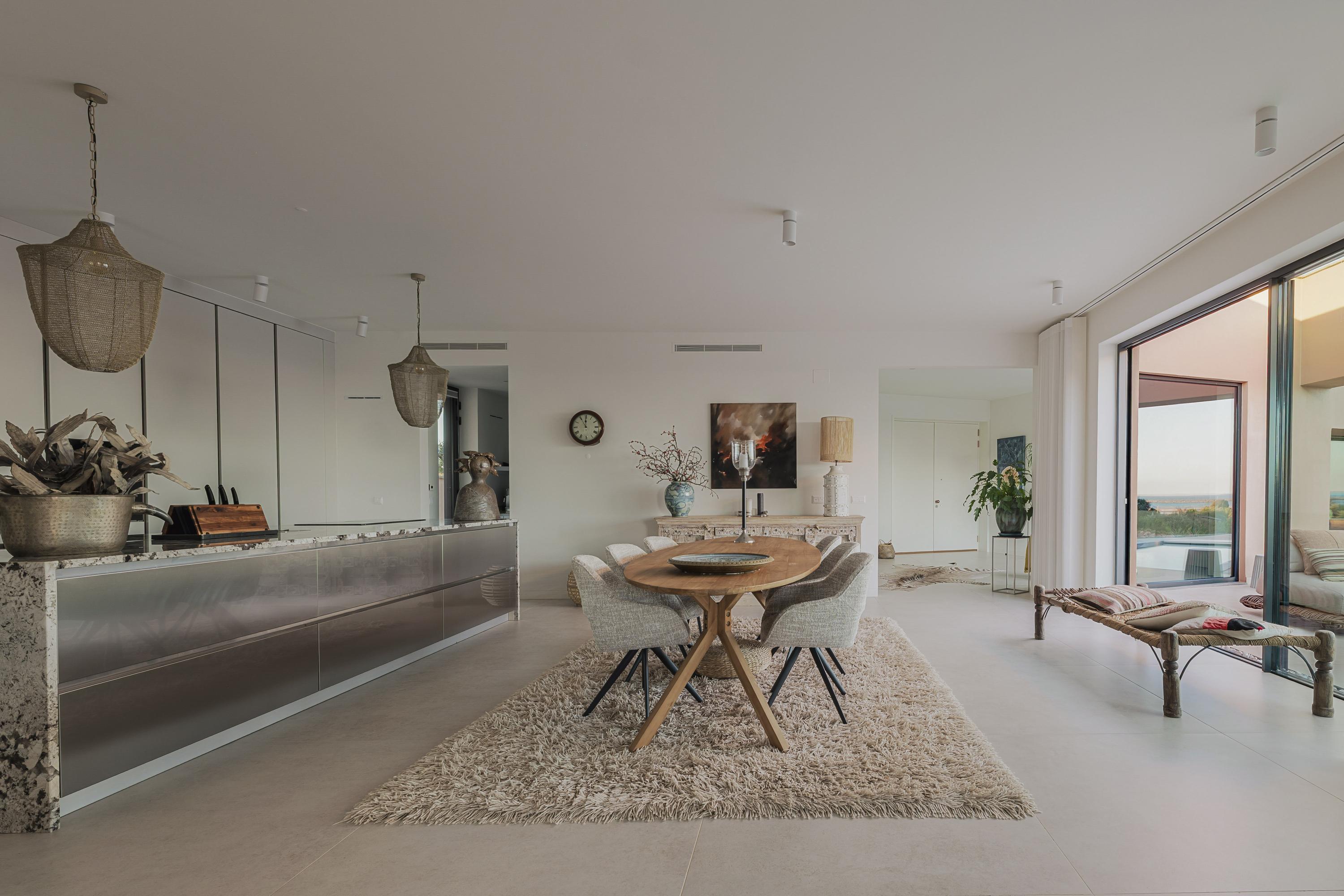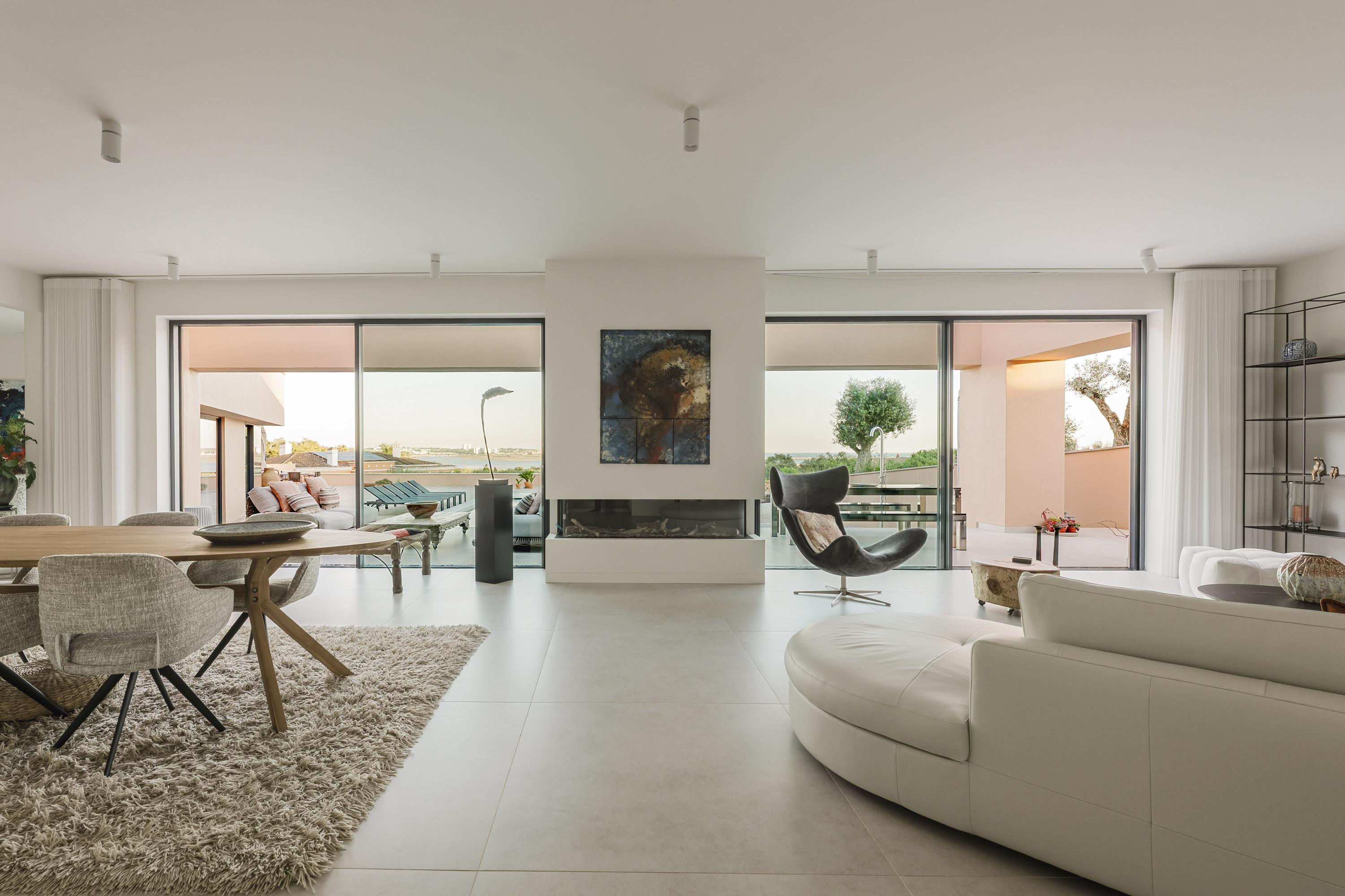 The main living room is luminous and inviting, with sweeping views of the Atlantic and the softly rolling landscape of Palmares Golf. Its seamless flow to the terrace and pool area creates an effortless indoor–outdoor atmosphere for both everyday living and refined hosting. The front terrace can optionally be enclosed in glass, forming an elegant all-season lounge or dining area without compromising the views.