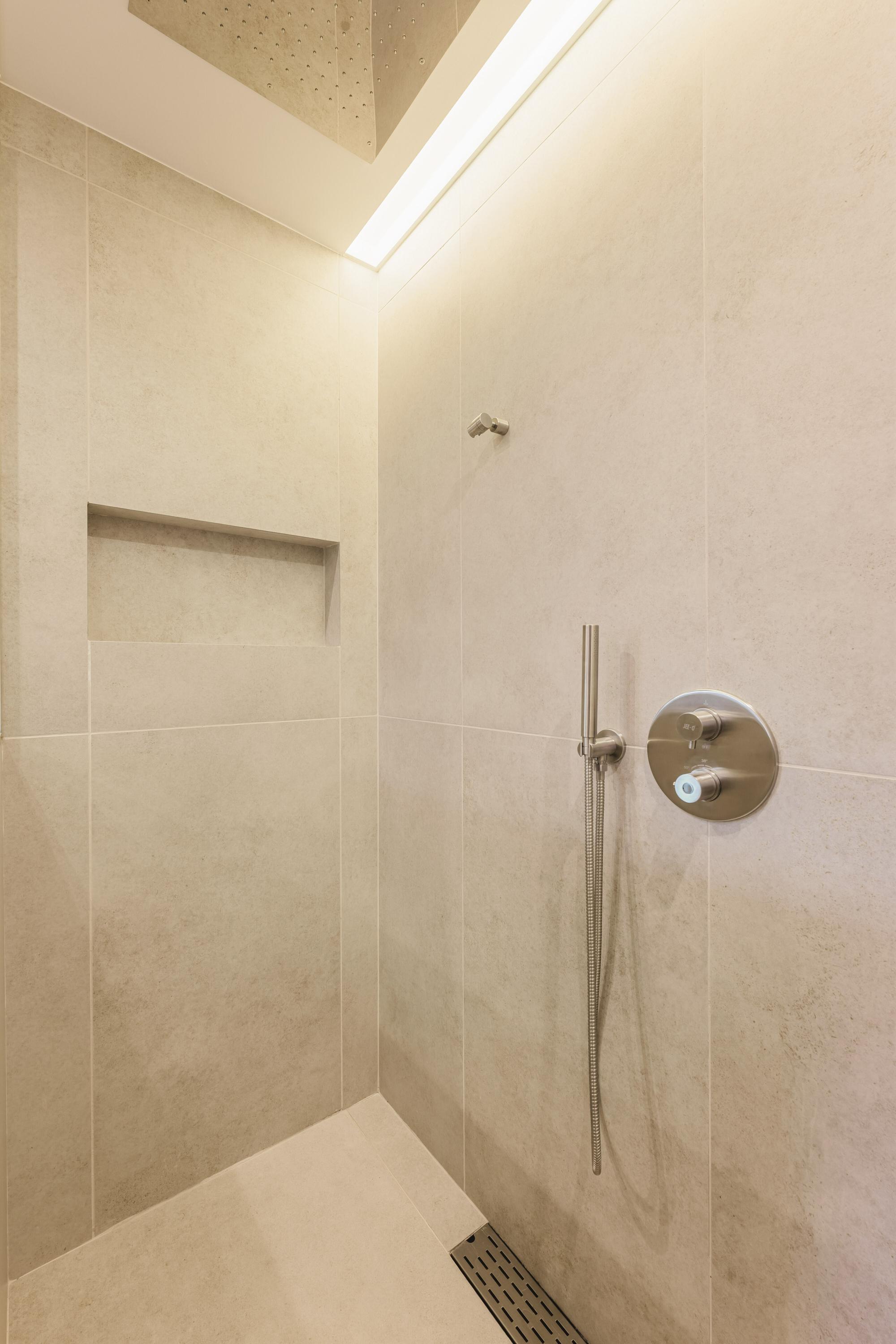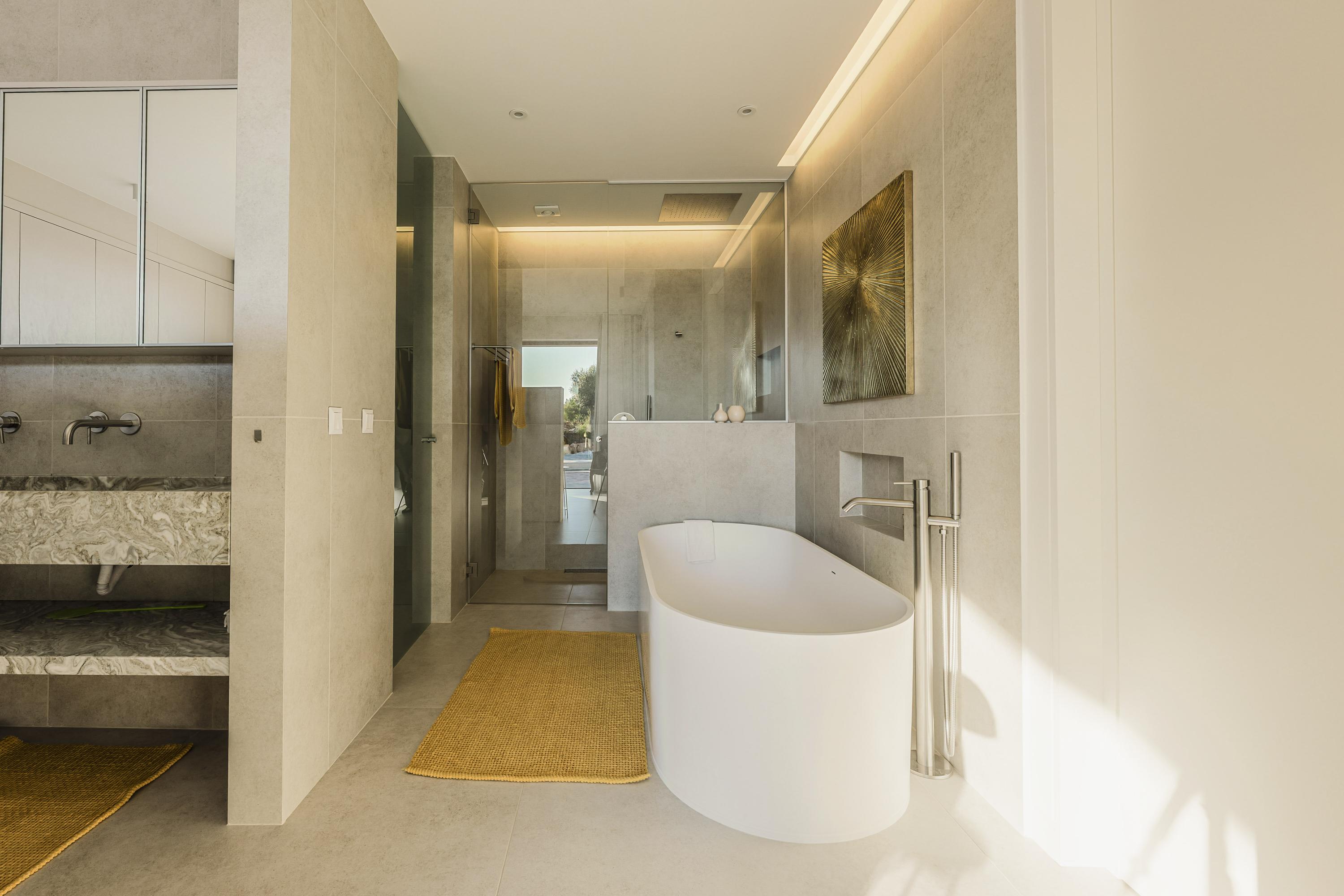 The newly landscaped garden has been thoughtfully designed to complement the villa’s architecture and natural surroundings. Mediterranean planting, mature olive trees and sculptural rock formations are paired with soft architectural lighting to create atmosphere and depth. A heated 14-meter saltwater pool with automatic AbriBleu solarpanel roll deck and outdoor JeeO shower form the centerpiece of this serene environment. Multiple terraces offer places for sun, shade and privacy throughout the day. As evening falls, the garden transforms into a warmly illuminated retreat — refined, intimate and deeply peaceful.