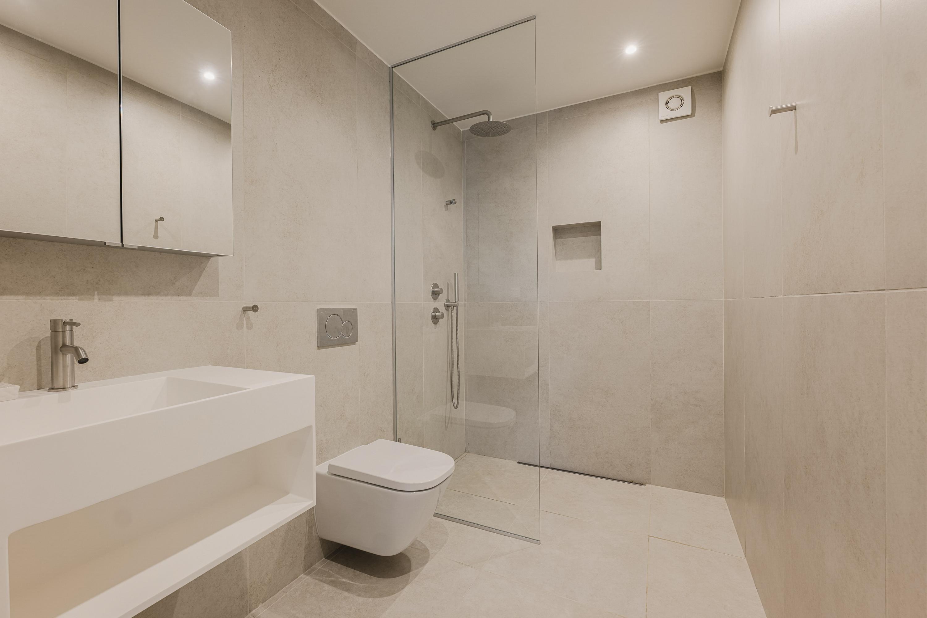 The ensuite bathroom features: an elegant marble double sink, freestanding bath, stone-clad walk-in rain shower, bidet and toilet. The walk-in wardrobe and dedicated shoe closet complete the suite.