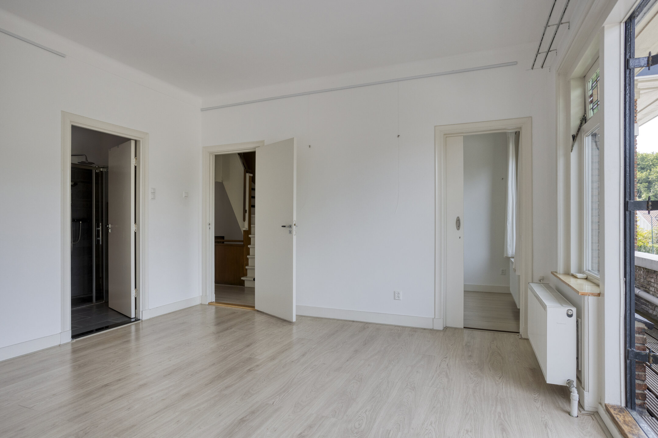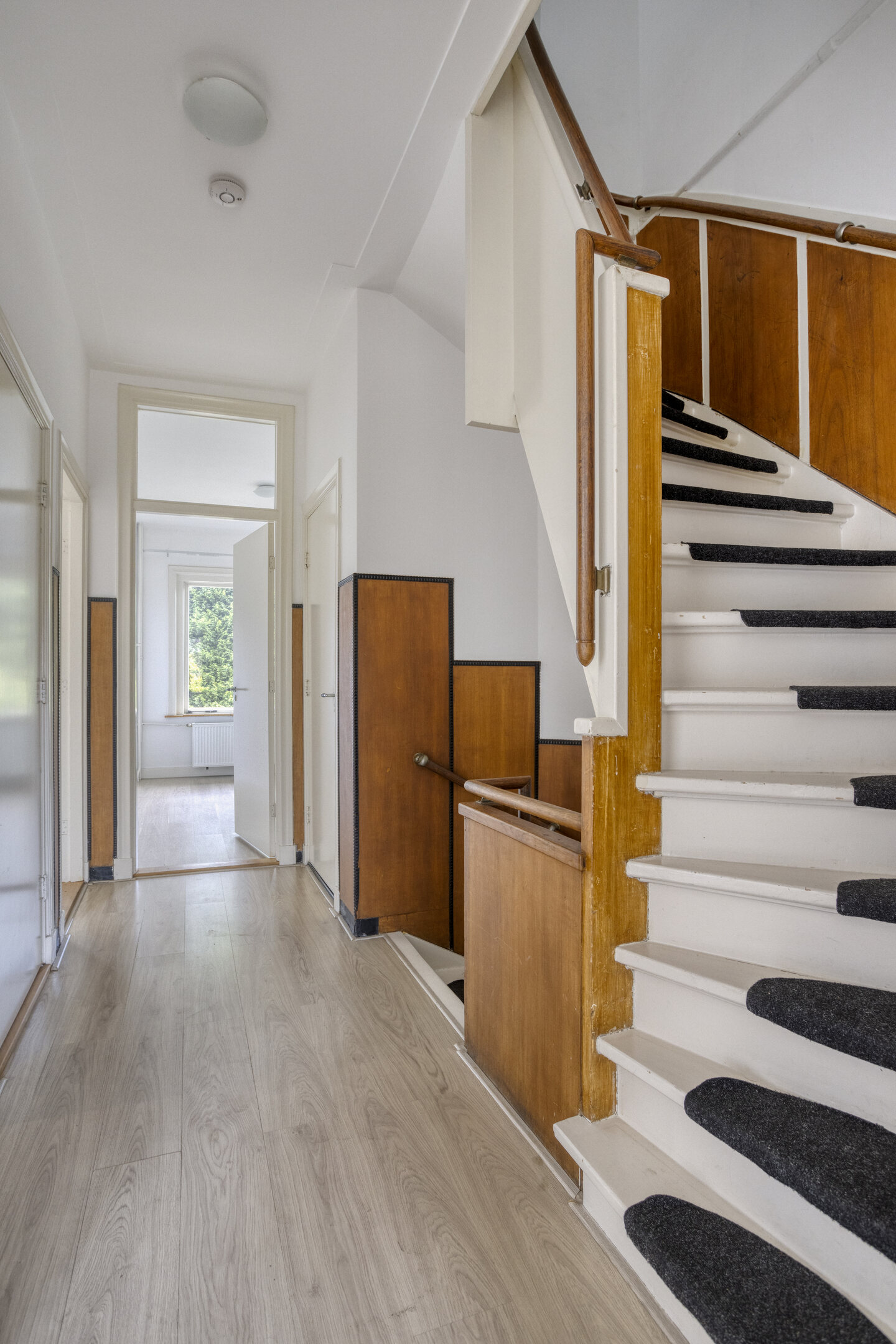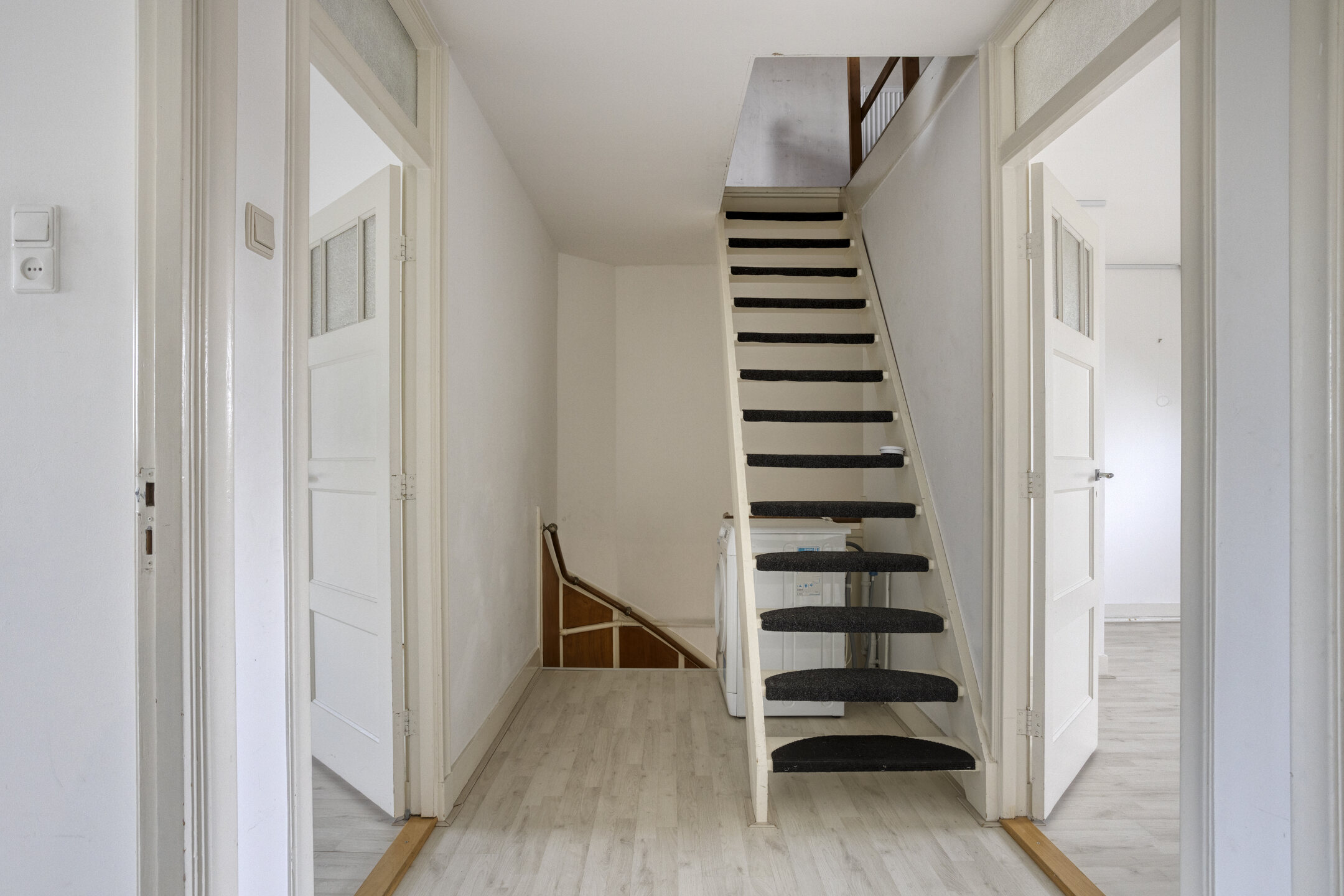 Characteristic staircase with original wainscoting. At the front is a spacious room with a side room and balcony. At the rear is a spacious bedroom with a balcony, a fourth room (currently used as a laundry room), and a centrally located bathroom with a bathtub, walk-in shower, double sink, and bidet. A separate toilet is located on the landing.