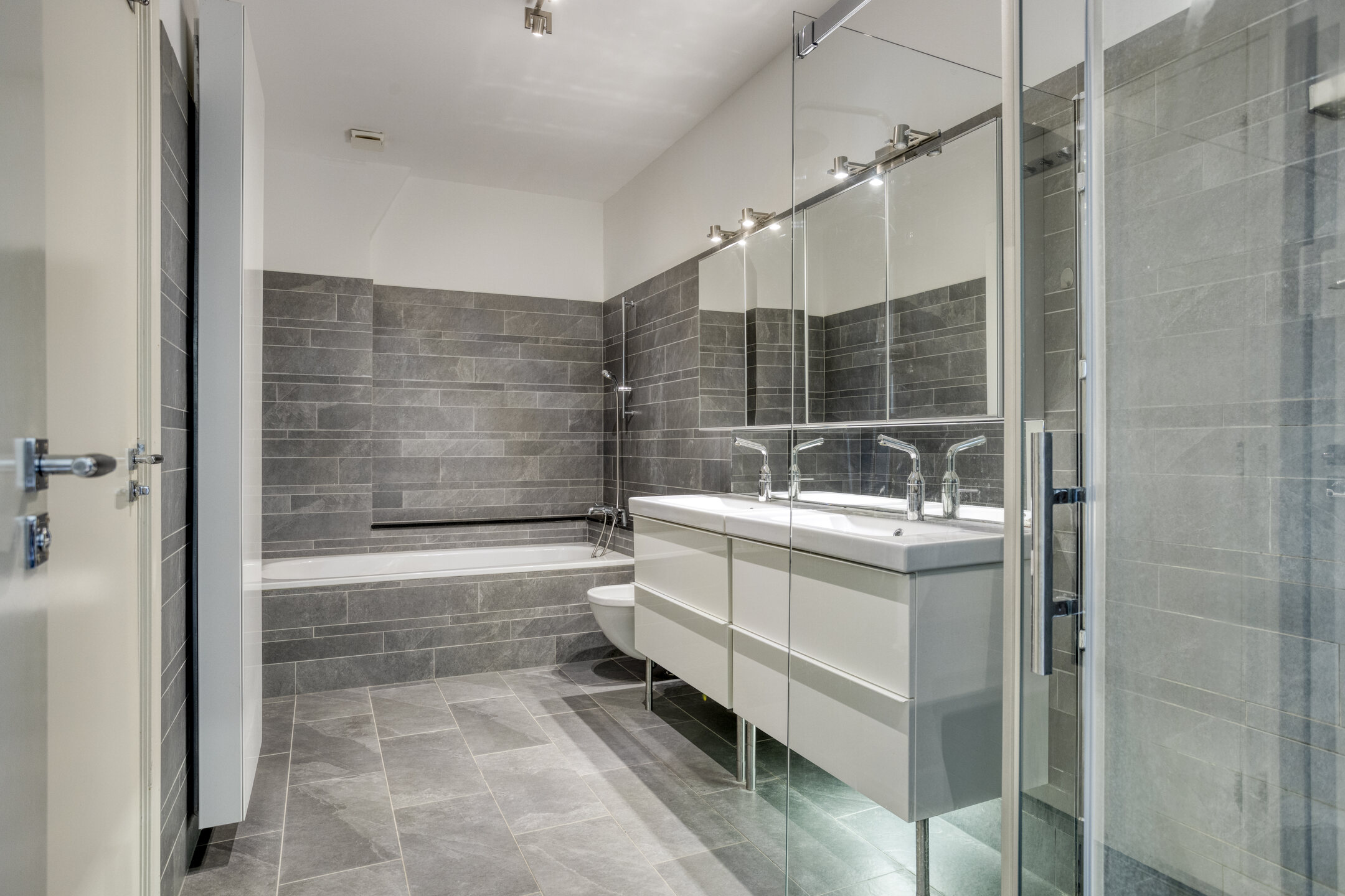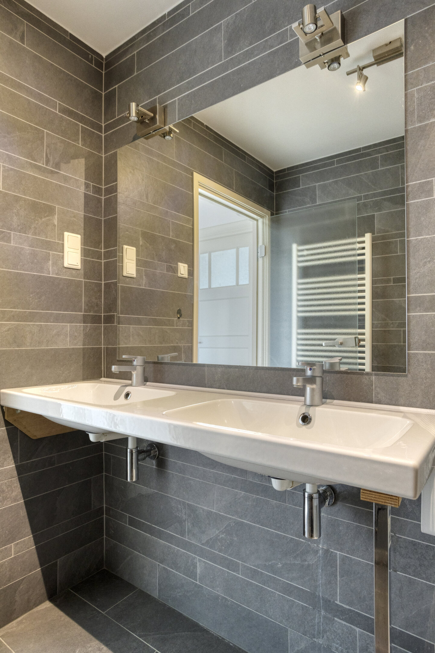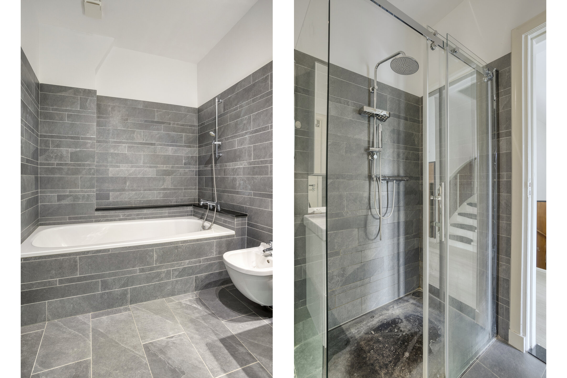 Characteristic staircase with original wainscoting. At the front is a spacious room with a side room and balcony. At the rear is a spacious bedroom with a balcony, a fourth room (currently used as a laundry room), and a centrally located bathroom with a bathtub, walk-in shower, double sink, and bidet. A separate toilet is located on the landing.