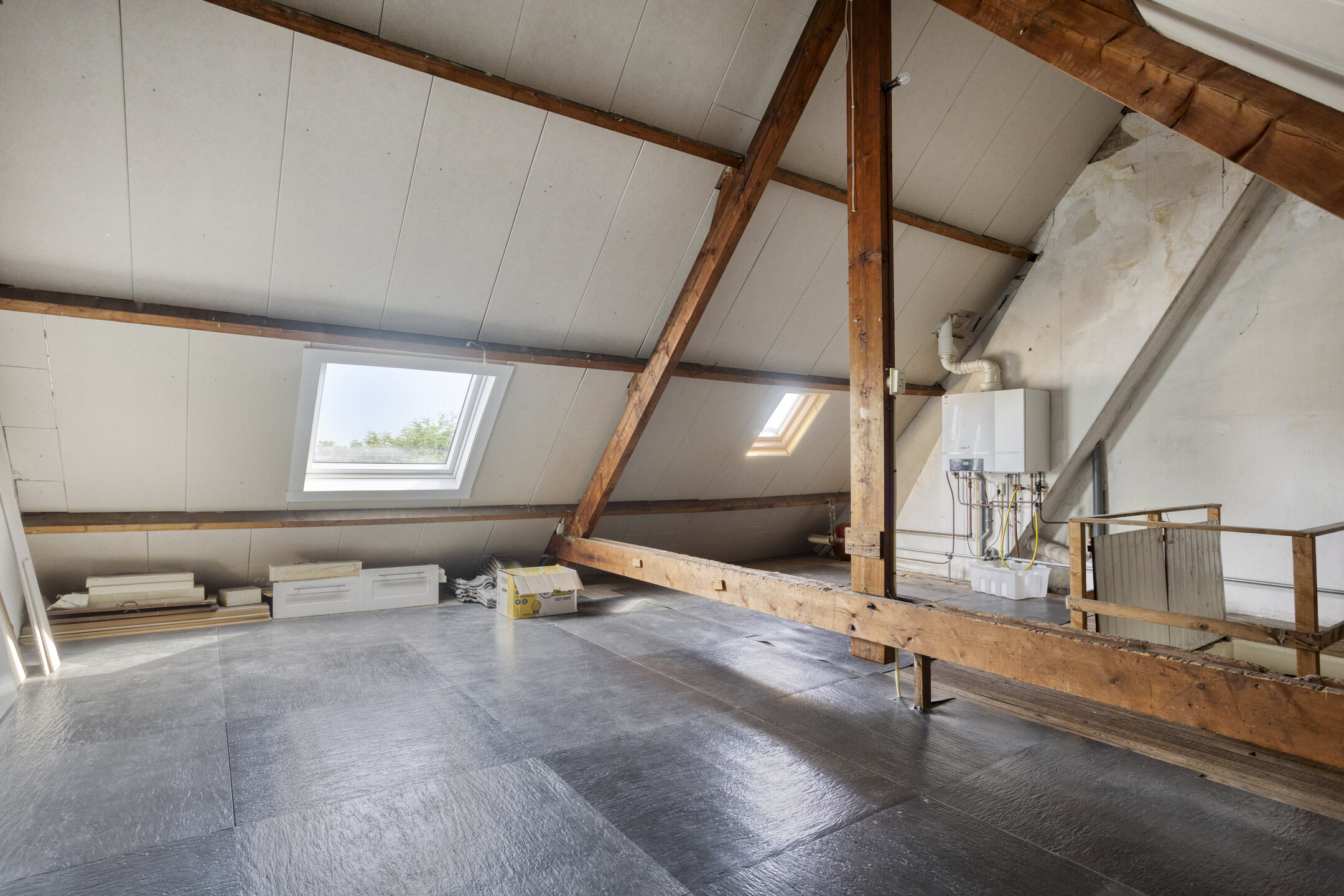 Accessible via a fixed staircase: a spacious attic with an impressive ridge height (approx. 4 m) and abundant natural light through pivoting windows. The high-efficiency central heating boiler is also located here.
