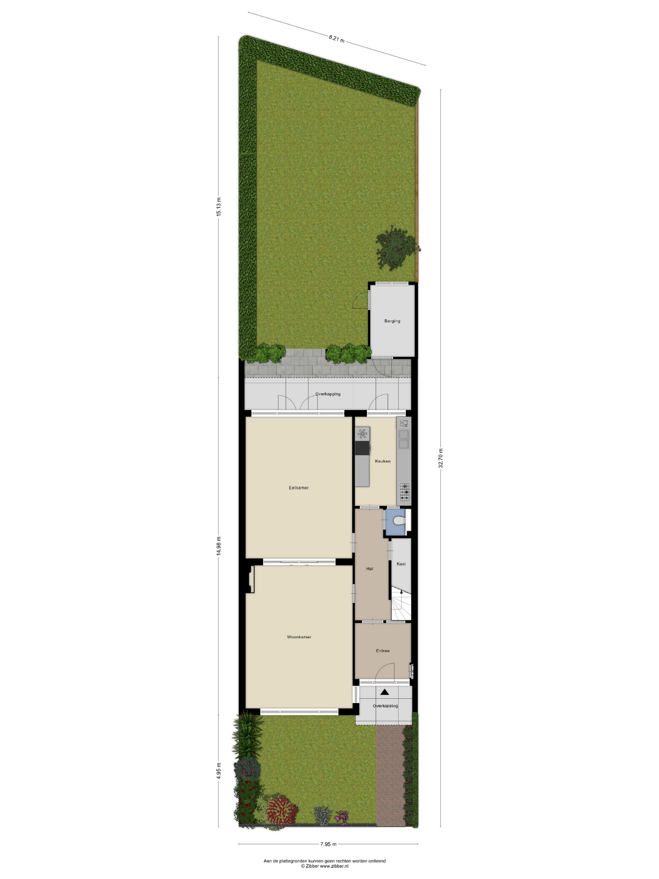 Entrance with vestibule and hallway, featuring a guest toilet and under-stairs cupboard. The spacious living room (approx. 60 m²) has wooden flooring and en suite doors leading to the dining room, which also opens onto the garden. The modern kitchen is fully equipped and also provides access to the garden. The rear of the house is not directly adjacent to any neighbors, ensuring complete privacy.