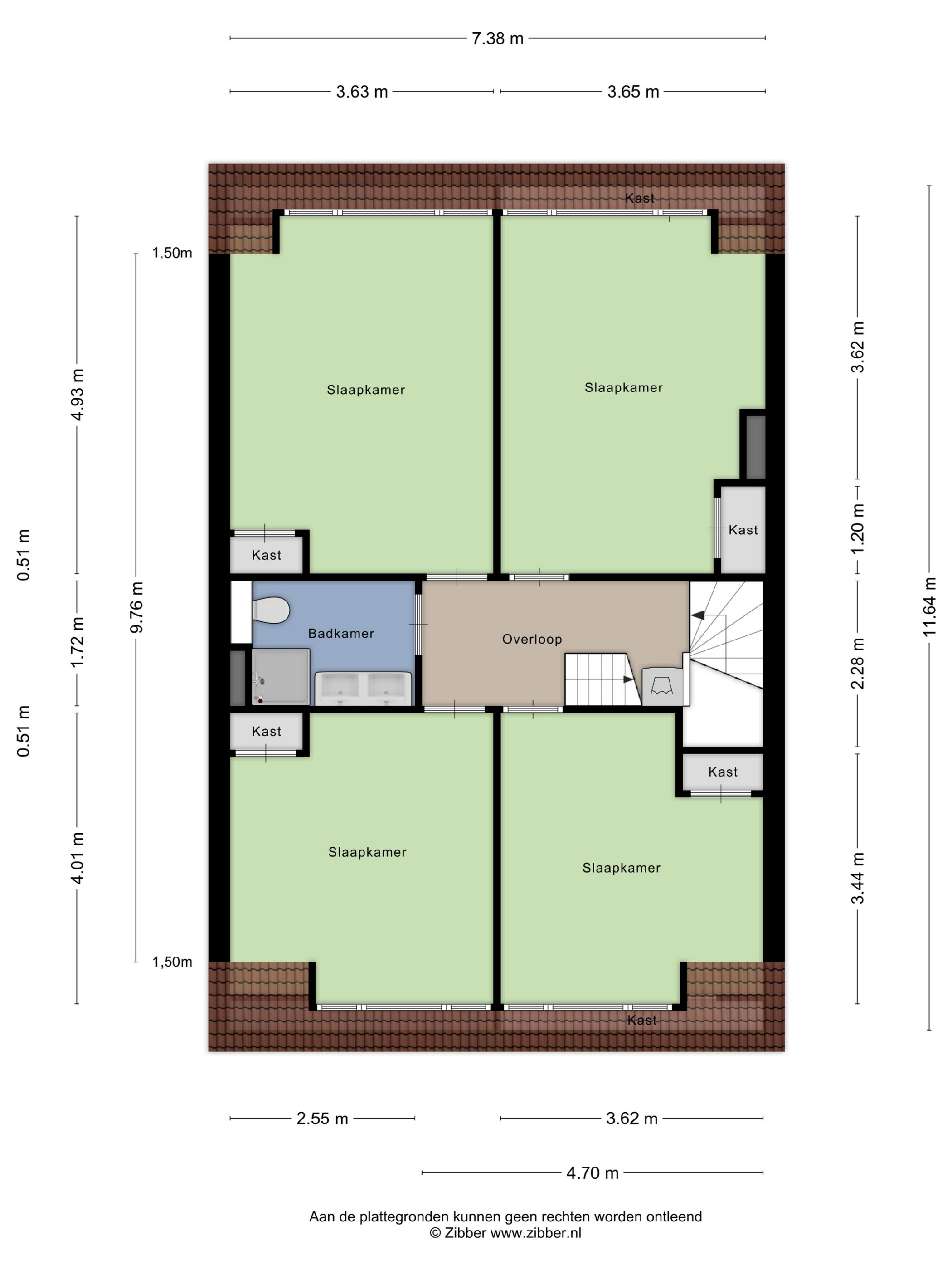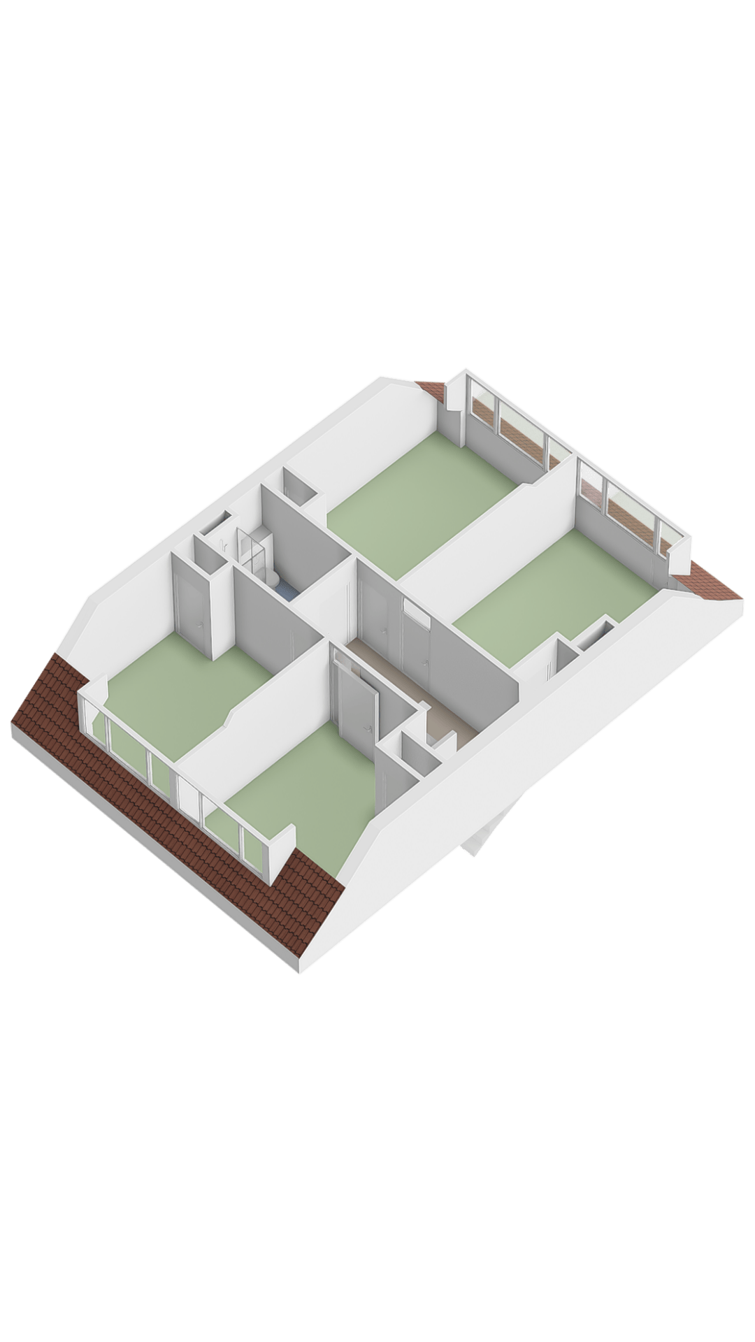 Landing with access to four spacious bedrooms, each with dormer windows. A second bathroom with a shower, toilet, and double sink. Additional storage space is located behind the sloping walls.