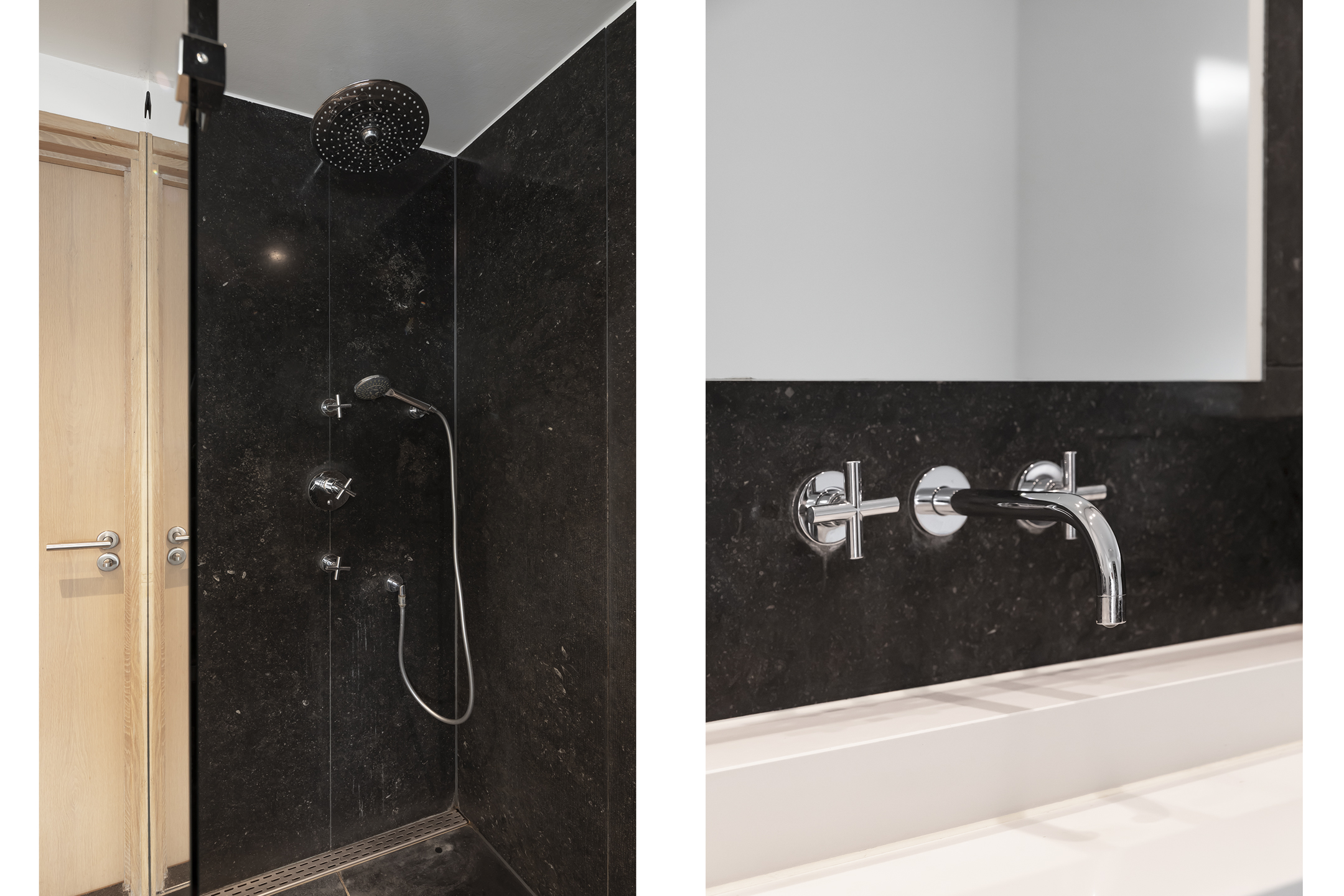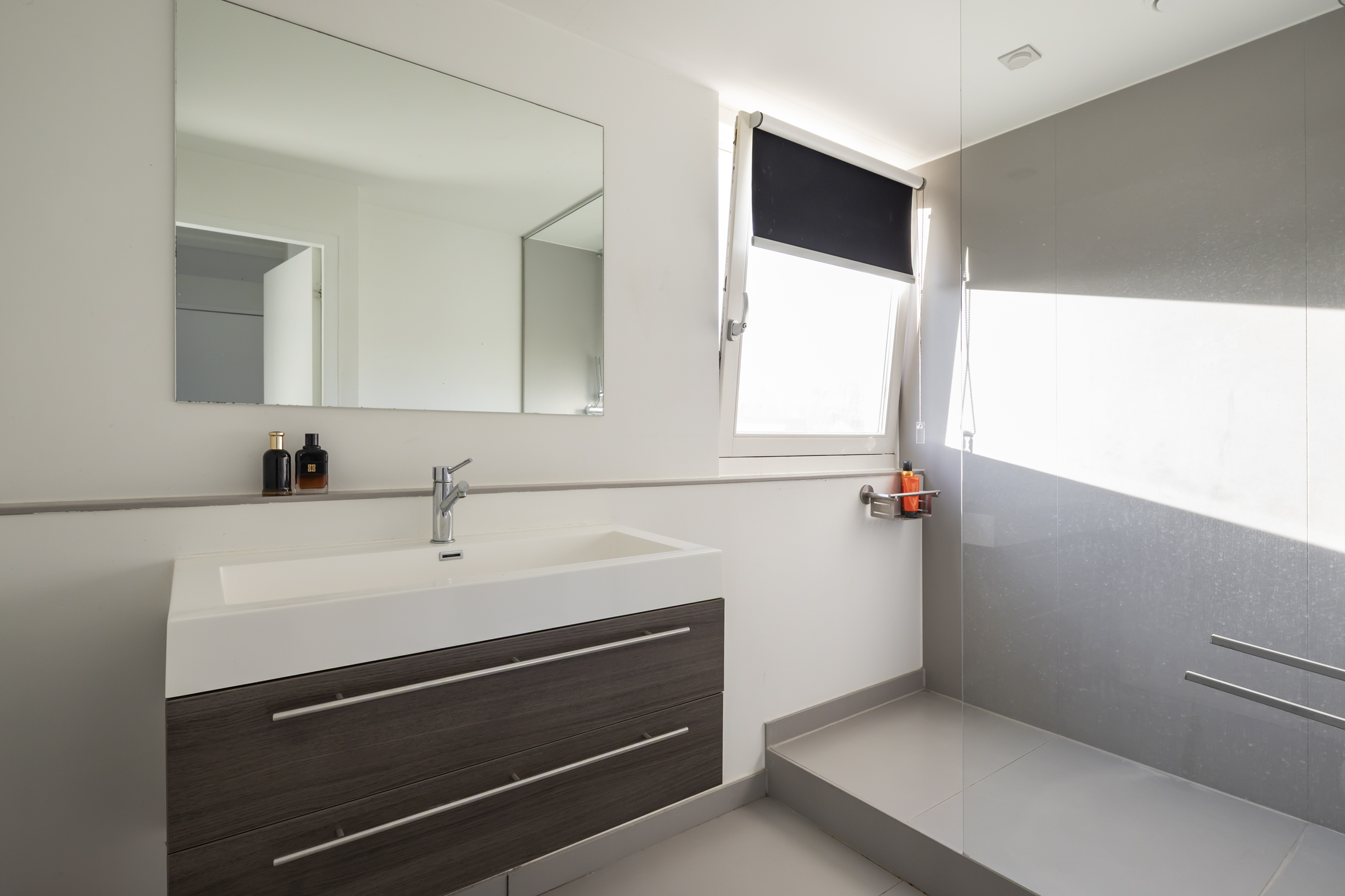 The modern bathroom is fully equipped, neatly tiled, has natural daylight, and underfloor heating. It features a double sink, a comfortable bathtub, and a spacious walk-in shower. The separate toilet is accessible from the landing.