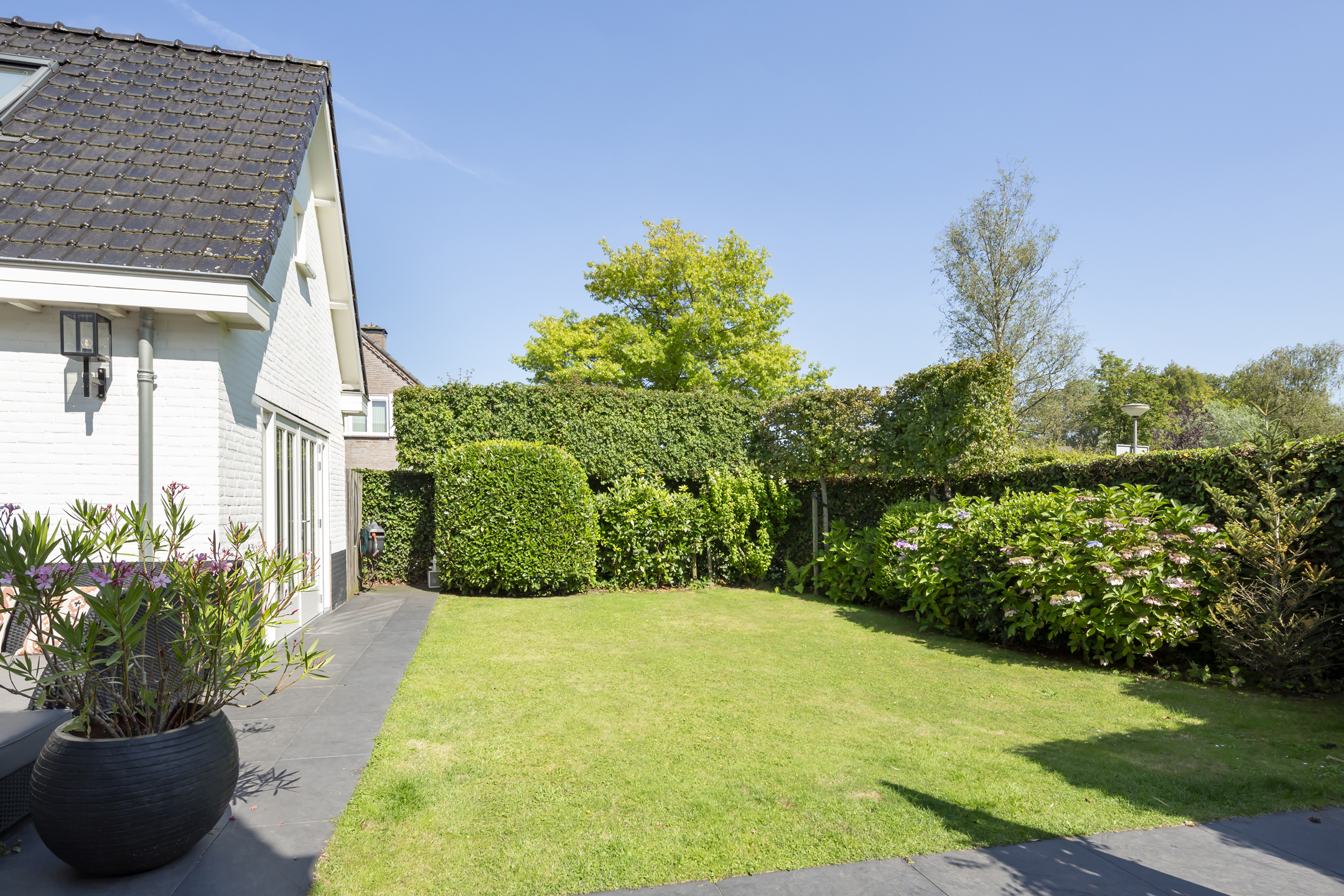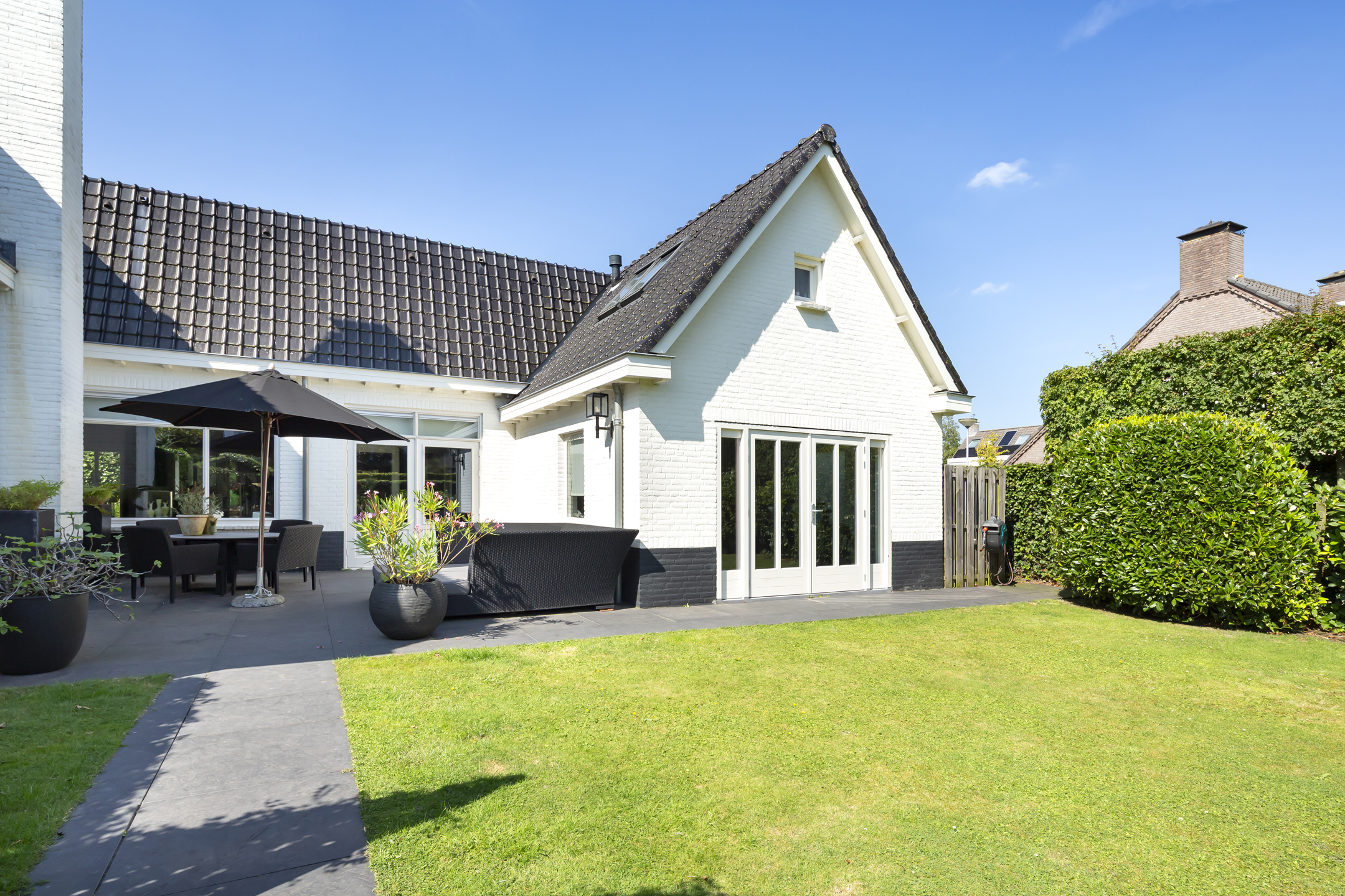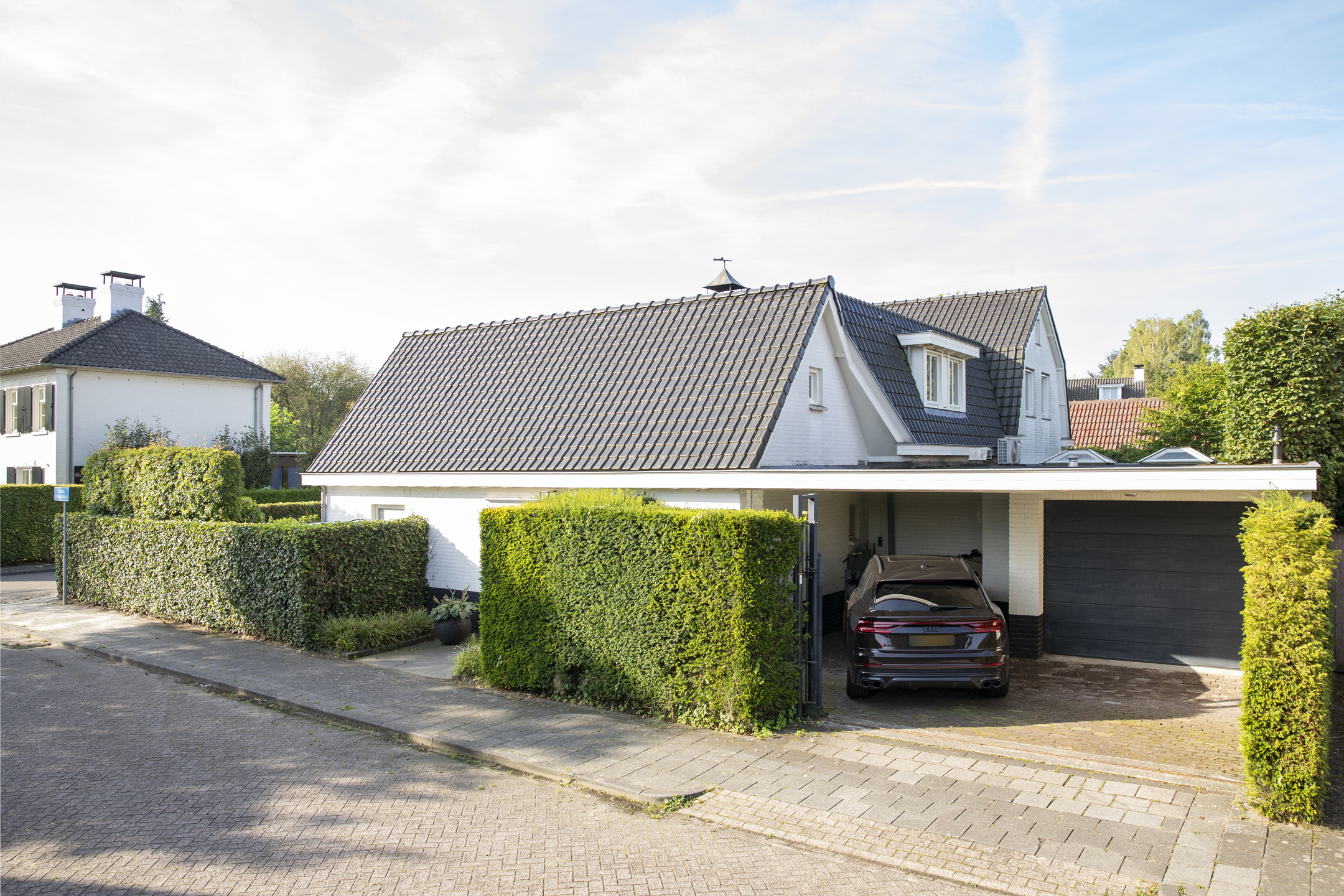 Outside, two distinct gardens allow for year-round enjoyment and complete privacy, with mature planting and stone paving. The property includes off street parking for multiple vehicles behind secure gates, and the garage is accessible from both the front and the rear. Extensive insulation and modern heating underline comfort. The location provides immediate access to natural reserves, cultural destinations, and the vibrant life of Oisterwijk, recognized for its rich amenities and green surroundings.