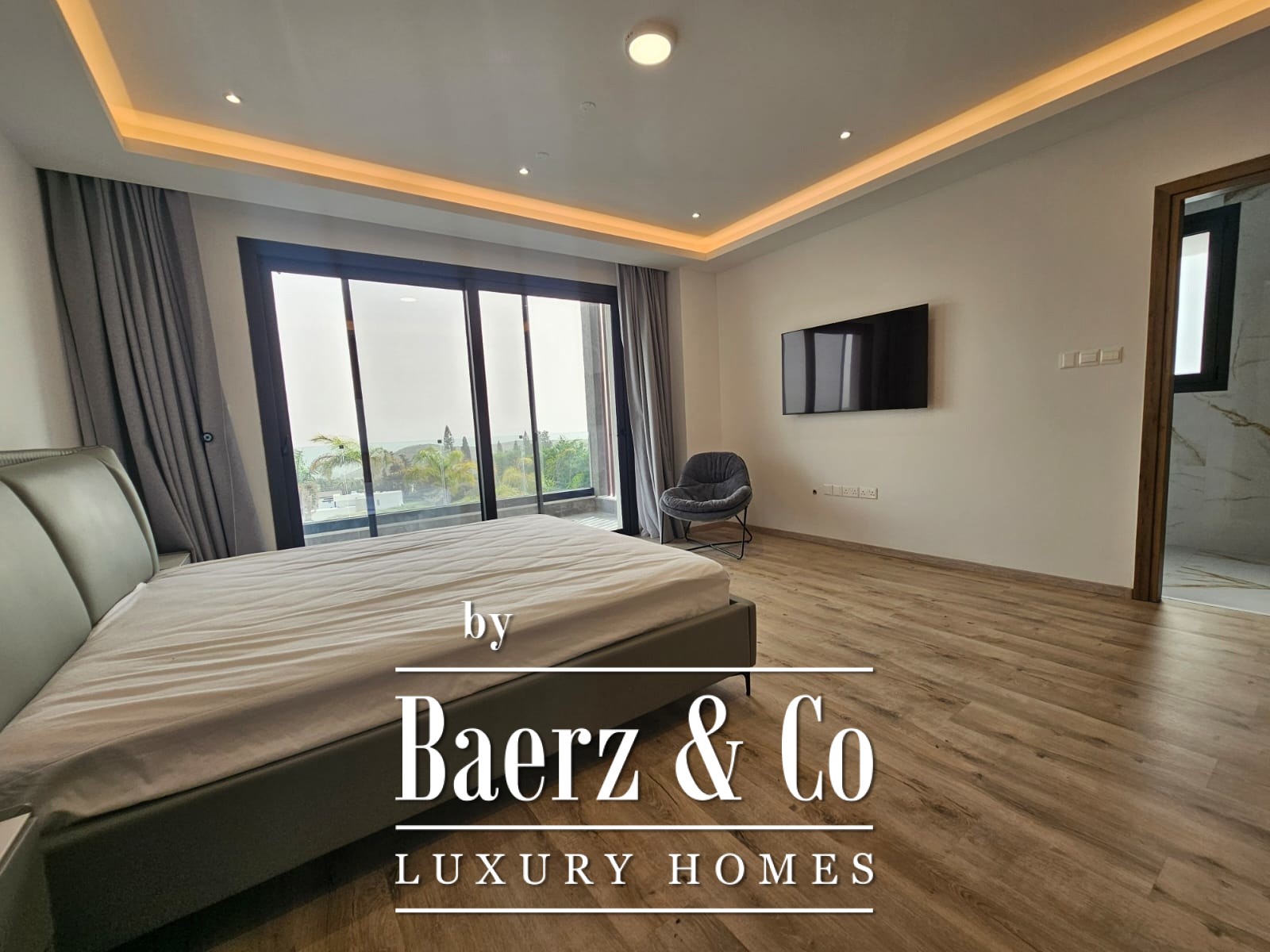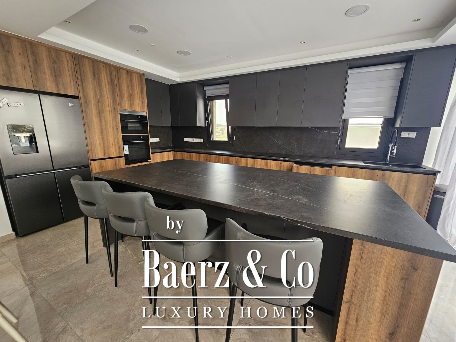 Outdoors, the landscaped garden frames a private swimming pool and BBQ area, complemented by a poolside shower and toilet. Eight parking spaces, ample storage, a security door, and a dedicated service room complete the offering. This villa defines high-end living for those drawn to the unique panorama and tranquility of Parekklisia.