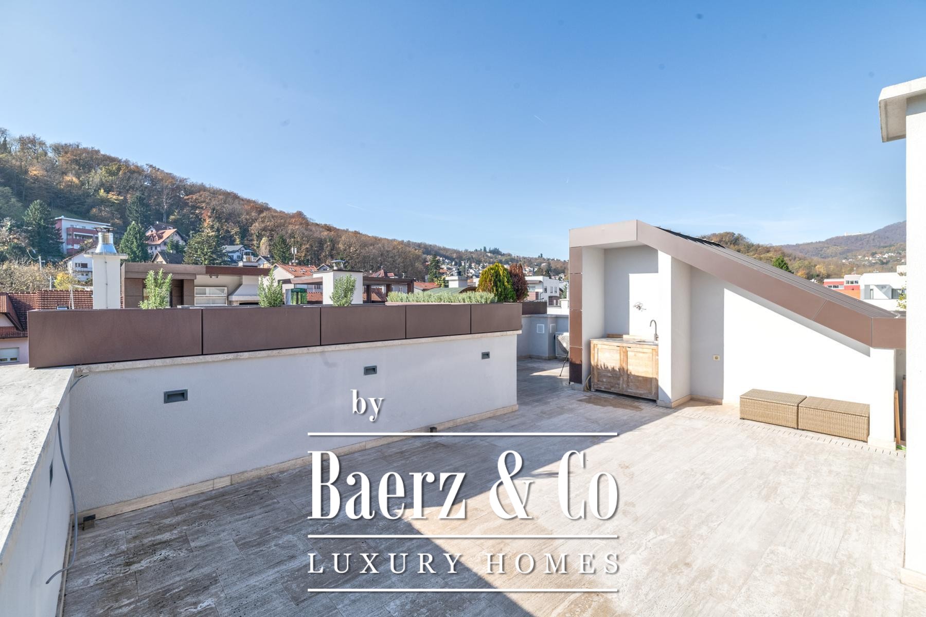 A 47 m² covered roof terrace, air conditioning in all principal spaces, gas central heating, and underfloor warmth in the kitchen and bathrooms add to the comfort. Open views reach to Sljeme and Medvednica, reinforcing a feeling of quiet seclusion. Three dedicated outdoor parking spaces are included. Nearby, the Mihaljevec interchange grants access to tram and bus links, with excellent proximity to schools, shops, and Zagreb’s central Bana Jelačić Square.