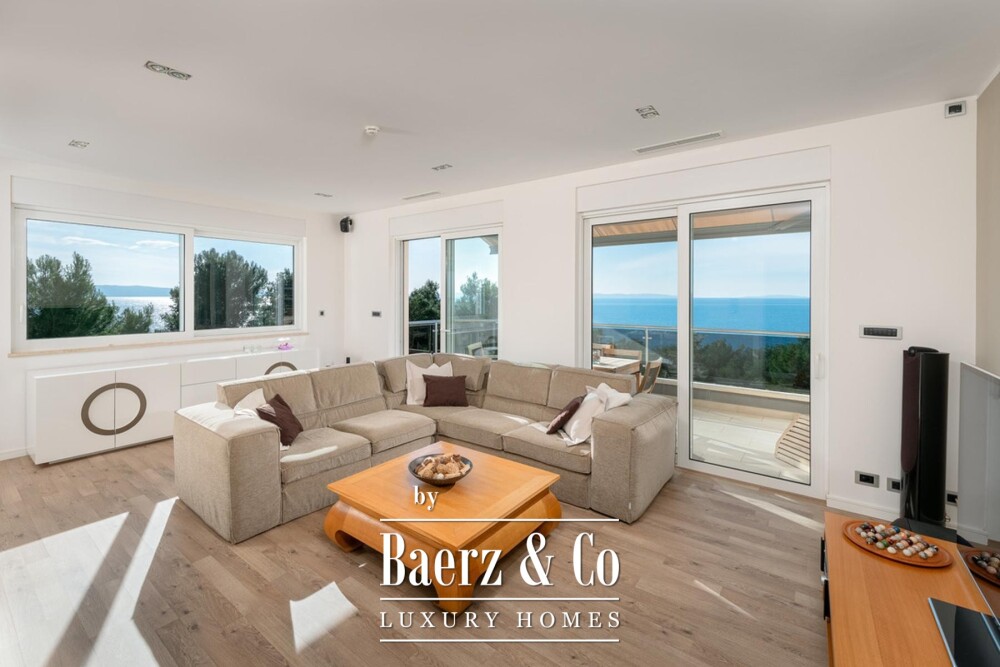 Three terraces, totaling 18.38 m², frame panoramic vistas of the Adriatic, the outlook protected and unchanging. The living areas are bathed in natural light, accentuated by extensive glazing and optimal orientation. A dedicated workroom houses laundry amenities, and a separate wardrobe enhances organization. Throughout, a smart system integrates underfloor heating, air conditioning, air recovery, alarm and smoke detectors, a central vacuum system, solar panels for hot water, electric roller shutters and awnings, and high-end appliances. A traditional brick fireplace on the terrace invites connection with the Dalmatian outdoors.