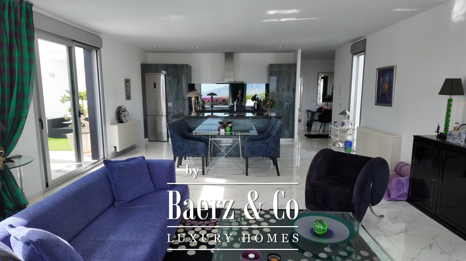 The villa reveals its purpose through an open-plan living and dining area, seamlessly connected to a designer kitchen featuring a central island. Two bedrooms include a principal suite, with a dedicated dressing room, en suite bath, and private access to the terrace. Expanses of glass ensure each space is bright and open to the outdoors.