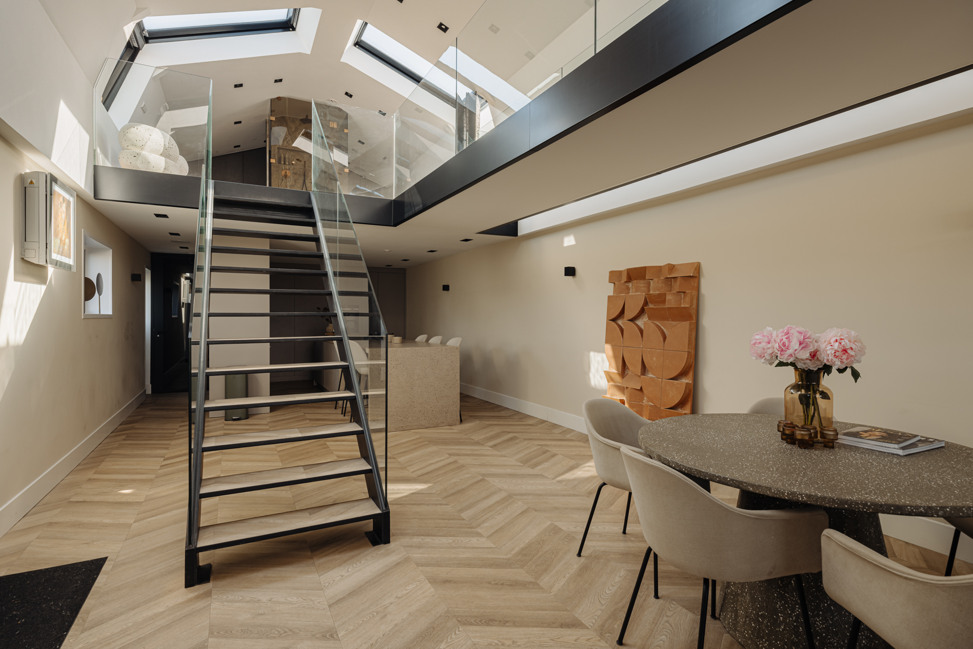The beautiful detached guest house is a highly versatile space, offering stunning panoramic views of the water and surrounding fields. A central open atrium with a staircase connects the two floors. Its potential uses are endless.