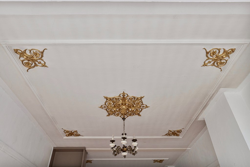 This inviting space offers room for a comfortable sitting area and a generous dining area. Characteristic features such as a charming mantelpiece, decorative ceiling ornaments, and a warm wooden floor give the room a cozy and elegant look. With some modern updates, this room can easily be transformed to match your personal style.