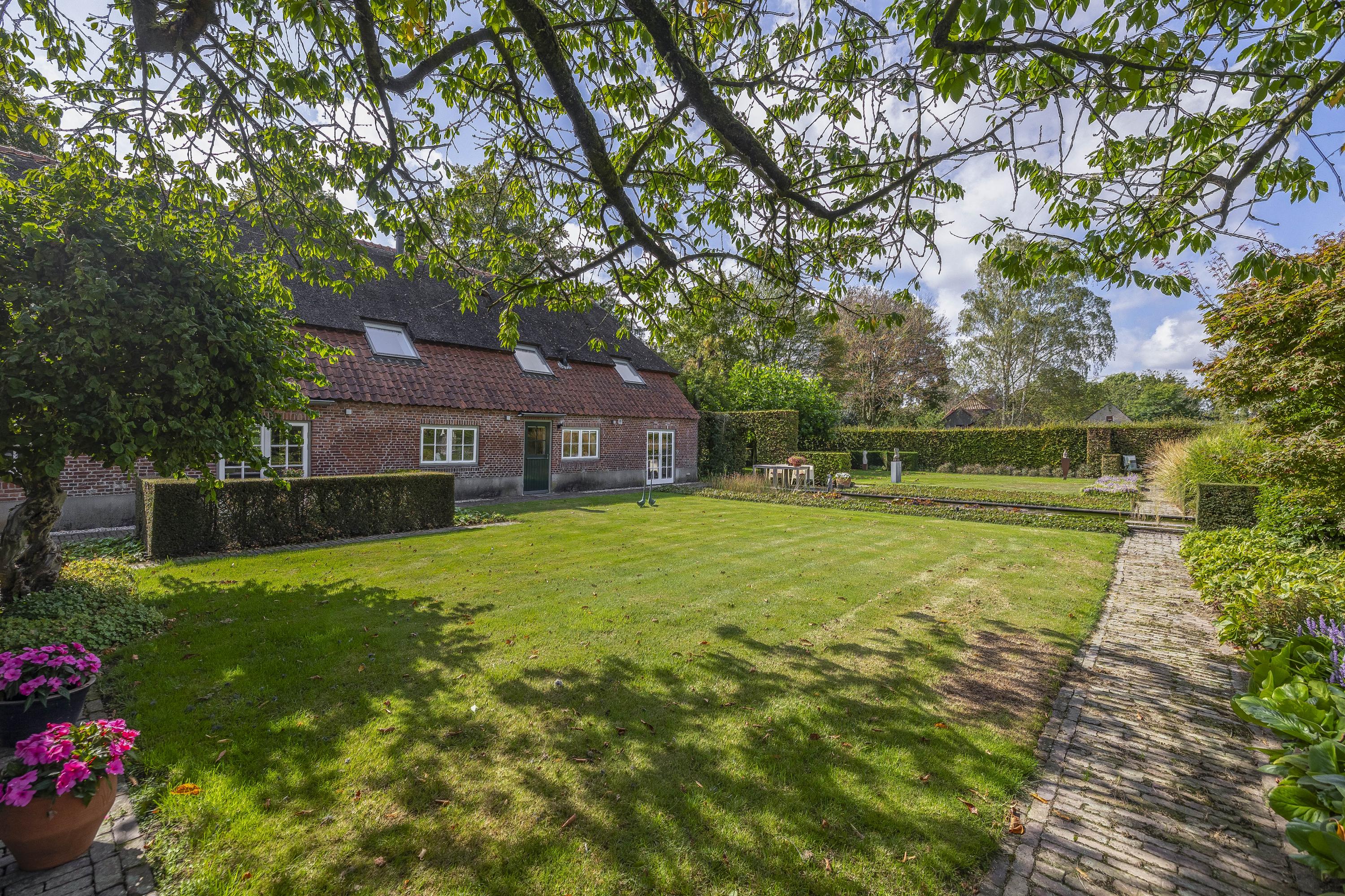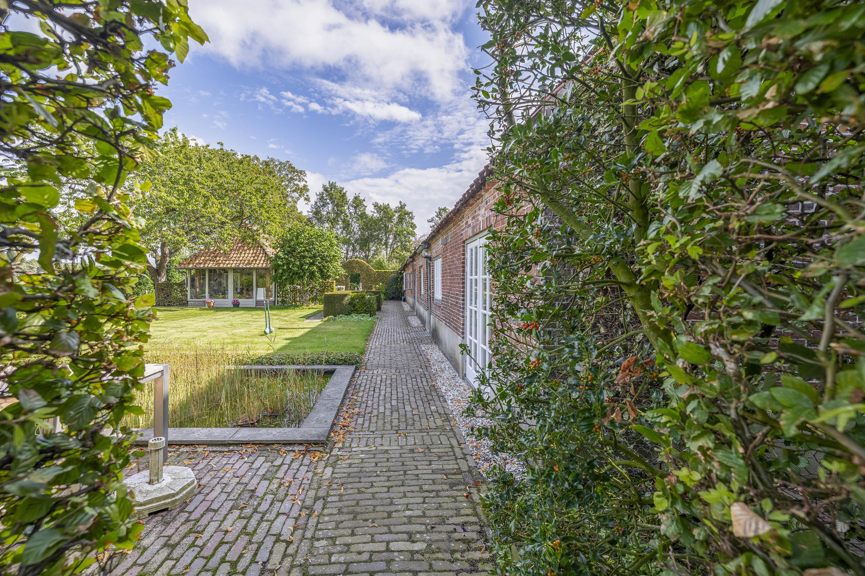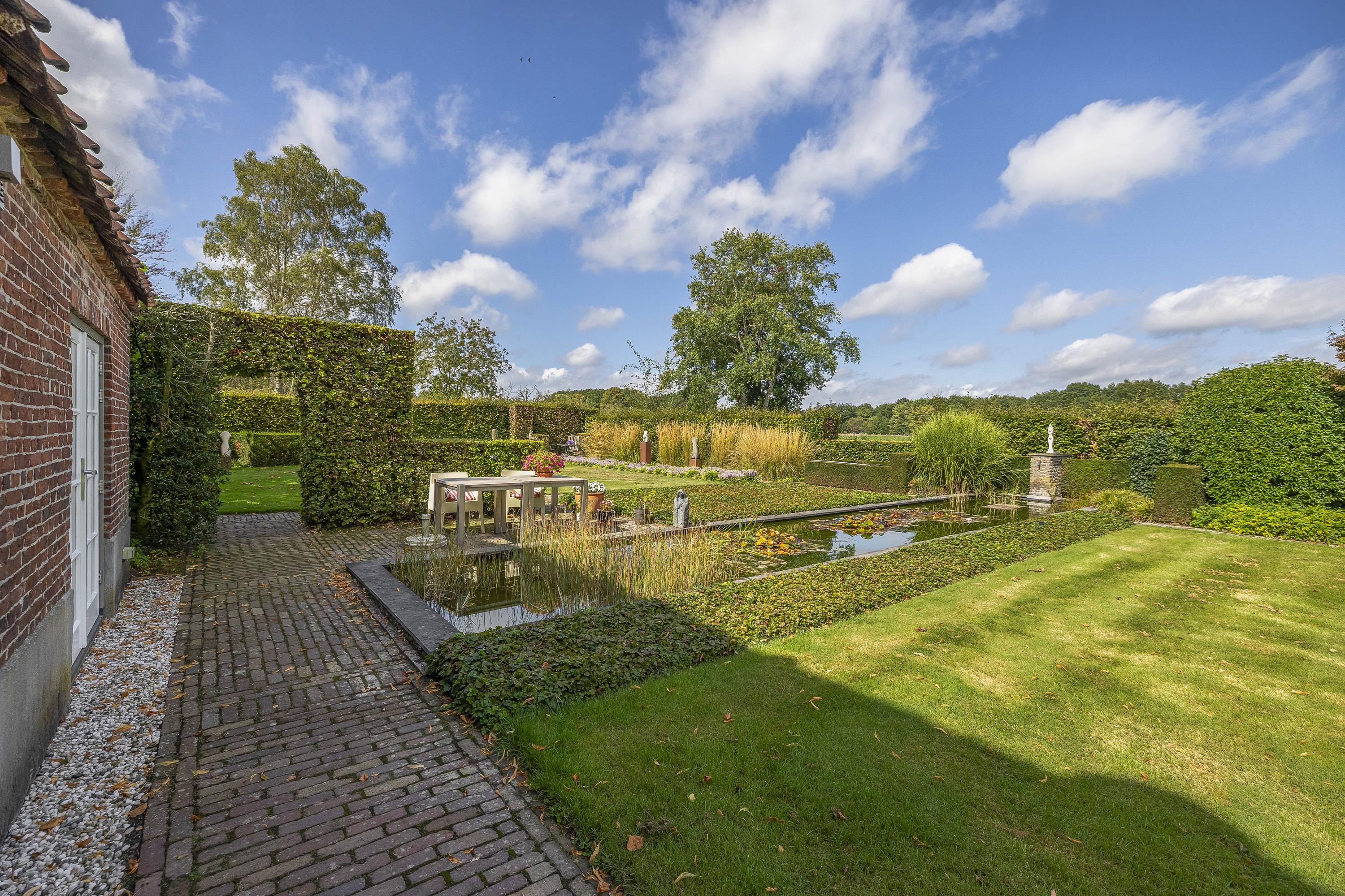 Behind the house and on the sides is a beautifully landscaped garden. On the left side is a nice, spacious area with a lawn, plant borders, old baked clinker paving, and various beech hedges. At the rear, you can enjoy a beautiful view, a large pond (with biological filter), a spacious lawn, plant borders, and mature vegetation. The garden is well laid out and well maintained. There is a double driveway on the right side of the property. The garden even offers the possibility of keeping small animals. There is also a section of the garden with a “lovers' lane.” To the left of the house is a landscaped jeu-de-boules court.