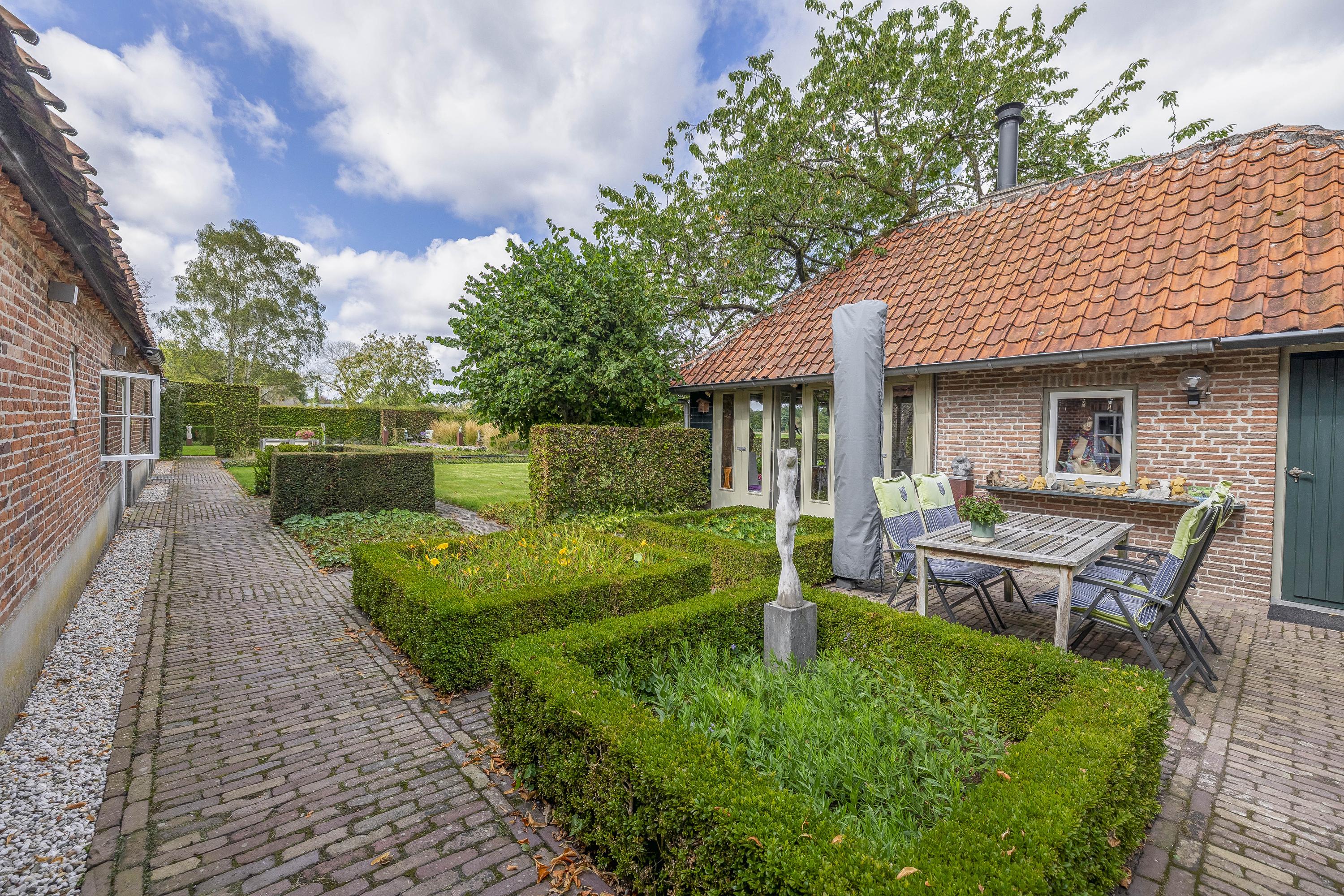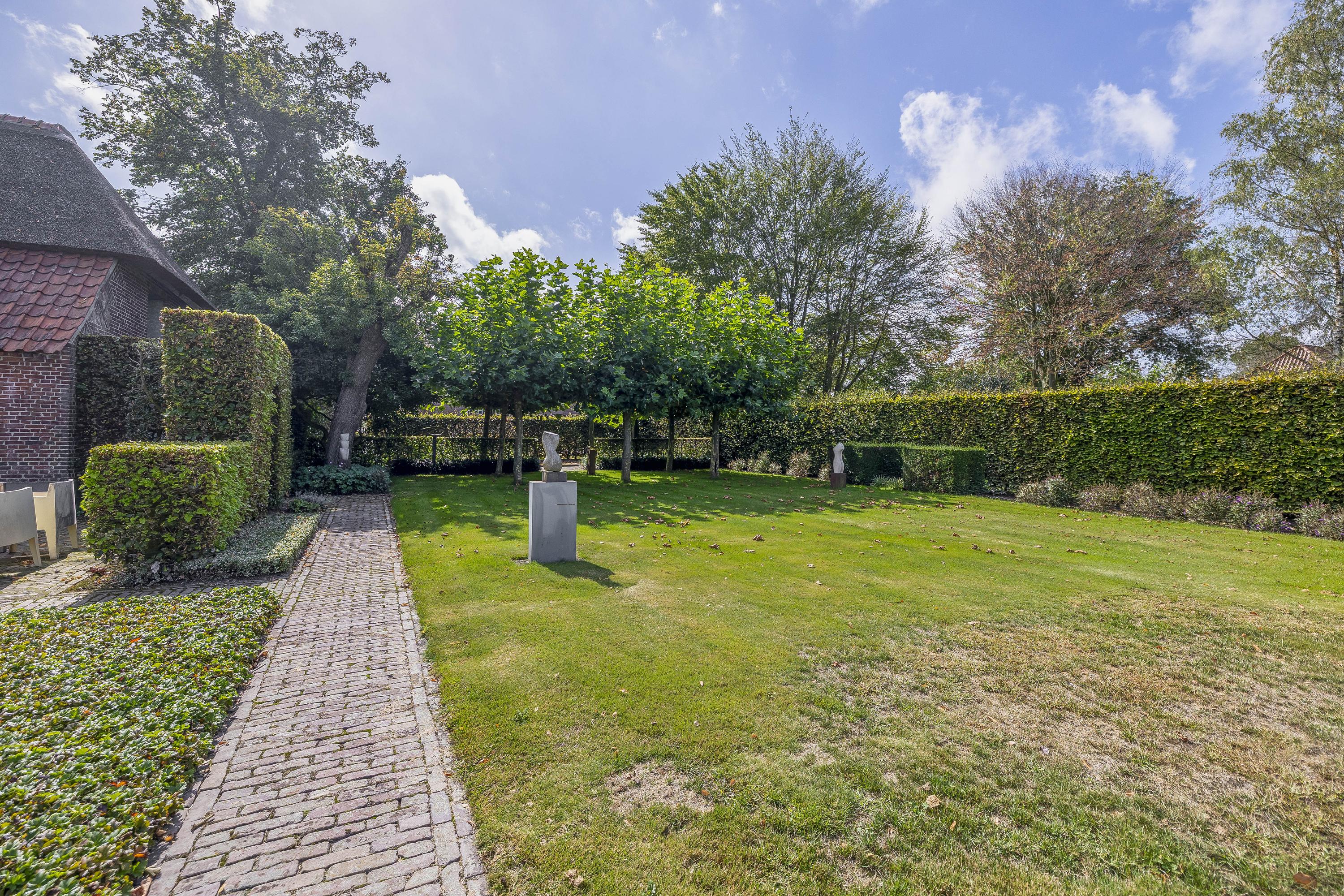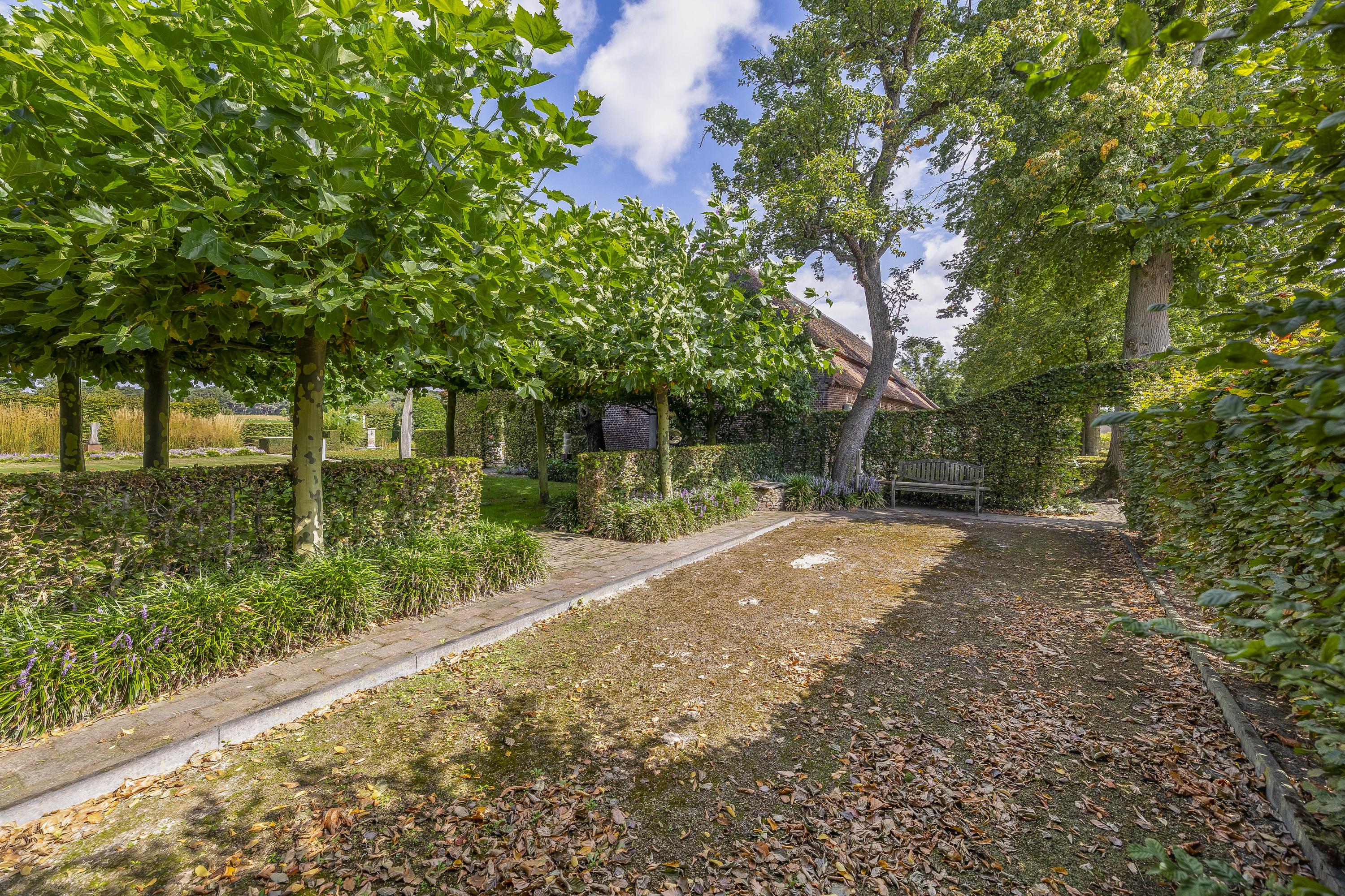 Behind the house and on the sides is a beautifully landscaped garden. On the left side is a nice, spacious area with a lawn, plant borders, old baked clinker paving, and various beech hedges. At the rear, you can enjoy a beautiful view, a large pond (with biological filter), a spacious lawn, plant borders, and mature vegetation. The garden is well laid out and well maintained. There is a double driveway on the right side of the property. The garden even offers the possibility of keeping small animals. There is also a section of the garden with a “lovers' lane.” To the left of the house is a landscaped jeu-de-boules court.