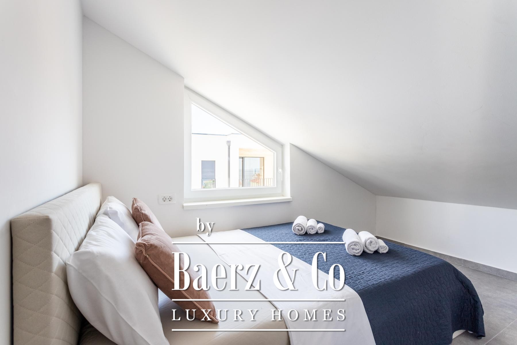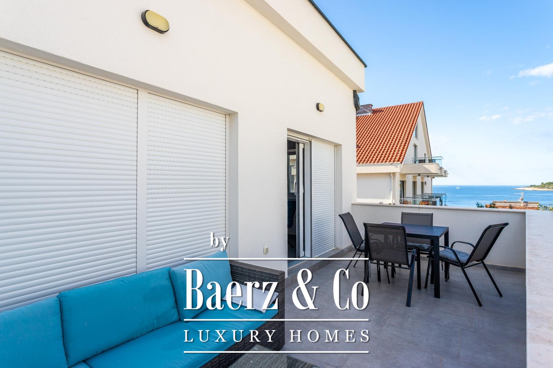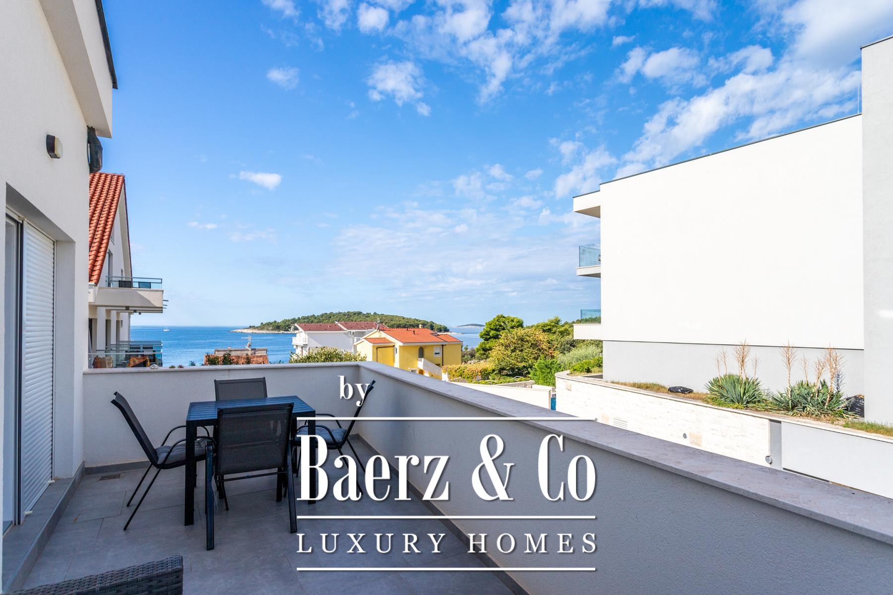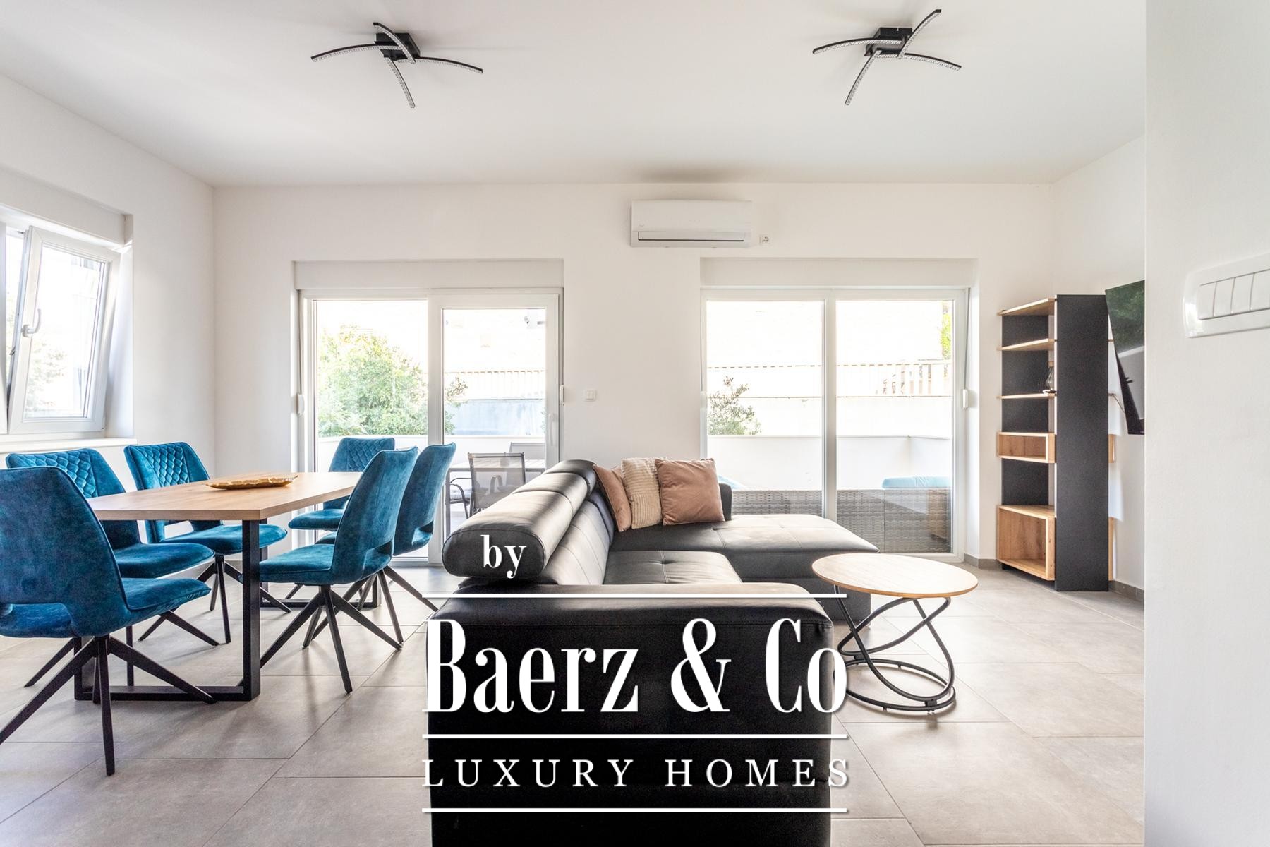 House Rogoznica stands just 90 meters from the Adriatic shore, offering 366.81 m² of considered design across four furnished apartments. This property invites both privacy and versatility, featuring eight bedrooms and eight bathrooms, all arranged to accommodate refined daily living or discreet vacation stays. \n\nThe spatial rhythm flows from a basement with a tailored apartment and four storage rooms, ascending by internal stairs to luminous upper levels. Each apartment consists of a living space with kitchen and dining area, two bedrooms, and a bathroom. Expansive terraces open southward, unveiling sea views that speak to Mediterranean serenity. \n\nBuilt on a compact 207 m² plot in Zečevo, the house is finished to demanding standards and includes three private parking spaces. The setting is quiet, removed from haste, yet the coastline and beaches remain a brief walk away. For those seeking a coastal property with architectural clarity and utility, this house in Rogoznica offers a poised retreat on the Croatian coast.
