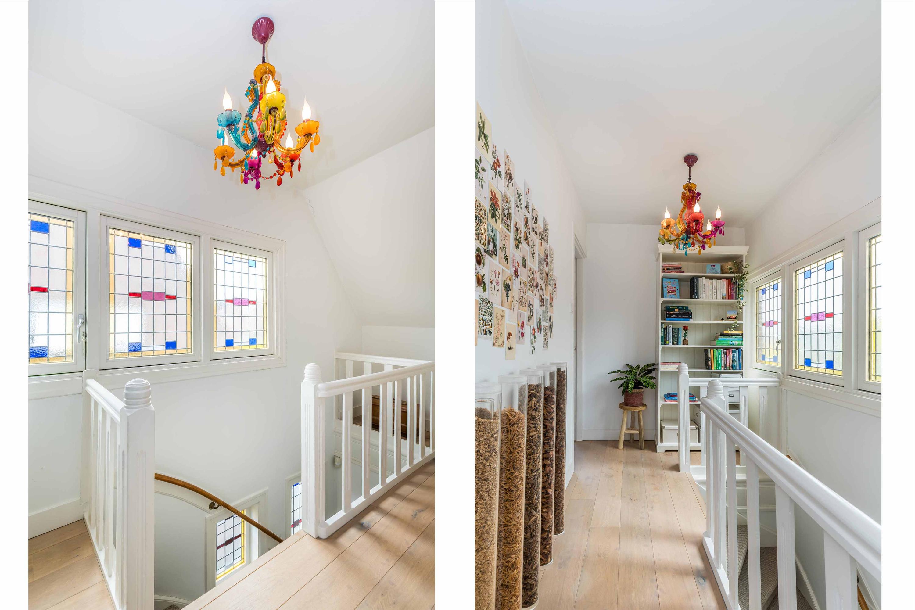 The beautiful spacious kitchen/diner with high ceiling and the nature and child-friendly backyard may be the real eye-catchers, but the house has many more strong plus points and unique selling points. For example, the combination of the preserved authentic details and the applied modern comfort is particularly attractive and atmospheric. The basement with a TV room/chill room/playroom is ideal for families. On the 2 sleeping floors there are 3 spacious bedrooms, 2 with a balcony, 1 with a stylish en suite walk-in closet and 1 with an en suite bathroom. If desired, 2 extra bedrooms can be created on the top floor relatively easily.