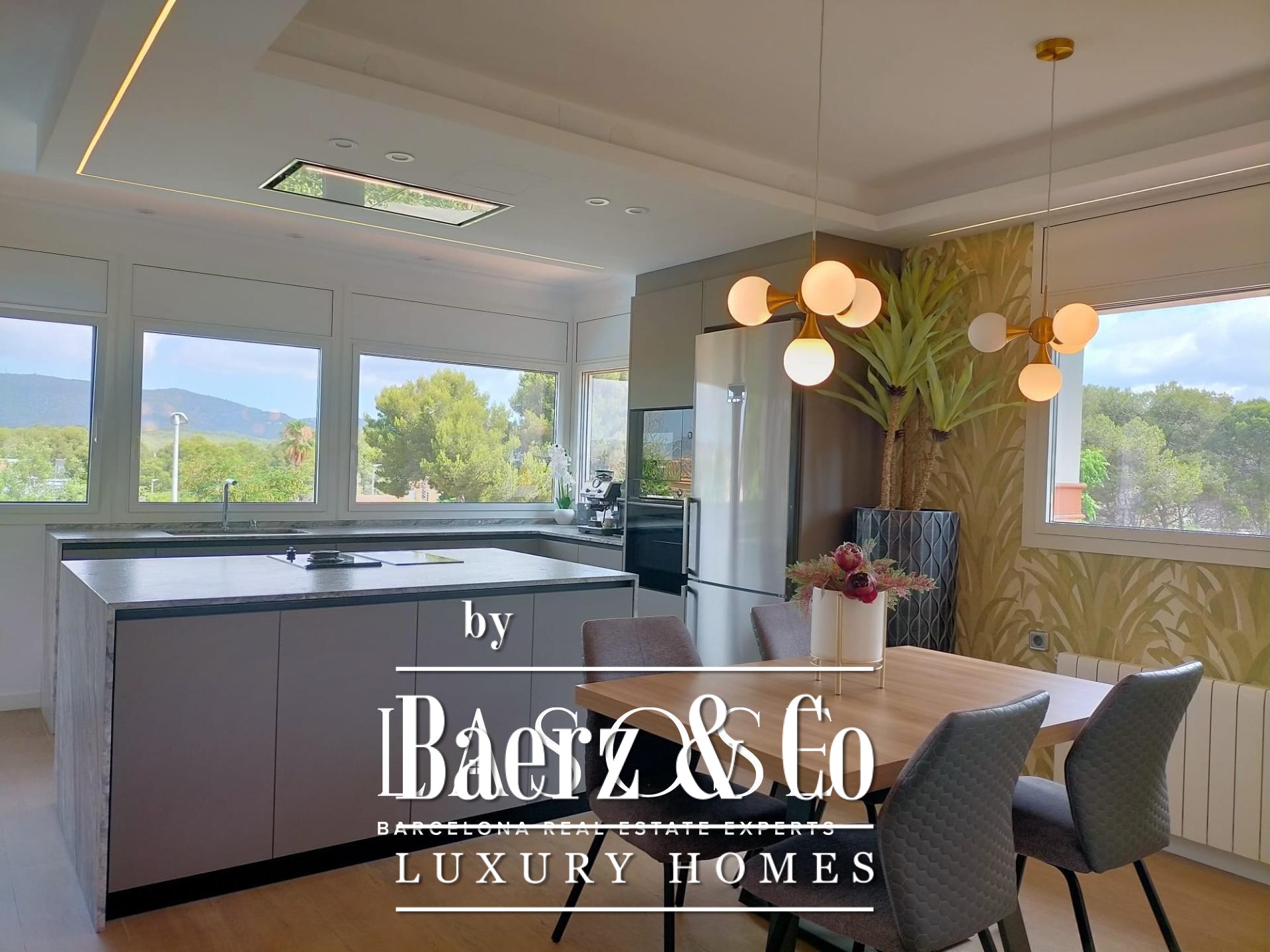 Villa Sant Pere de Ribes is quietly positioned in the esteemed Els Cards residential area, set between Sitges and Sant Pere de Ribes, where privacy and panoramic views define every living moment. This five-bedroom, three-bathroom villa blends traditional Spanish architecture with contemporary refinement. Recently renovated interiors preserve authentic details such as arches and natural textures, while bringing in clean modern lines and warm tones. The open-plan main floor flows across kitchen, dining and living spaces, illuminated by abundant sunlight from windows on two sides. A statement fireplace centers the living area, offering an inviting gathering point year-round.