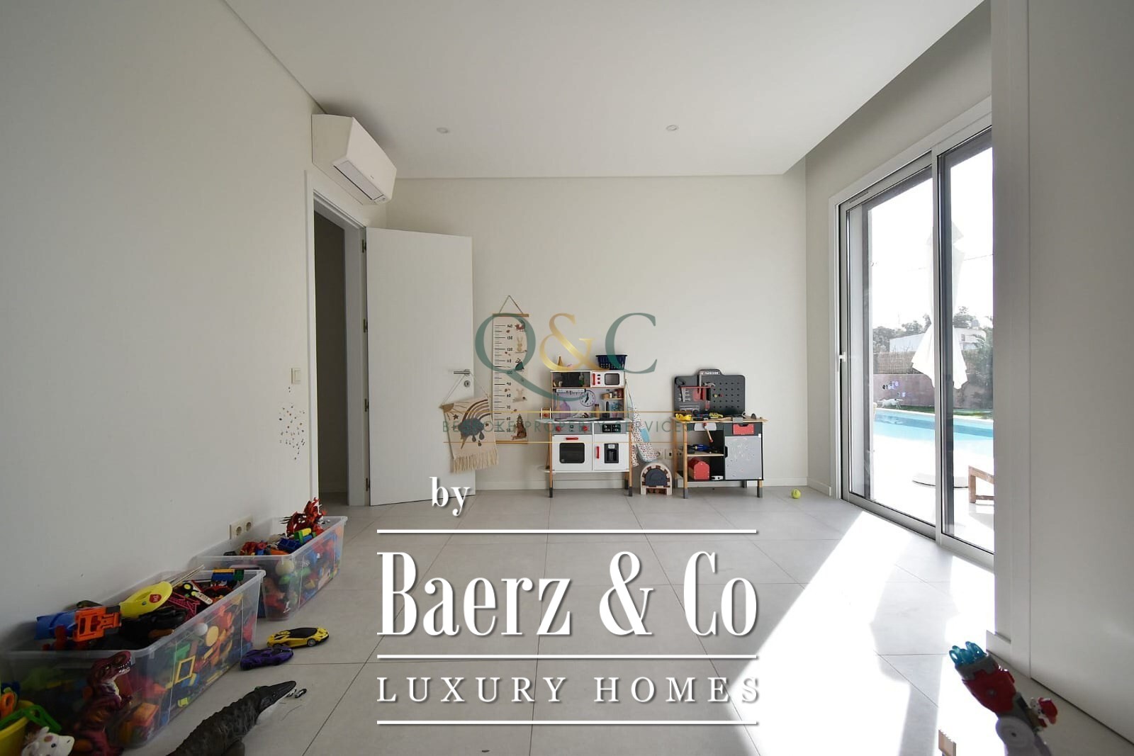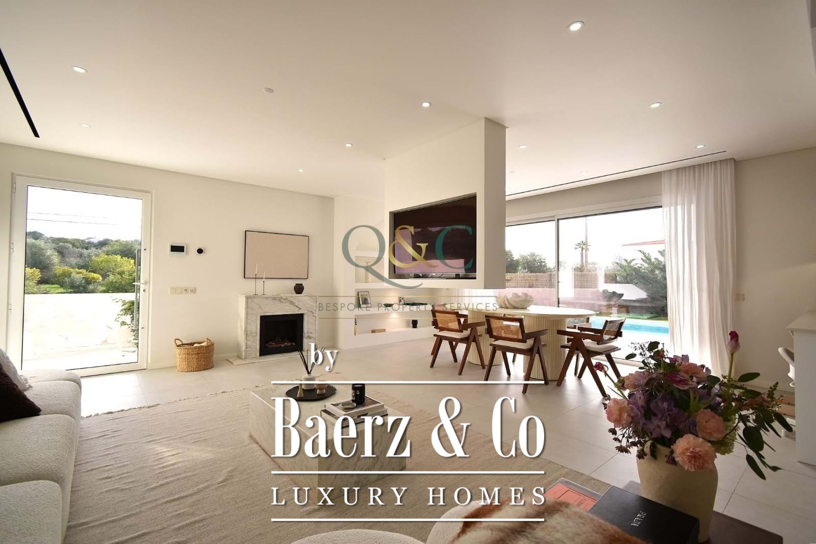 On the ground floor, an open living and dining room with an ethanol marble fireplace creates a soft rhythm between interior space and sunlight, complemented by central air conditioning. The open-plan kitchen, laundry, and pantry support daily living, while the patio invites relaxation beside the chlorine pool and a garden shaped for quiet enjoyment. Almost every room is oriented south and benefits from abundant natural light.