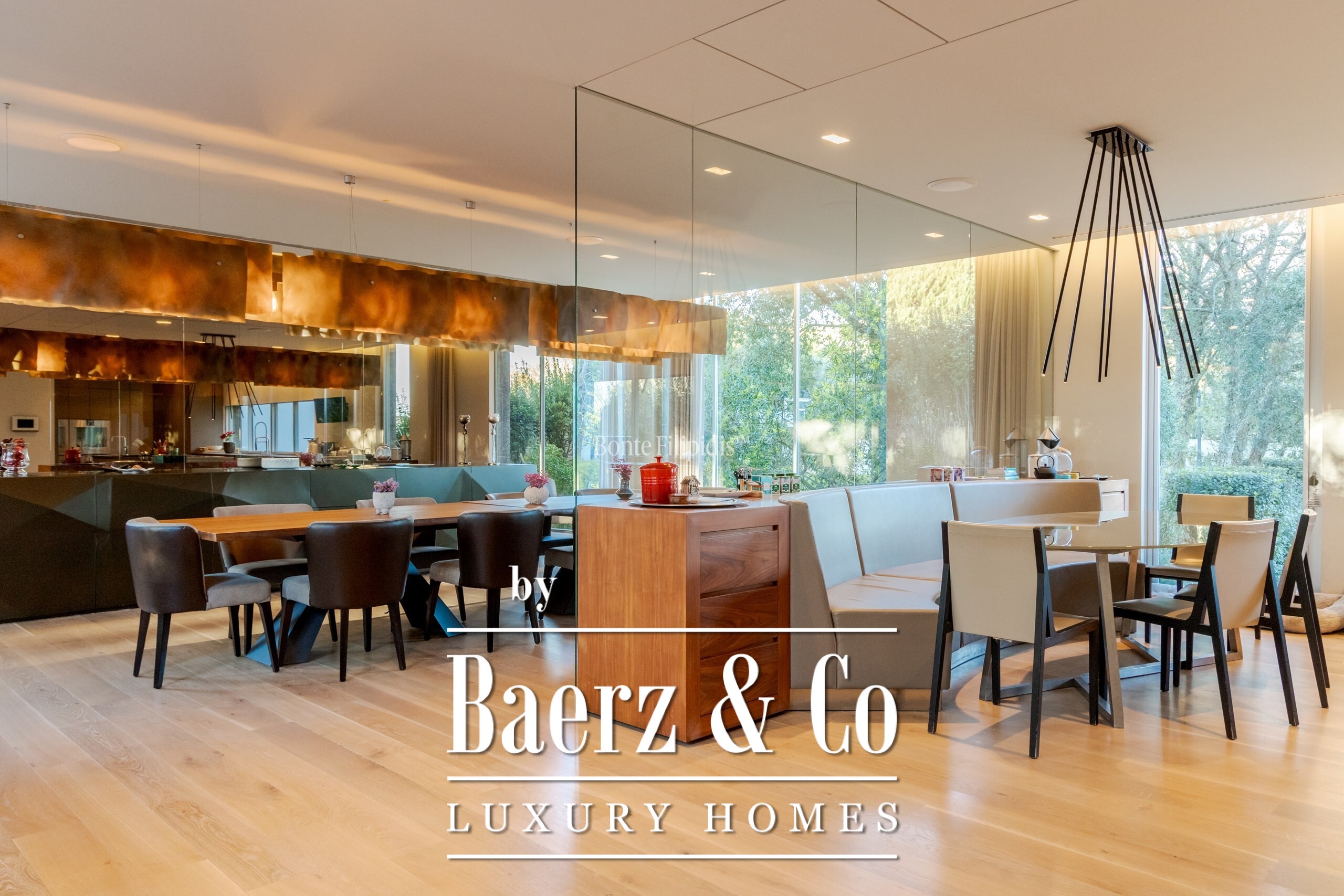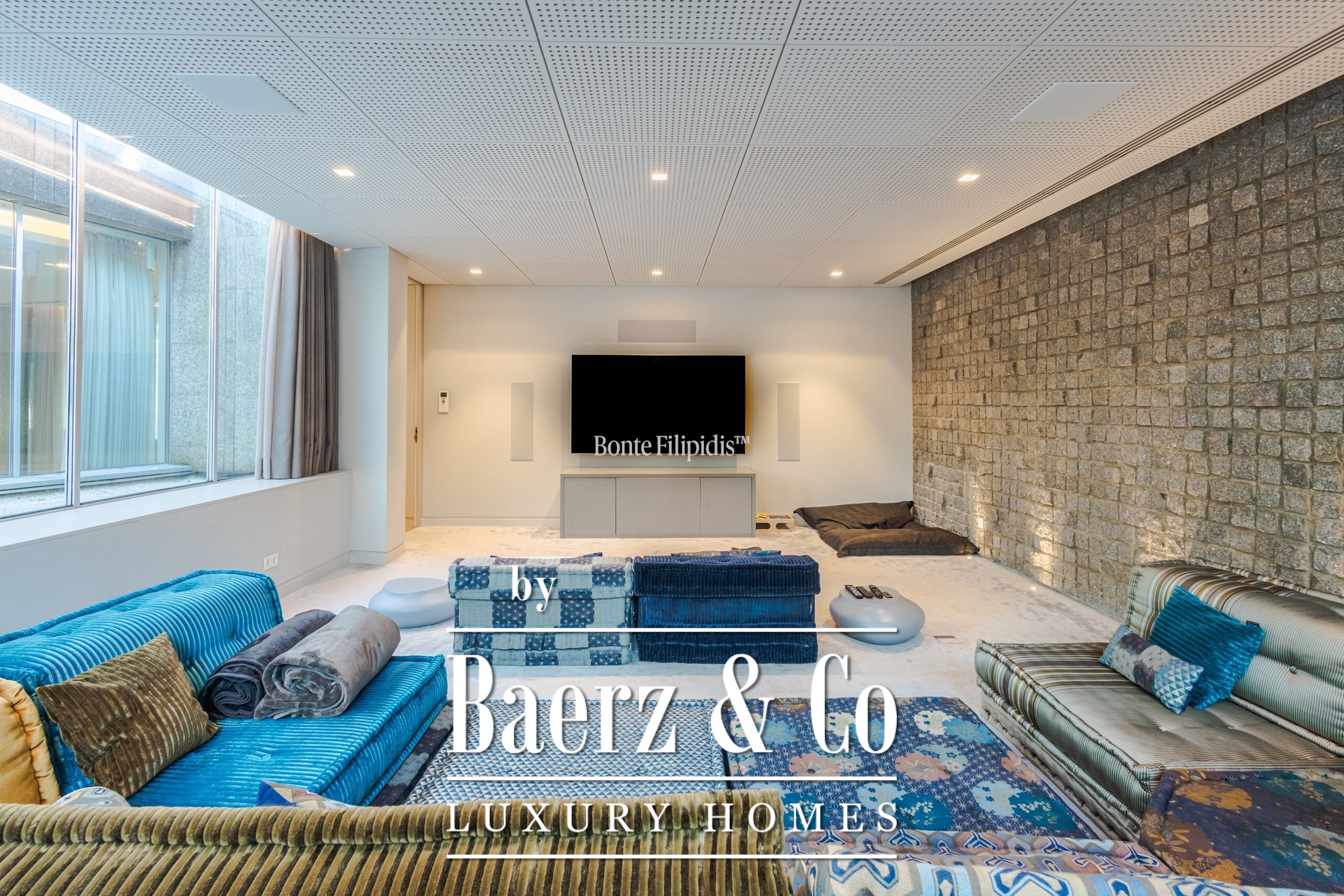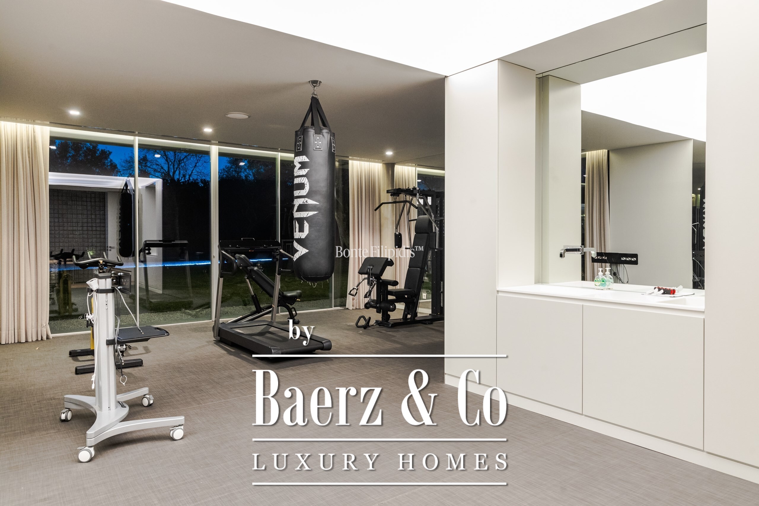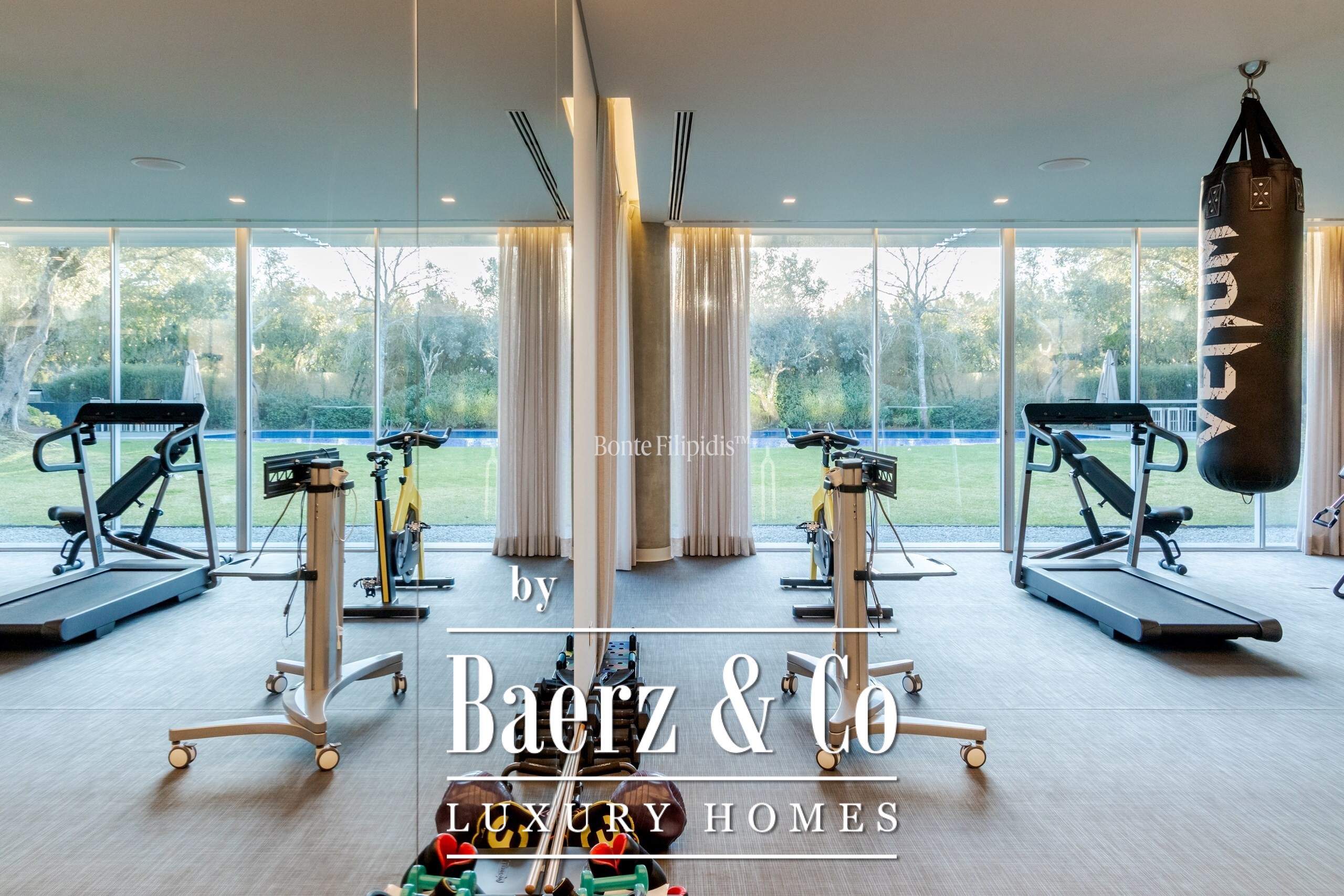 The ground floor features an expansive living area with direct access to the outdoor dining space and barbecue zone. This level also includes a home theater, a fully equipped office overlooking the garden, a state-of-the-art gym, a gourmet kitchen fitted with Gaggenau appliances, and a guest suite.