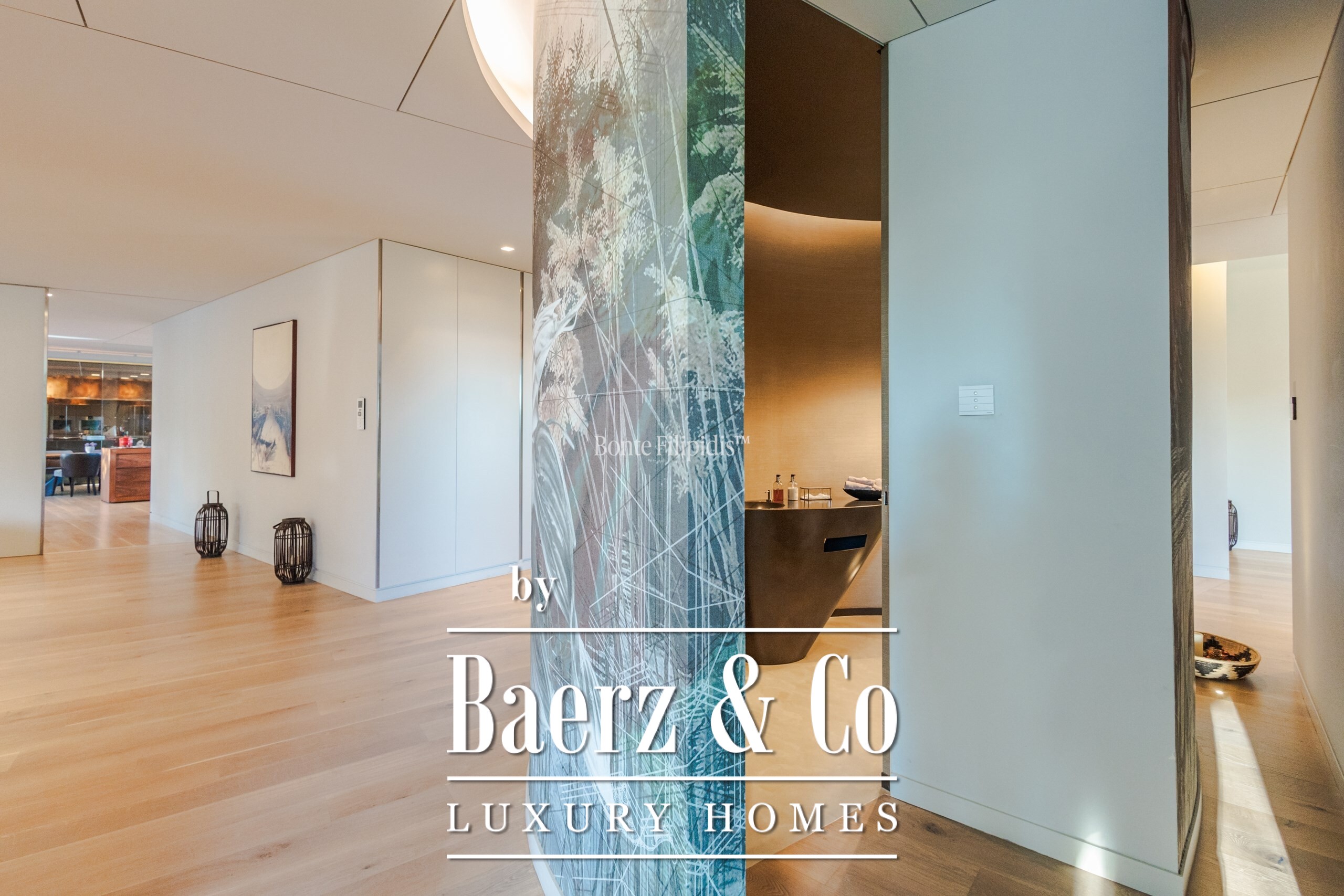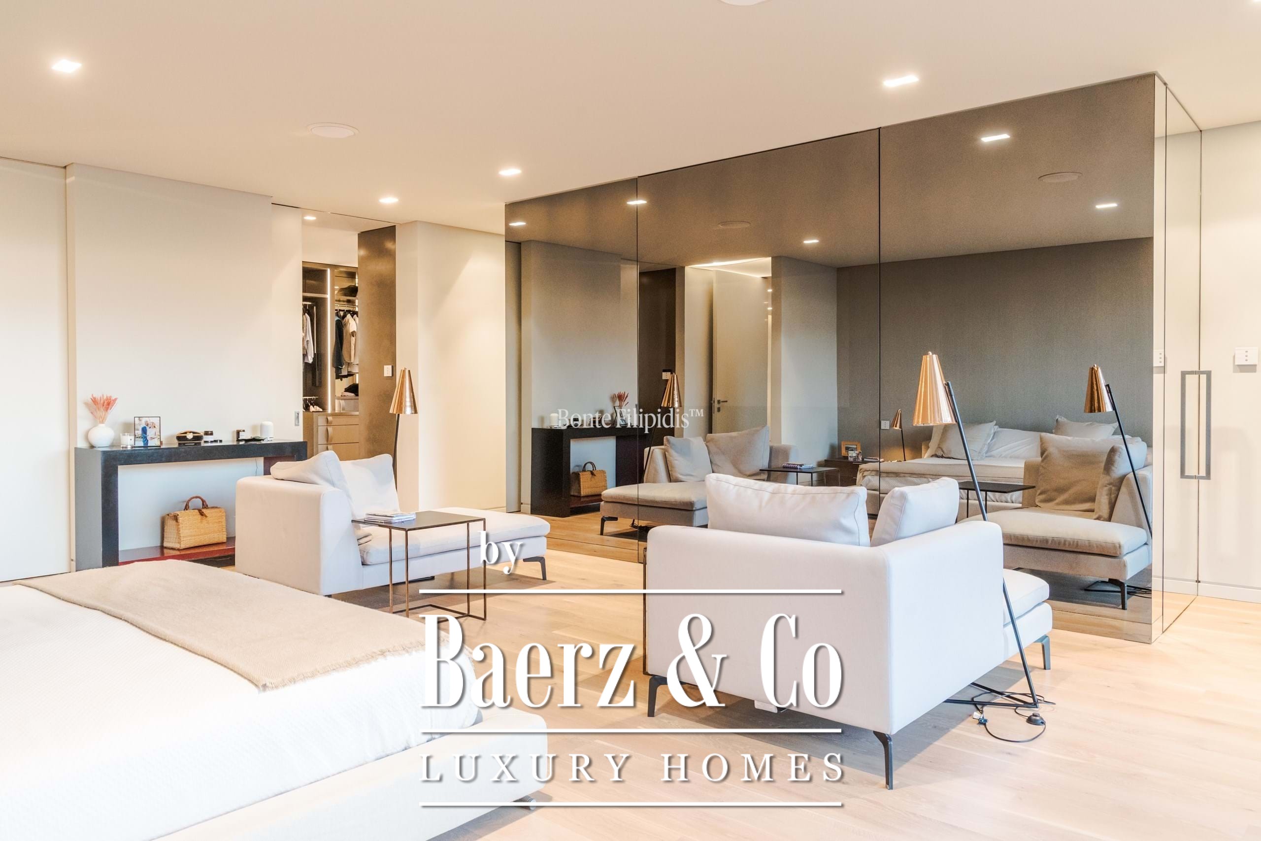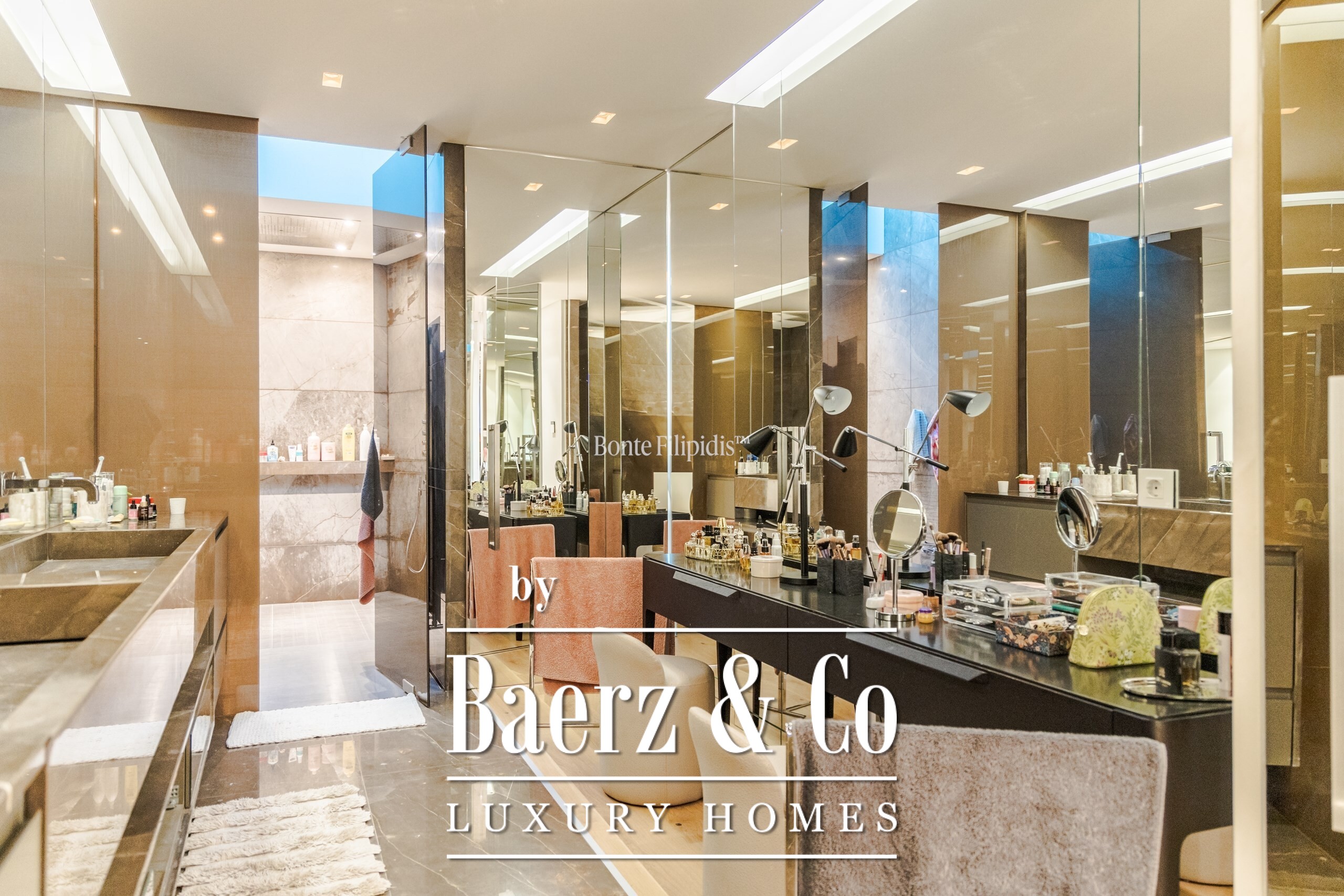 On the first floor, the standout feature is the primary suite, which includes a walk-in closet and a sophisticated bathroom with a ceiling-embedded shower. Four additional en-suite bedrooms complete this floor, each with distinctive finishes.