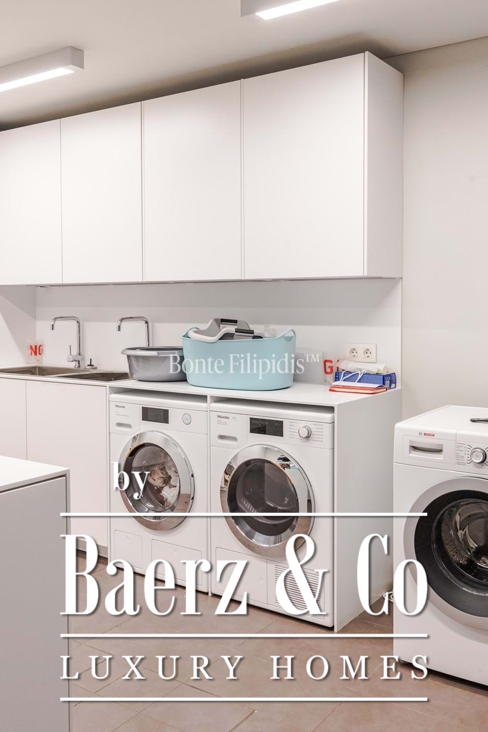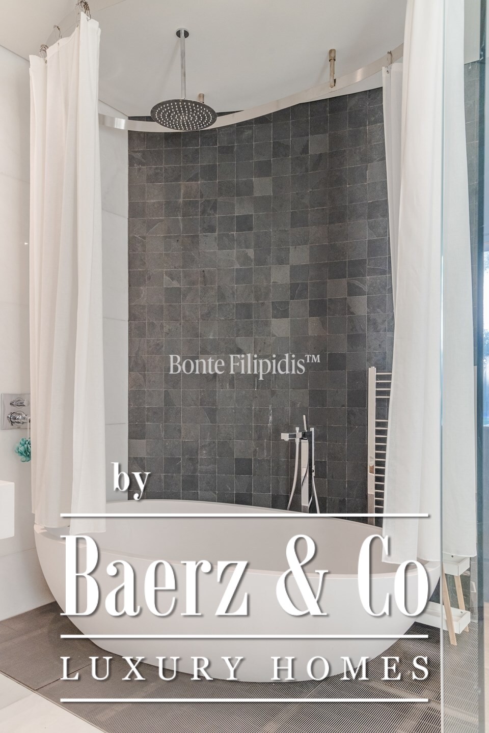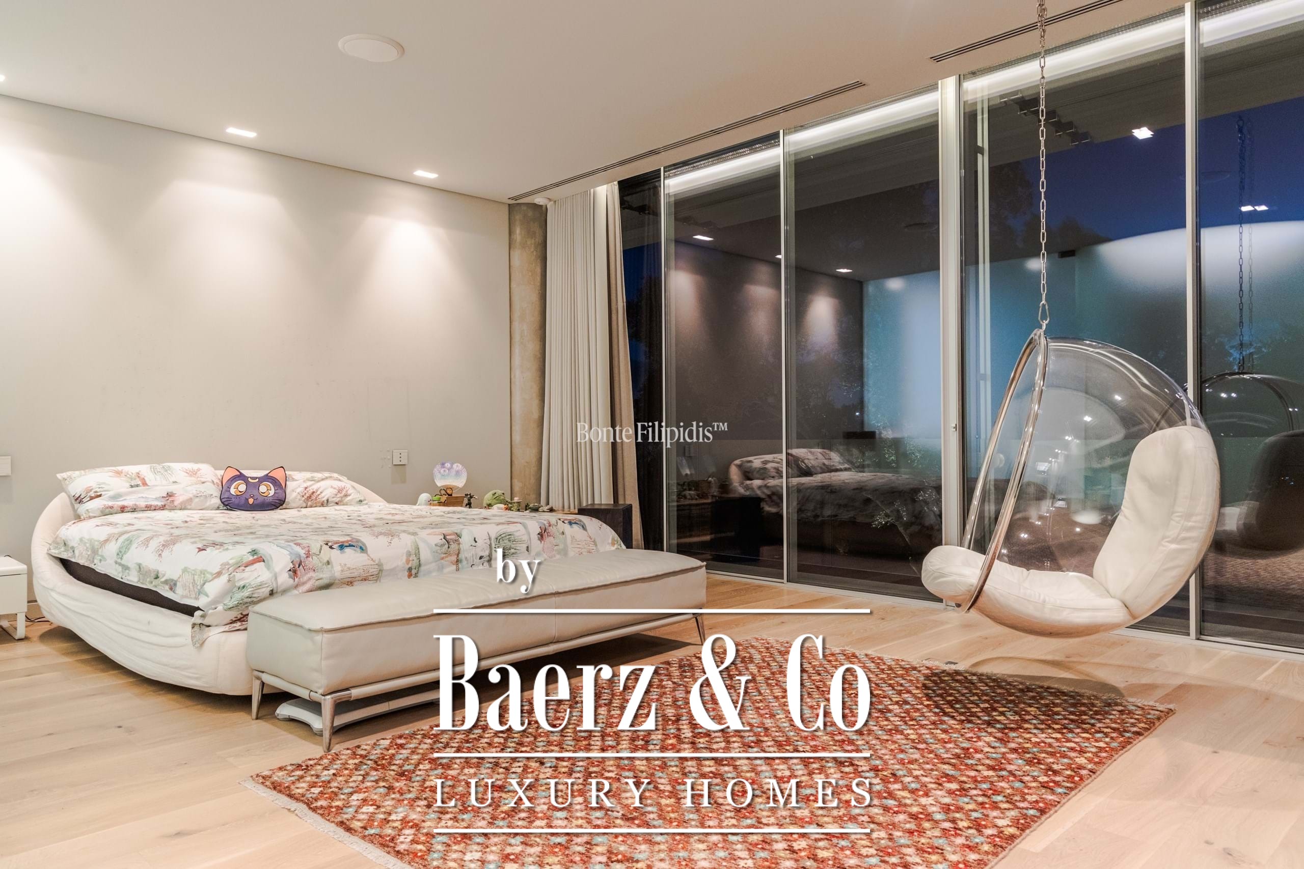 On the first floor, the standout feature is the primary suite, which includes a walk-in closet and a sophisticated bathroom with a ceiling-embedded shower. Four additional en-suite bedrooms complete this floor, each with distinctive finishes.