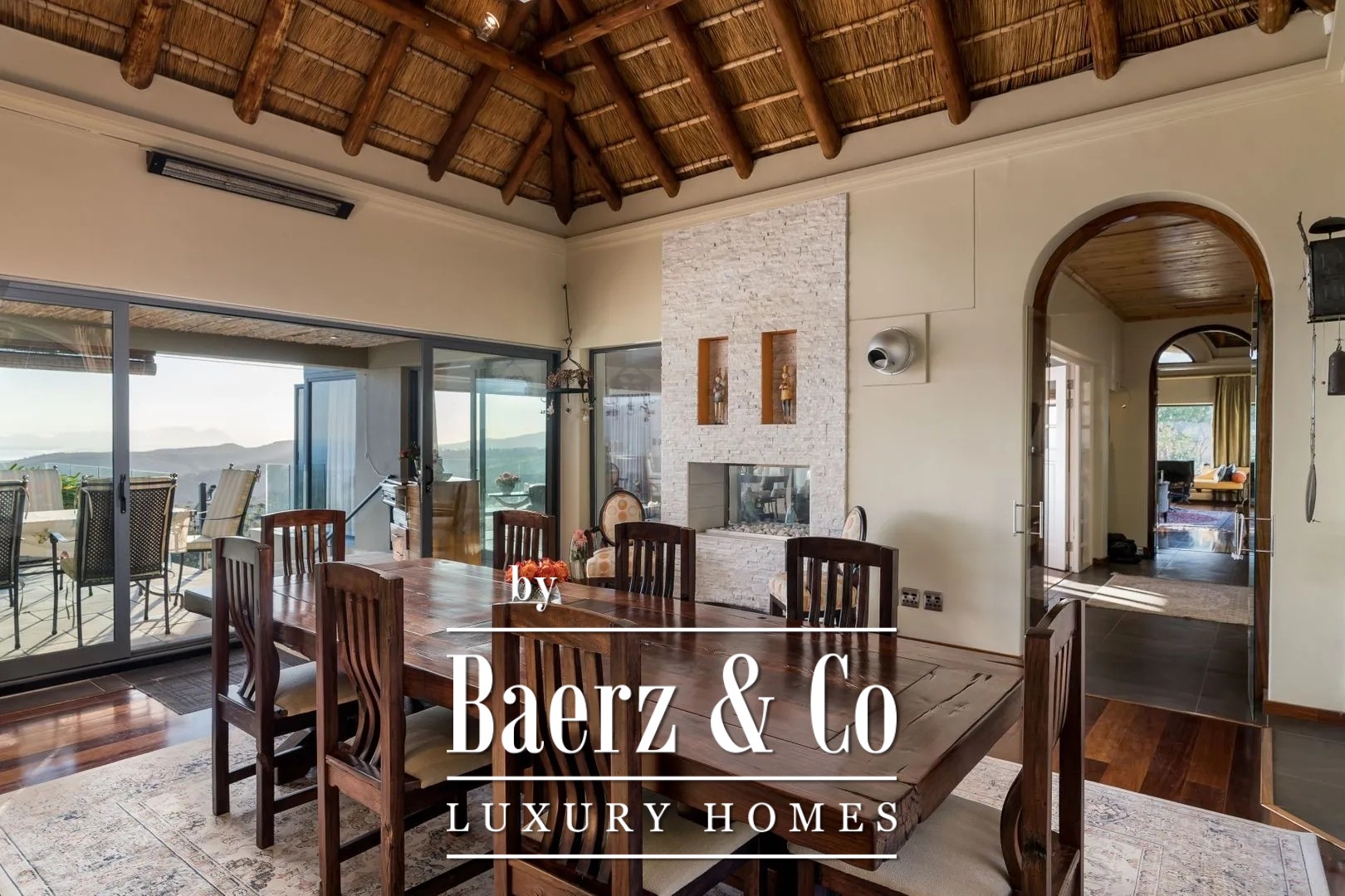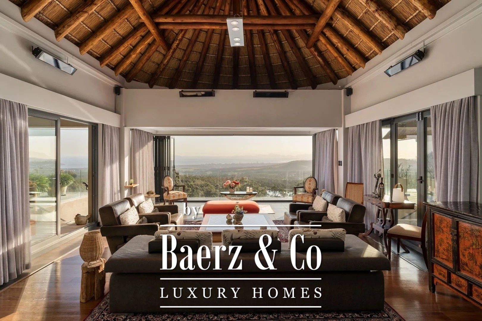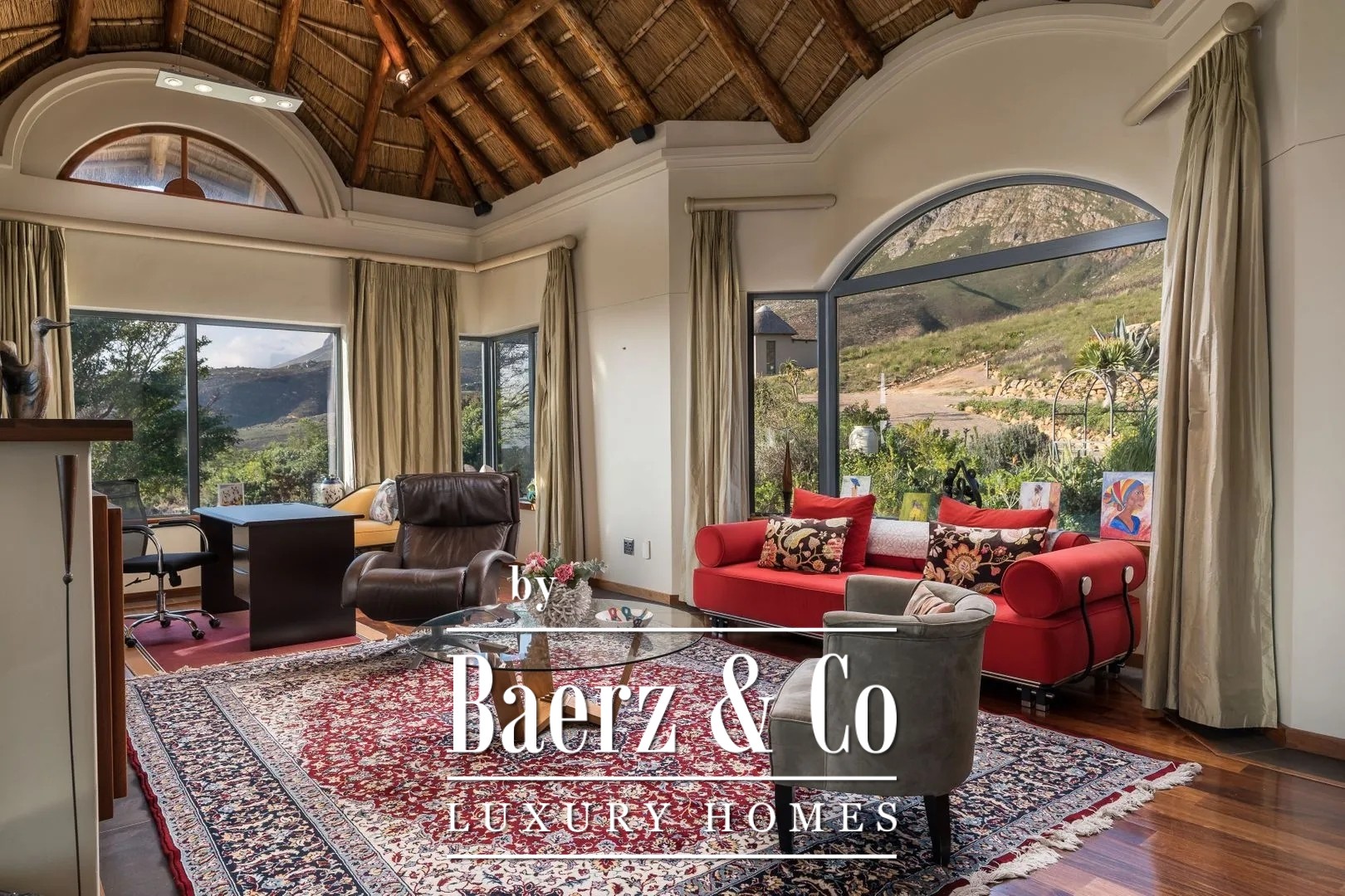 The paved and illuminated driveway on the estate is lined with indigenous proteas. It meanders through the rolling fynbos hills, past the gatehouse, to your rustic home that blends beautifully into the landscape. Tastefully landscaped gardens with small water streams surround the house and merge naturally into the surrounding terrain. Various terraces offer phenomenal views and spectacular skies. The house is designed so that it is seamlessly integrated into the surrounding hillside landscape. The manor house consists of two living levels, each of which—thanks to its position on and against the hill—offers direct access to ground level. Adjacent estates are located at a considerable distance, ensuring optimal privacy.